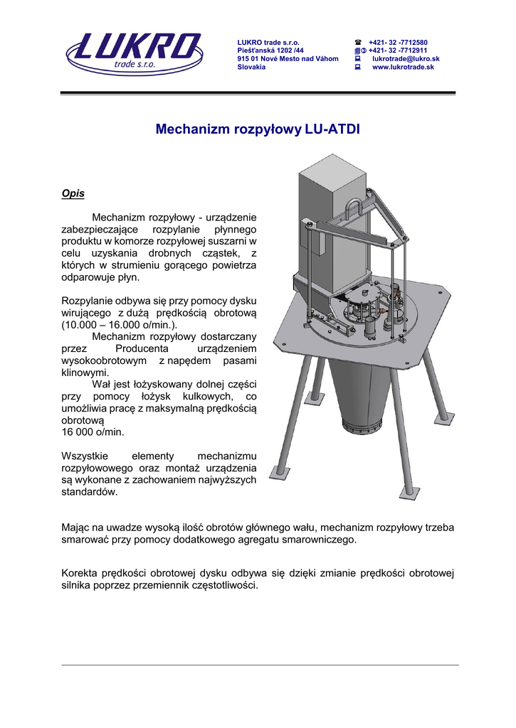 LUKRO trade s.r.o. Piešťanská 1202 /44 915 01 Nové Mesto nad Váhom Slovakia +421- 32 -7712580 +421- 32 -7712911 [email protected] www.lukrotrade.sk Mechanizm rozpyłowy LU-ATDI Opis Mechanizm rozpyłowy - urządzenie zabezpieczające rozpylanie płynnego produktu w komorze rozpyłowej suszarni w celu uzyskania drobnych cząstek, z których w strumieniu gorącego powietrza odparowuje płyn. Rozpylanie odbywa się przy pomocy dysku wirującego z dużą prędkością obrotową (10.000 – 16.000 o/min.). Mechanizm rozpyłowy dostarczany przez Producenta urządzeniem wysokoobrotowym z napędem pasami klinowymi. Wał jest łożyskowany dolnej części przy pomocy łożysk kulkowych, co umożliwia pracę z maksymalną prędkością obrotową 16 000 o/min. Wszystkie elementy mechanizmu rozpyłowowego oraz montaż urządzenia są wykonane z zachowaniem najwyższych standardów. Mając na uwadze wysoką ilość obrotów głównego wału, mechanizm rozpyłowy trzeba smarować przy pomocy dodatkowego agregatu smarowniczego. Korekta prędkości obrotowej dysku odbywa się dzięki zmianie prędkości obrotowej silnika poprzez przemiennik częstotliwości. Lukro trade s.r.o., Piešťanská 1202/44, P.O.BOX 16B, 91501 Nové Mesto nad Váhom, SLOVAKIA tel.: fax: + 421-32-7712580 + 421-32-7712911 e-mail: [email protected] www.lukrotrade.sk Parametry techniczne Wydajność koncentratu (kg / h) maks. 5 000 Obroty dysku Położenie w stosunku do osi dysku rozpylającego 14000 o/min. wertykalne Dysk rozpylający Do suszenia specjalnych produktów (powodujących ścieranie) stosuje się specjalne wykonanie wykonany dysku ze specjalną powłoką. Pokrycie dysku: Grubość Тwardość Odporność chem. 10 m 2000 (metoda Winklera) jak w przypadku tytanu Motor: silnik 30 kW Zestaw: 1. Podstawa rozpylacza 2. Smarownica rozpylacza 3. Chłodnica rozpylacza 4. Elektryka rozpylacza 5. Zestaw montażowy 6. Zestaw części zamiennych