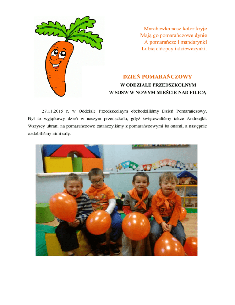 Marchewka nasz kolor kryje Mają go pomarańczowe dynie A pomarańcze i mandarynki Lubią chłopcy i dziewczynki. DZIEŃ POMARAŃCZOWY W ODDZIALE PRZEDSZKOLNYM W SOSW W NOWYM MIEŚCIE NAD PILICĄ 27.11.2015 r. w Oddziale Przedszkolnym obchodziliśmy Dzień Pomarańczowy. Był to wyjątkowy dzień w naszym przedszkolu, gdyż świętowaliśmy także Andrzejki. Wszyscy ubrani na pomarańczowo zatańczyliśmy z pomarańczowymi balonami, a następnie ozdobiliśmy nimi salę. Dzień rozpoczęliśmy od gimnastyki i zabaw ruchowych. Chłopcy z radością pokonywali ustawione przed nimi pomarańczowe przeszkody. Po gimnastyce, dmuchaliśmy przez pomarańczowe słomki na piłkę, która wirowała w powietrzu. W trakcie zajęć dydaktycznych odwiedził nas pomarańczowy miś i głodny pomarańczowy lew. Pomógł on przedszkolakom poznać przedmioty, które są pomarańczowe, takie, które można zjeść, ale także te, którymi bawimy się w ciągu dnia w oddziale przedszkolnym. W dalszej części dnia utrwalaliśmy kolor pomarańczowy przy zabawach z muzyką, które umilały nam piosenki o marchewkach, pomarańczowych dyniach i jesiennych kolorowych parasolkach. W trakcie zabaw ruchowych z twarzy dzieci nie schodził uśmiech. Następnie rozpoczęliśmy zajęcia plastyczne, w trakcie których malowaliśmy farbami pomarańczową marchewkę. Po wyschnięciu farby doklejaliśmy marchewce zieloną natkę. Naszą wspólną pracę zawiesiliśmy na tablicy w oddziale przedszkolnym, tak aby jeszcze długi czas utrwalała nam kolor, który dzisiaj poznaliśmy. Wszyscy bawili się doskonale. Nagrodą za dobrą pracę był słodki poczęstunek, także w kolorze pomarańczowym. Na stole były rozłożone pomarańczowe serwetki, pomarańcze, mandarynki, marchewki oraz mało znane owoce kaki. Ozdobą stołu była piękna dynia. Pyszne owoce chłopcy popijali smacznym pomarańczowym sokiem. Teraz już na pewno nasze przedszkolaki będą wiedziały który kolor to pomarańczowy. Przygotowała: Katarzyna Januszek