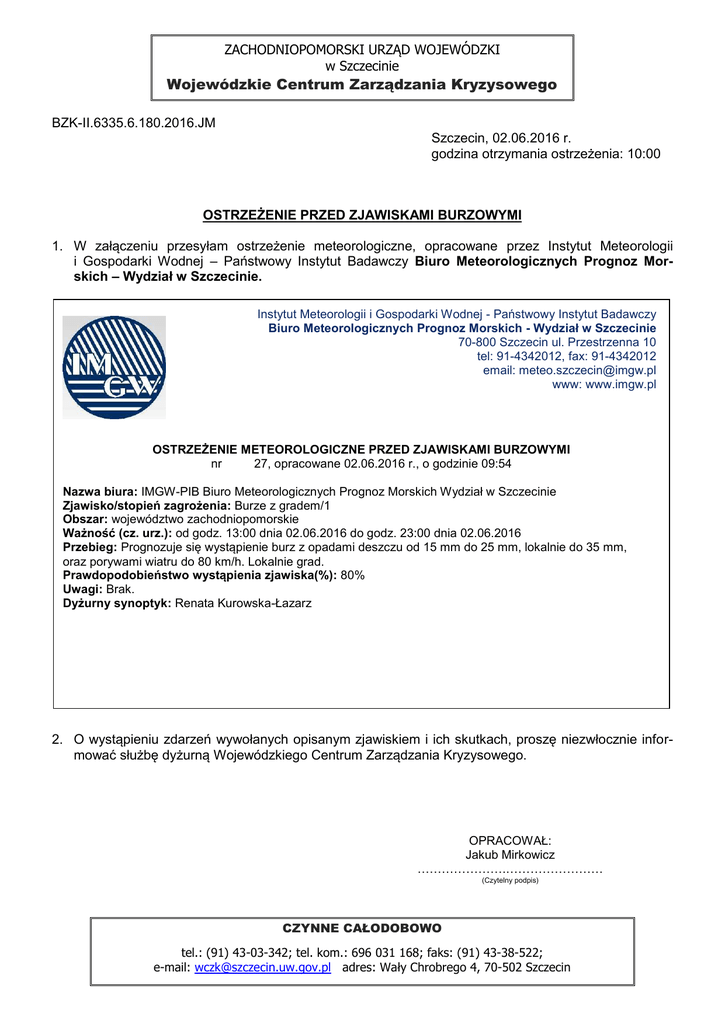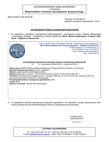ZACHODNIOPOMORSKI URZĄD WOJEWÓDZKI w Szczecinie Wojewódzkie Centrum Zarządzania Kryzysowego BZK-II.6335.6.180.2016.JM Szczecin, 02.06.2016 r. godzina otrzymania ostrzeżenia: 10:00 OSTRZEŻENIE PRZED ZJAWISKAMI BURZOWYMI 1. W załączeniu przesyłam ostrzeżenie meteorologiczne, opracowane przez Instytut Meteorologii i Gospodarki Wodnej – Państwowy Instytut Badawczy Biuro Meteorologicznych Prognoz Morskich – Wydział w Szczecinie. Instytut Meteorologii i Gospodarki Wodnej - Państwowy Instytut Badawczy Biuro Meteorologicznych Prognoz Morskich - Wydział w Szczecinie 70-800 Szczecin ul. Przestrzenna 10 tel: 91-4342012, fax: 91-4342012 email: [email protected] www: www.imgw.pl OSTRZEŻENIE METEOROLOGICZNE PRZED ZJAWISKAMI BURZOWYMI nr 27, opracowane 02.06.2016 r., o godzinie 09:54 Nazwa biura: IMGW-PIB Biuro Meteorologicznych Prognoz Morskich Wydział w Szczecinie Zjawisko/stopień zagrożenia: Burze z gradem/1 Obszar: województwo zachodniopomorskie Ważność (cz. urz.): od godz. 13:00 dnia 02.06.2016 do godz. 23:00 dnia 02.06.2016 Przebieg: Prognozuje się wystąpienie burz z opadami deszczu od 15 mm do 25 mm, lokalnie do 35 mm, oraz porywami wiatru do 80 km/h. Lokalnie grad. Prawdopodobieństwo wystąpienia zjawiska(%): 80% Uwagi: Brak. Dyżurny synoptyk: Renata Kurowska-Łazarz 2. O wystąpieniu zdarzeń wywołanych opisanym zjawiskiem i ich skutkach, proszę niezwłocznie informować służbę dyżurną Wojewódzkiego Centrum Zarządzania Kryzysowego. OPRACOWAŁ: Jakub Mirkowicz ………………….…………………… (Czytelny podpis) CZYNNE CAŁODOBOWO tel.: (91) 43-03-342; tel. kom.: 696 031 168; faks: (91) 43-38-522; e-mail: [email protected] adres: Wały Chrobrego 4, 70-502 Szczecin