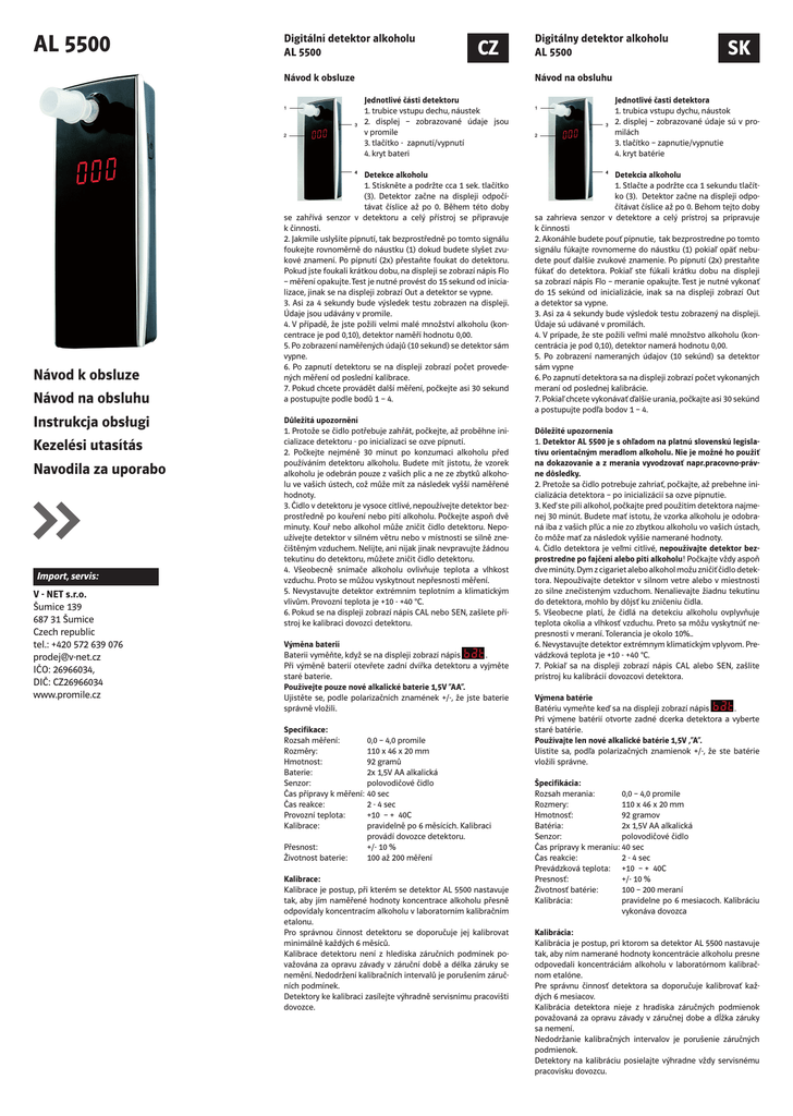 AL 5500 Digitální detektor alkoholu AL 5500 CZ Návod k obsluze Návod k obsluze Návod na obsluhu Instrukcja obsługi Kezelési utasítás Navodila za uporabo Import, servis: V - NET s.r.o. Šumice 139 687 31 Šumice Czech republic tel.: +420 572 639 076 [email protected] IČO: 26966034, DIČ: CZ26966034 www.promile.cz Digitálny detektor alkoholu AL 5500 SK Návod na obsluhu Jednotlivé části detektoru 1. trubice vstupu dechu, náustek 2. displej – zobrazované údaje jsou v promile 3. tlačítko - zapnutí/vypnutí 4. kryt bateri Jednotlivé časti detektora 1. trubica vstupu dychu, náustok 2. displej – zobrazované údaje sú v promilách 3. tlačítko – zapnutie/vypnutie 4. kryt batérie Detekce alkoholu 1. Stiskněte a podržte cca 1 sek. tlačítko (3). Detektor začne na displeji odpočítávat číslice až po 0. Během této doby se zahřívá senzor v detektoru a celý přístroj se připravuje k činnosti. 2. Jakmile uslyšíte pípnutí, tak bezprostředně po tomto signálu foukejte rovnoměrně do náustku (1) dokud budete slyšet zvukové znamení. Po pípnutí (2x) přestaňte foukat do detektoru. Pokud jste foukali krátkou dobu, na displeji se zobrazí nápis Flo – měření opakujte. Test je nutné provést do 15 sekund od inicializace, jinak se na displeji zobrazí Out a detektor se vypne. 3. Asi za 4 sekundy bude výsledek testu zobrazen na displeji. Údaje jsou udávány v promile. 4. V případě, že jste požili velmi malé množství alkoholu (koncentrace je pod 0,10), detektor naměří hodnotu 0,00. 5. Po zobrazení naměřených údajů (10 sekund) se detektor sám vypne. 6. Po zapnutí detektoru se na displeji zobrazí počet provedených měření od poslední kalibrace. 7. Pokud chcete provádět další měření, počkejte asi 30 sekund a postupujte podle bodů 1 – 4. Detekcia alkoholu 1. Stlačte a podržte cca 1 sekundu tlačítko (3). Detektor začne na displeji odpočítávat číslice až po 0. Behom tejto doby sa zahrieva senzor v detektore a celý prístroj sa pripravuje k činnosti 2. Akonáhle budete pouť pípnutie, tak bezprostredne po tomto signálu fúkajte rovnomerne do náustku (1) pokiaľ opäť nebudete pouť ďalšie zvukové znamenie. Po pípnutí (2x) prestaňte fúkať do detektora. Pokiaľ ste fúkali krátku dobu na displeji sa zobrazí nápis Flo – meranie opakujte. Test je nutné vykonať do 15 sekúnd od inicializácie, inak sa na displeji zobrazí Out a detektor sa vypne. 3. Asi za 4 sekundy bude výsledok testu zobrazený na displeji. Údaje sú udávané v promilách. 4. V prípade, že ste požili veľmi malé množstvo alkoholu (koncentrácia je pod 0,10), detektor namerá hodnotu 0,00. 5. Po zobrazení nameraných údajov (10 sekúnd) sa detektor sám vypne 6. Po zapnutí detektora sa na displeji zobrazí počet vykonaných meraní od poslednej kalibrácie. 7. Pokiaľ chcete vykonávať ďalšie urania, počkajte asi 30 sekúnd a postupujte podľa bodov 1 – 4. Důležitá upozornění 1. Protože se čidlo potřebuje zahřát, počkejte, až proběhne inicializace detektoru - po inicializaci se ozve pípnutí. 2. Počkejte nejméně 30 minut po konzumaci alkoholu před používáním detektoru alkoholu. Budete mít jistotu, že vzorek alkoholu je odebrán pouze z vašich plic a ne ze zbytků alkoholu ve vašich ústech, což může mít za následek vyšší naměřené hodnoty. 3. Čidlo v detektoru je vysoce citlivé, nepoužívejte detektor bezprostředně po kouření nebo pití alkoholu. Počkejte aspoň dvě minuty. Kouř nebo alkohol může zničit čidlo detektoru. Nepoužívejte detektor v silném větru nebo v místnosti se silně znečištěným vzduchem. Nelijte, ani nijak jinak nevpravujte žádnou tekutinu do detektoru, můžete zničit čidlo detektoru. 4. Všeobecně snímače alkoholu ovlivňuje teplota a vlhkost vzduchu. Proto se můžou vyskytnout nepřesnosti měření. 5. Nevystavujte detektor extrémním teplotním a klimatickým vlivům. Provozní teplota je +10 - +40 °C. 6. Pokud se na displeji zobrazí nápis CAL nebo SEN, zašlete přístroj ke kalibraci dovozci detektoru. Výměna baterií Baterii vyměňte, když se na displeji zobrazí nápis . Při výměně baterií otevřete zadní dvířka detektoru a vyjměte staré baterie. Používejte pouze nové alkalické baterie 1,5V “AA”. Ujistěte se, podle polarizačních znamének +/-, že jste baterie správně vložili. Specifikace: Rozsah měření: 0,0 – 4,0 promile Rozměry: 110 x 46 x 20 mm Hmotnost: 92 gramů Baterie: 2x 1,5V AA alkalická Senzor: polovodičové čidlo Čas přípravy k měření: 40 sec Čas reakce: 2 - 4 sec Provozní teplota: +10 – + 40C Kalibrace: pravidelně po 6 měsících. Kalibraci provádí dovozce detektoru. Přesnost: +/- 10 % Životnost baterie: 100 až 200 měření Kalibrace: Kalibrace je postup, při kterém se detektor AL 5500 nastavuje tak, aby jím naměřené hodnoty koncentrace alkoholu přesně odpovídaly koncentracím alkoholu v laboratorním kalibračním etalonu. Pro správnou činnost detektoru se doporučuje jej kalibrovat minimálně každých 6 měsíců. Kalibrace detektoru není z hlediska záručních podmínek považována za opravu závady v záruční době a délka záruky se nemění. Nedodržení kalibračních intervalů je porušením záručních podmínek. Detektory ke kalibraci zasílejte výhradně servisnímu pracovišti dovozce. Dôležité upozornenia 1. Detektor AL 5500 je s ohľadom na platnú slovenskú legislatívu orientačným meradlom alkoholu. Nie je možné ho použiť na dokazovanie a z merania vyvodzovať napr.pracovno-právne dôsledky. 2. Pretože sa čidlo potrebuje zahriať, počkajte, až prebehne inicializácia detektora – po inicializácií sa ozve pípnutie. 3. Keď ste pili alkohol, počkajte pred použitím detektora najmenej 30 minút. Budete mať istotu, že vzorka alkoholu je odobraná iba z vašich pľúc a nie zo zbytko
