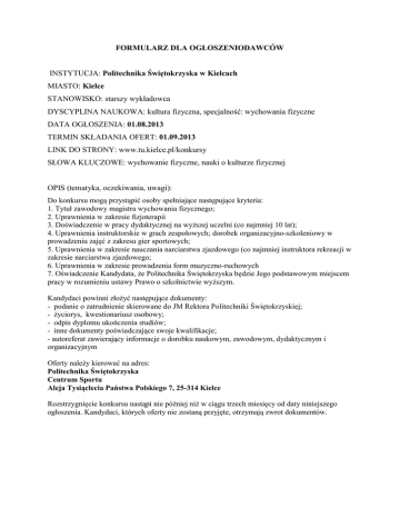 FORMULARZ DLA OGŁOSZENIODAWCÓW INSTYTUCJA: Politechnika Świętokrzyska w Kielcach MIASTO: Kielce STANOWISKO: starszy wykładowca DYSCYPLINA NAUKOWA: kultura fizyczna, specjalność: wychowania fizyczne DATA OGŁOSZENIA: 01.08.2013 TERMIN SKŁADANIA OFERT: 01.09.2013 LINK DO STRONY: www.tu.kielce.pl/konkursy SŁOWA KLUCZOWE: wychowanie fizyczne, nauki o kulturze fizycznej OPIS (tematyka, oczekiwania, uwagi): Do konkursu mogą przystąpić osoby spełniające następujące kryteria: 1. Tytuł zawodowy magistra wychowania fizycznego; 2. Uprawnienia w zakresie fizjoterapii 3. Doświadczenie w pracy dydaktycznej na wyższej uczelni (co najmniej 10 lat); 4. Uprawnienia instruktorskie w grach zespołowych; dorobek organizacyjno-szkoleniowy w prowadzeniu zajęć z zakresu gier sportowych; 5. Uprawnienia w zakresie nauczania narciarstwa zjazdowego (co najmniej instruktora rekreacji w zakresie narciarstwa zjazdowego; 6. Uprawnienia w zakresie prowadzenia form muzyczno-ruchowych 7. Oświadczenie Kandydata, że Politechnika Świętokrzyska będzie Jego podstawowym miejscem pracy w rozumieniu ustawy Prawo o szkolnictwie wyższym. Kandydaci powinni złożyć następujące dokumenty: - podanie o zatrudnienie skierowane do JM Rektora Politechniki Świętokrzyskiej; - życiorys, kwestionariusz osobowy; - odpis dyplomu ukończenia studiów; - inne dokumenty poświadczające swoje kwalifikacje; - autoreferat zawierający informacje o dorobku naukowym, zawodowym, dydaktycznym i organizacyjnym Oferty należy kierować na adres: Politechnika Świętokrzyska Centrum Sportu Aleja Tysiąclecia Państwa Polskiego 7, 25-314 Kielce Rozstrzygnięcie konkursu nastąpi nie później niż w ciągu trzech miesięcy od daty niniejszego ogłoszenia. Kandydaci, których oferty nie zostaną przyjęte, otrzymają zwrot dokumentów.