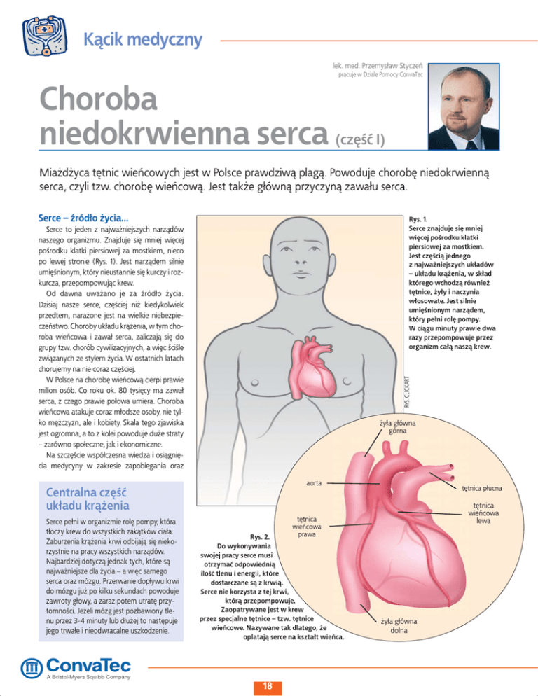Kącik medyczny lek. med. Przemysław Styczeń pracuje w Dziale Pomocy ConvaTec Choroba niedokrwienna serca (część I) Miażdżyca tętnic wieńcowych jest w Polsce prawdziwą plagą. Powoduje chorobę niedokrwienną serca, czyli tzw. chorobę wieńcową. Jest także główną przyczyną zawału serca. Serce – źródło życia... Rys. 1. Serce znajduje się mniej więcej pośrodku klatki piersiowej za mostkiem. Jest częścią jednego z najważniejszych układów – układu krążenia, w skład którego wchodzą również tętnice, żyły i naczynia włosowate. Jest silnie umięśnionym narządem, który pełni rolę pompy. W ciągu minuty prawie dwa razy przepompowuje przez organizm całą naszą krew. RYS. CLICKART Serce to jeden z najważniejszych narządów naszego organizmu. Znajduje się mniej więcej pośrodku klatki piersiowej za mostkiem, nieco po lewej stronie (Rys. 1). Jest narządem silnie umięśnionym, który nieustannie się kurczy i rozkurcza, przepompowując krew. Od dawna uważano je za źródło życia. Dzisiaj nasze serce, częściej niż kiedykolwiek przedtem, narażone jest na wielkie niebezpieczeństwo. Choroby układu krążenia, w tym choroba wieńcowa i zawał serca, zaliczają się do grupy tzw. chorób cywilizacyjnych, a więc ściśle związanych ze stylem życia. W ostatnich latach chorujemy na nie coraz częściej. W Polsce na chorobę wieńcową cierpi prawie milion osób. Co roku ok. 80 tysięcy ma zawał serca, z czego prawie połowa umiera. Choroba wieńcowa atakuje coraz młodsze osoby, nie tylko mężczyzn, ale i kobiety. Skala tego zjawiska jest ogromna, a to z kolei powoduje duże straty – zarówno społeczne, jak i ekonomiczne. Na szczęście współczesna wiedza i osiągnięcia medycyny w zakresie zapobiegania oraz żyła główna górna aorta tętnica płucna Centralna część układu krążenia Serce pełni w organizmie rolę pompy, która tłoczy krew do wszystkich zakątków ciała. Zaburzenia krążenia krwi odbijają się niekorzystnie na pracy wszystkich narządów. Najbardziej dotyczą jednak tych, które są najważniejsze dla życia – a więc samego serca oraz mózgu. Przerwanie dopływu krwi do mózgu już po kilku sekundach powoduje zawroty głowy, a zaraz potem utratę przytomności. Jeżeli mózg jest pozbawiony tlenu przez 3-4 minuty lub dłużej to następuje jego trwałe i nieodwracalne uszkodzenie. tętnica wieńcowa lewa tętnica wieńcowa prawa Rys. 2. Do wykonywania swojej pracy serce musi otrzymać odpowiednią ilość tlenu i energii, które dostarczane są z krwią. Serce nie korzysta z tej krwi, którą przepompowuje. Zaopatrywane jest w krew przez specjalne tętnice – tzw. tętnice wieńcowe. Nazywane tak dlatego, że oplatają serce na kształt wieńca. 18 żyła główna dolna leczenia chorób serca pozwalają na bardzo skuteczne przeciwdziałanie bezpośrednim, a także późniejszym, ich skutkom. Co więcej – nieustannie dokonuje się szybki postęp w tej dziedzinie. Od nas samych zależy, czy będziemy chcieli wykorzystać najnowsze osiągnięcia… ... najdoskonalsza pompa Serce jest centralną częścią układu krążenia. Pełni rolę pompy, która tłoczy krew naczyniami tętniczymi do wszystkich narządów i tkanek całego ciała.Tam, w drobniutkich naczyniach zwanych włosowatymi, krew oddaje tkankom tlen i substancje odżywcze i zbiera z nich szkodliwe produkty przemiany materii. Naczyniami żylnymi wraca do serca. Stąd jest pompowana do płuc i nasycana tlenem. Z płuc wraca do serca i, zataczając koło, płynie z powrotem do tkanek. Tlen, przenoszony przez krew, jest niezbędny do życia każdej pojedynczej komórki. Pracowity narząd Serce jest stosunkowo niewielkim, ale za to bardzo pracowitym narządem. Ma wielkość pięści i waży ok. pół kilograma. W ciągu 70 lat naszego życia kurczy się ok. 2,5 miliarda razy, przepompowuje 300 milionów litrów krwi i wykonuje taką samą pracę, jaka byłaby potrzebna do podniesienia dużego pociągu na wysokość 5 km. cy bez dopływu tlenu. Dlatego musi być nieustannie i na bieżąco w niego zaopatrywany. Serce, którego ciężar stanowi ok. 0,4% masy naszego ciała, wykorzystuje aż 5% krążącej w nas krwi. Jest to 10 razy więcej niż ma do swojej dyspozycji „przeciętny” narząd. Dodatkowo serce, podobnie jak mózg, ma pierwszeństwo w zaopatrzeniu w krew. Oznacza to, że jeżeli dzieje się coś złego z układem krążenia (np. tracimy krew w wyniku silnego krwawienia), to z dostawy krwi wyłączane są najpierw inne narządy, a dopiero na samym końcu serce i mózg. Ich praca nie może ustać ani na chwilę, bo to oznacza śmierć. W zdrowym sercu działają bardzo precyzyjne mechanizmy dopasowujące wielkość przepływu krwi w naczyniach wieńcowych do aktualnych jego potrzeb.W trakcie wysiłku fizycznego (spacer, marsz, jazda na rowerze, sprzątanie) lub emocjonalnego (zdenerwowanie, kłótnia, stres) ilość dostarczanej sercu krwi musi być większa niż w spoczynku. Dlatego naczynia wieńcowe ulegają znacznemu poszerzeniu a ciśnienie krwi rośnie. Gdy odpoczywamy (śpimy, oglądamy telewizję), ilość krwi płynąca przez naczynia wieńcowe może być mniejsza, bo zapotrzebowanie na nią nie jest duże. Wtedy naczynia wieńcowe mają normalną, „spoczynkową” średnicę. ... narząd, który choruje Zaburzenia krążenia krwi mają niekorzystny wpływ na każdy narząd, ale w największym stopniu mogą spowodować uszkodzenie tych najważniejszych – serca i mózgu. Przerwanie dopływu krwi do mózgu na około 5 sekund, powoduje zawroty głowy, a po 10-20 sekundach utratę przytomności. Jeżeli przerwa w dostawie tlenu trwa dłużej niż 3-4 minuty, to następuje jego nieodwracalne uszkodzenie. Istotą choroby niedokrwiennej serca (czyli inaczej: choroby wieńcowej) jest pogorszenie przepływu krwi przez tętnice wieńcowe i niedostateczne zaopatrzenie serca w tlen w stosunku do potrzeb. Przyczyną tego jest najczę