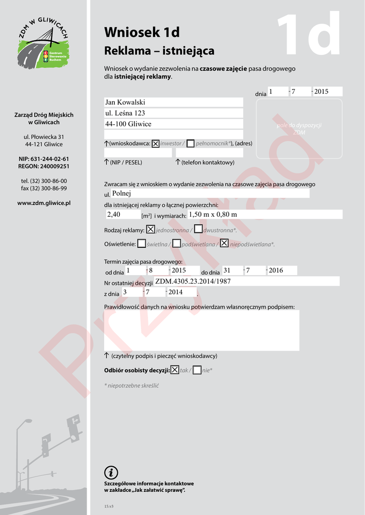 1d Zarząd Dróg Miejskich w Gliwicach Wniosek 1d Reklama – istniejąca Wniosek o wydanie zezwolenia na czasowe zajęcie pasa drogowego dla istniejącej reklamy. ul. Płowiecka 31 44-121 Gliwice (wnioskodawca: tel. (32) 300-86-00 fax (32) 300-86-99 www.zdm.gliwice.pl ¯7 ¯ 2015 pole do dyspozycji ZDM inwestor / pełnomocnik*), (adres) (NIP / PESEL) (telefon kontaktowy) Zwracam się z wnioskiem o wydanie zezwolenia na czasowe zajęcia pasa drogowego ul. Polnej ła NIP: 631-244-02-61 REGON: 240009251 1 d Zarząd Dróg Miejskich w Gliwicach Jan Kowalski ul. Leśna 123 44-100 Gliwice dnia dla istniejącej reklamy o łącznej powierzchni: 2,40 [m2] i wymiarach: 1,50 m x 0,80 m Rodzaj reklamy: świetlna / dwustronna*. podświetlana / niepodświetlana*. zy k Oświetlenie: jednostronna / Termin zajęcia pasa drogowego: od dnia 1 ¯8 ¯ 2015 do dnia 31 ¯7 ¯ 2016 ZDM.4305.23.2014/1987 ¯7 ¯ 2014 . Nr ostatniej decyzji z dnia 3 Pr Prawidłowość danych na wniosku potwierdzam własnoręcznym podpisem: (czytelny podpis i pieczęć wnioskodawcy) Odbiór osobisty decyzji: tak / * niepotrzebne skreślić i Szczegółowe informacje kontaktowe w zakładce „Jak załatwić sprawę”. 15.v3 nie* 1d Zarząd Dróg Miejskich w Gliwicach JAK ZAŁATWIĆ SPRAWĘ NIP: 631-244-02-61 REGON: 240009251 tel. (32) 300-86-00 fax (32) 300-86-99 Artur Gałązka – Główny Specjalista PARTER – STREFA ŻÓŁTA pokój nr 7 tel. (32) 300-86-17 Anna Górska – Inspektor pokój nr 7 PARTER – STREFA ŻÓŁTA tel. (32) 300-86-18 3. Opłaty: – złożenie wniosku oraz wydanie zezwolenia nie podlega opłacie skarbowej (zwolnione na podstawie części III ust. 44 kol. 4 pkt 9 załącznika do ustawy o opłacie skarbowej), – za zajęcie pasa ruchu drogowego naliczane są opłaty zgodnie z obowiązującymi Uchwałami, – gdy wniosek składa pełnomocnik należy dołączyć pełnomocnictwo w oryginale lub urzędowo poświadczony odpis pełnomocnictwa i opłatę skarbową w wysokości 17 zł. Opłaty skarbowe należy wpłacić na konto Urzędu Miejskiego w Gliwicach: ING 51 1050 0099 5261 0410 0000 0055 lub w kasie Urzędu Miejskiego w Gliwicach (art. 1 ust. 1 pkt. 2 ustawy o opłacie skarbowej z dnia 16.11.2006 r. Dz.U. z 2006 r. Nr 225 poz.1635). Pr zy k www.zdm.gliwice.pl d ul. Płowiecka 31 44-121 Gliwice 2. Jak i gdzie załatwić sprawę: – wypełniony wniosek należy złożyć w ZDM w Gliwicach lub przesłać pocztą, – wniosek składa wnioskodawca, inwestor lub pełnomocnik, – decyzja zostaje wysłana pocztą (na wniosku jest możliwość zaznaczenia odbioru osobistego), – informacji udziela: Referat reklam, odszkodowań komunikacyjnych: ła Zarząd Dróg Miejskich w Gliwicach 1. O czym należy wiedzieć: – zajęcie pasa drogowego pod reklamę wymaga zgody ZDM w Gliwicach, – wnioski są rozpatrywane zgodnie z datą ich wpływu do ZDM w Gliwicach, wnioski, w których brakuje wymaganych załączników będą rozpatrzone dopiero po ich uzupełnieniu, o czym osoby składające wniosek zostaną poinformowane pismem, – w celu uzyskania zgody na zajęcie pasa drogowego dla istniejącej już reklamy składamy wniosek nr 1d o wydanie decyzji dla ist-niejącej reklamy.
