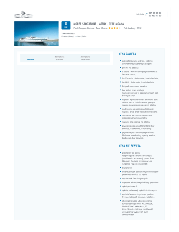 Infolinia 8 MORZE ŚRÓDZIEMNE - ATENY - TERE MOANA DNI Paul Gauguin Cruises - Tere Moana 801 08 08 03 22 492 77 90 | Rok budowy: 2012 TRASA REJSU: Piraeus (Ateny) TERMIN Itea (Delfy) Zewnętrzna Zewnętrzna z oknem z balkonem CENA ZAWIERA zakwaterowanie w 2-os. kabinie zewnętrznej wybranej kategorii posiłki na statku: L'Etoile - kuchnia międzynarodowa a la carte menu, La Veranda - śniadanie, lunch buffets, Le Grill - śniadanie, lunch buffets 24-godzinny room service bar setup oraz obsługa kamerdynerska w apartamentach cat. B i wyższych napoje: wybrane wina i alkohole, soft drinks, woda butelkowana, gorące napoje serwowane na całym statku codziennie uzupełniana lodówka: napoje, piwo oraz woda butelkowana udział we wszystkie imprezach organizowanych na statku napiwki dla obsługi na statku prywatna plaża na Bora Bora: bar service, siatkówka, snorkeling prywatna plaża na wysepce Motu Mahana: snorkeling, sporty wodne, barbecue, bar service. CENA NIE ZAWIERA przelotów do portu rozpoczęcia/zakończenia rejsu (możliwośc rezerwacji przez Paul Gauguin Cruises przelotów Los Angeles-Papeete i powrót) transferów ewentualnych dodatkowych noclegów przed rejsem lub po rejsie wycieczek fakultatywnych napojów alkoholowych klasy premium opłat portowych opłaty paliwowej, opłat lotniskowych wydatków osobistych np. pralnia, fryzjer, fotograf, internet, telefon... obowiązkowego ubezpieczenia turystycznego (min. KL-30000€, NNW-3000€: składka 1,27 €/os./dzień) - istnieje możliwość wykupienia wyższych sum ubezpieczeń