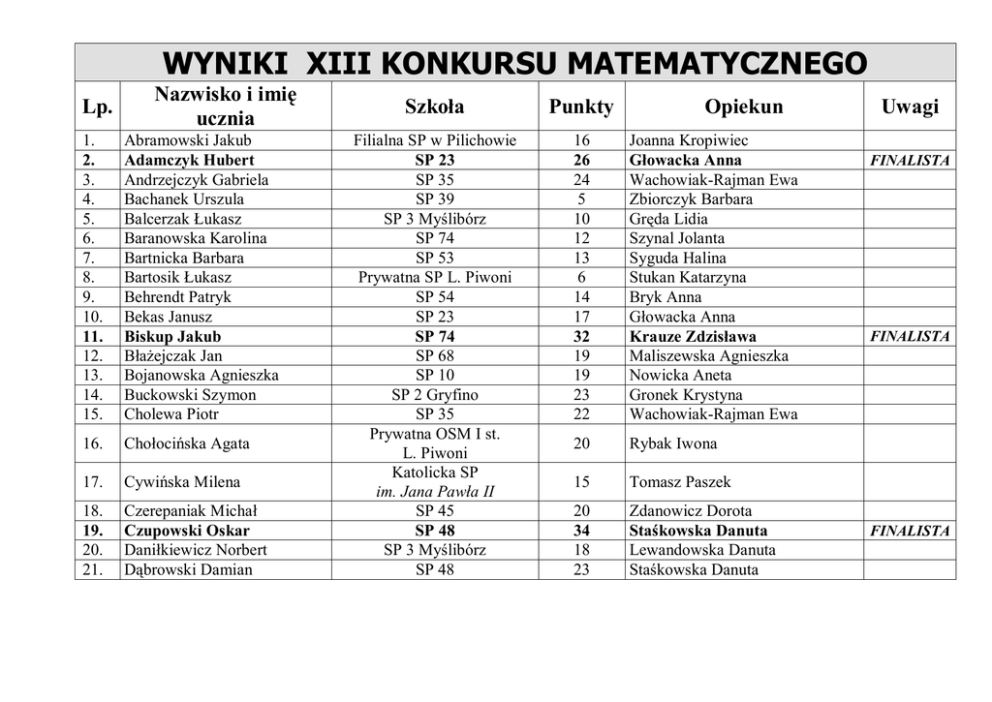 WYNIKI XIII KONKURSU MATEMATYCZNEGO Lp. Nazwisko i imię ucznia 1. 2. 3. 4. 5. 6. 7. 8. 9. 10. 11. 12. 13. 14. 15. Abramowski Jakub Adamczyk Hubert Andrzejczyk Gabriela Bachanek Urszula Balcerzak Łukasz Baranowska Karolina Bartnicka Barbara Bartosik Łukasz Behrendt Patryk Bekas Janusz Biskup Jakub Błażejczak Jan Bojanowska Agnieszka Buckowski Szymon Cholewa Piotr 16. Chołocińska Agata 17. Cywińska Milena 18. 19. 20. 21. Czerepaniak Michał Czupowski Oskar Daniłkiewicz Norbert Dąbrowski Damian Szkoła Punkty Filialna SP w Pilichowie SP 23 SP 35 SP 39 SP 3 Myślibórz SP 74 SP 53 Prywatna SP L. Piwoni SP 54 SP 23 SP 74 SP 68 SP 10 SP 2 Gryfino SP 35 Prywatna OSM I st. L. Piwoni Katolicka SP im. Jana Pawła II SP 45 SP 48 SP 3 Myślibórz SP 48 16 26 24 5 10 12 13 6 14 17 32 19 19 23 22 Joanna Kropiwiec Głowacka Anna Wachowiak-Rajman Ewa Zbiorczyk Barbara Gręda Lidia Szynal Jolanta Syguda Halina Stukan Katarzyna Bryk Anna Głowacka Anna Krauze Zdzisława Maliszewska Agnieszka Nowicka Aneta Gronek Krystyna Wachowiak-Rajman Ewa 20 Rybak Iwona 15 Tomasz Paszek 20 34 18 23 Zdanowicz Dorota Staśkowska Danuta Lewandowska Danuta Staśkowska Danuta Opiekun Uwagi FINALISTA FINALISTA FINALISTA 22. Dąbrowski Michał 23. 24. 25. 26. 27. 28. 29. 30. 31. 32. 33. 34. 35. 36. 37. 38. 39. 40. 41. 42. 43. 44. Dembek Julia Derkacz Urszula Dobberstein Eryk Druciarek Krzysztof Dryjański Mateusz Drzazga Andrzej Dudkiewicz Katarzyna Dymek Małgorzata Dzido Sara Dziel Michał Eliasz Michał Faron Emilia Fert Mikołaj Figurski Wiktor Filipiak Piotr Frąckowiak Szymon Furmanek Aleksandra Garsztka Nikodem Gawdziński Kacper Gaweł Kamila Gębuś Piotr Gęza Filip 45. Gieroń Marcin 46. 47. 48. Gierszewska Natalia Górniewicz Emilia Górski Adam OSM I st. 25 Paszkiewicz Kinga SP 8 Police SP 53 SP 69 SP 16 SP w Mierzynie SP 74 Społeczna SP STO SP 39 SP 1 SP 16 SP „TAK” SP 45 Filialna SP w Pilichowie SP Primus SP 56 SP 7 Społeczna SP STO Filialna SP w Pilichowie SP 54 SP 3 Police SP 10 SP 7 22 29 13 31 34 18 27 9 13 14 25 13 12 18 28 21 15 15 18 14 25 21 SP 37 34 SP 16 SP 1 SP Tow. Salezjańskiego 26 4 29 Joanna Mierzwa Wawrzyniak Grażyna Halicki Daniel Iwona Rybak Magdalena Pulwer Markowicz Ryszard Gągalska Katarzyna Zbiorczyk Barbara Ewa Malinowska Małgorzata Dudzik Sudziarska Aleksandra Terlecka Ewelina Joanna Kropiwiec Elżbieta Konstantinidis Krystyna Poławska Różek Małgorzata Gągalska Katarzyna Joanna Kropiwiec Bryk Anna Renata Maruszewska Nowicka Aneta Różek Małgorzata Dębicka Sylwia Sankiewicz Anita Małgorzata Dudzik Ewa Malinowska Sobańska Renata FINALISTA FINALISTA FINALISTA FINALISTA FINALISTA FINALISTA FINALISTA FINALISTA FINALISTA FINALISTA FINALISTA 49. 50. 51. 52. 53. 54. 55. 56. 57. 58. 59. 60. 61. 62. 63. 64. 65. 66. 67. 68. 69. Grasza Michał Gregorczyk Weronika Groblica Joanna Grzeszczak Marcin Gurban Damian Hallmann Adam Hańczyk Abigail Iwin Nikodem Jankowska Natalia Jasiński Jakub Jednoralski Bogusz Jędrzejczak Patryk Jura Gabriela Kalinowski Dawid Kamiński Kacper Karkosz Kamila Karpiński Bartosz Kazimierczyk Kamil Kiersnowski Jakub Klimek Mateusz Kołodziejska Zuzanna 70. Kondzioła Julia 71. 72. 73. 74. 75. 76. Korchut Bartosz Kowalewska Gabriela Krajewski Maciej Krasnodębska Klaudia Kraszewski Jakub Król Aleksandra SP Dobra SP 37 Sportowa SP w CKS SP Dobra SP 5 SP 1 Police SP 47 SP 10 SP 41 SP 51 SP 56 SP 71 SP „TAK” SP 47 SP 2 Myślibórz SP w Tanowie SP Dobra SP 61 SP 63 SP 37 SP Primus Prywatna OSM I st. L. Piwoni SP 47 SP 39 SP 48 SP w Mierzynie SP 59 SP 18 15 21 16 15 16 15 15 16 16 30 33 33 15 18 14 2 30 12 13 21 19 Katarzyna Matuszewska Sankiewicz Anita Frymus Anna Katarzyna Matuszewska Przybyłowicz Ireneusz Marek Zganiacz Budnicka Nikola Nowicka Aneta Anna Malinowska Masełko Krystyna Waldemar Dąbrowski Konopczak Bożena Sudziarska Aleksandra Halina Syguda Darewska Sawicka Lucyna Aleksandra Lobermajer Katarzyna Matuszewska Elżbieta Kwiatkowska Kruszewska Joanna Sankiewicz Anita Elżbieta Konstantinidis 11 Banaszak Danuta 12 16 27 19 21 19 Budnicka Nikola Zbiorczyk Barbara Staśkowska Danuta Magdalena Pulwer Pijanka Teresa Dorota Gąszczak FINALISTA FINALISTA FINALISTA FINALISTA FINALISTA 77. 78. 79. 80. 81. Krycki Jakub Krysiak Mateusz Kryszewski Szymon Krzysztofik Anna Kubrak Magdalena 34 14 15 11 11 Nowicka Aneta Banaszak Danuta Renata Maruszewska Sylwia Kloc Gregor Hanna FINALISTA 25 Tomasz Paszek FINALISTA 30 22 18 Gągalska Katarzyna Mazurowska Elżbieta Beata Zagórska FINALISTA 29 Banaszak Danuta FINALISTA 10 29 13 Małgorzata Zielińska Aldona Sulawiak Grażyna Maciejweska FINALISTA 31 Anna Terebecka FINALISTA Łazorko Weronika Łoziński Paweł Łukaszewska Ewelina Łuszczyński Paweł SP 10 Prywatna SP L. Piwoni SP 3 Police SP 16 OSM I st. Katolicka SP im. Jana Pawła II Społeczna SP STO SP 24 SP 8 Police Prywatna OSM I st. L. Piwoni SP w Bezrzeczu SP 3 Police SP 14 Katolicka SP im. Świętej Rodziny SP 28 SP 2 Myślibórz SP 56 OSM I st. 82. Kuczma Marta 83. 84. 85. Kupidłowski Piotr Kurtz Małgorzata Kuźmińska Weronika 86. Kwaśniak Kacper 87. 88. 89. Lachowicz Wiktoria Lichwiarska Elżbieta Lubaszka Łucja 90. Lubkowski Michał 91. 92. 93. 94. 18 10 21 12 95. Łykowska Dominika SP 37 15 96. 97. 98. 99. 100. 101. Machaliński Jan Maciejewski Grzegorz Maćkowski Emilian Maj Alicja Maksymiuk Maksymilian Malicki Jakub SP 10 SP 35 SP 8 Police SP 61 SP 14 SP w Tanowie 26 29 13 13 7 13 Baran Barbara Karlińska Renata Waldemar Dąbrowski Gregor Hanna Owczarek Eliza Sankiewicz Anita Nowicka Aneta Kamila Więckowska Bożena Pogorzelska Elżbieta Kwiatkowska Grażyna Maciejweska Aleksandra Lobermajer FINALISTA FINALISTA 102. Matecki Adrian 103. Michalska Daria 104. Mierkiewicz Natalia 105. Miltyk Leszek 106. 107. 108. 109. 110. 111. 112. 113. 114. 115. 116. 117. 118. 119. 120. 121. 122. 123. 124. Mogielski Szymon Molenda Mateusz Moras Krystian Mróz Konrad Mrugowska Irena Murawska Nikola Mysiakowski Nataniel Napiórkowski Michał Noco