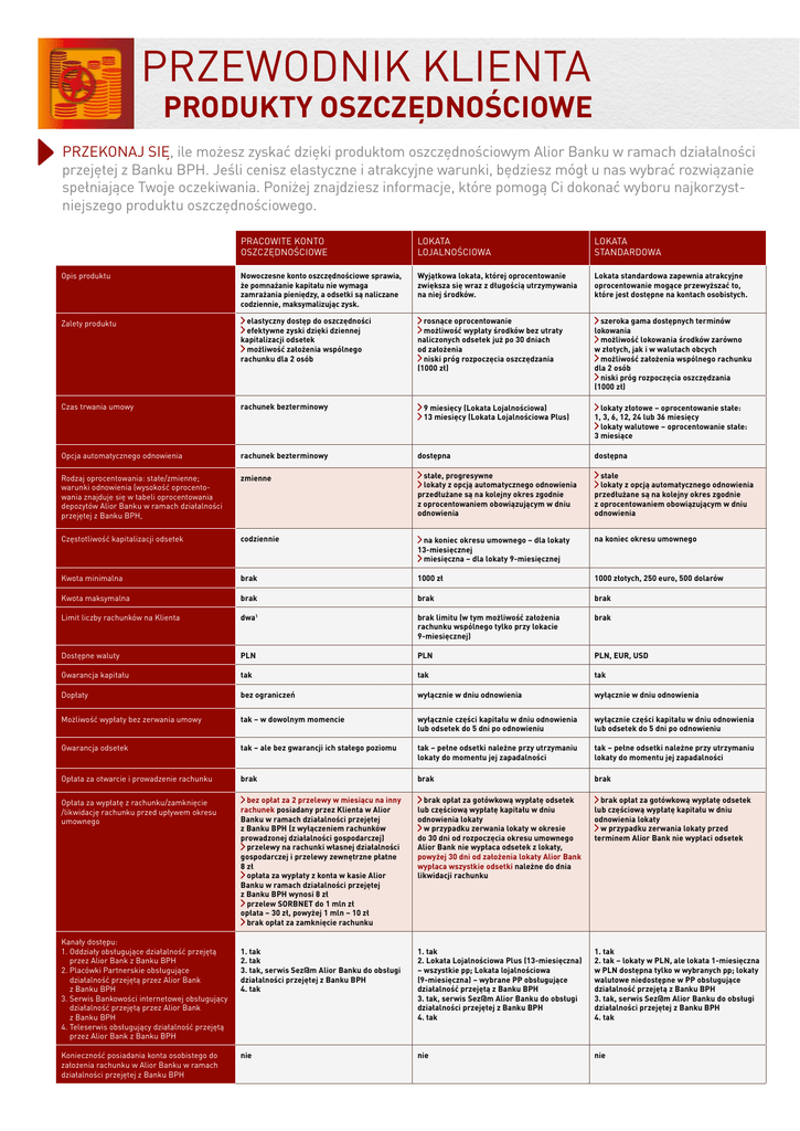 PRZEWODNIK KLIENTA PRODUKTY OSZCZĘDNOŚCIOWE PRZEKONAJ SIĘ, ile możesz zyskać dzięki produktom oszczędnościowym Alior Banku w ramach działalności przejętej z Banku BPH. Jeśli cenisz elastyczne i atrakcyjne warunki, będziesz mógł u nas wybrać rozwiązanie spełniające Twoje oczekiwania. Poniżej znajdziesz informacje, które pomogą Ci dokonać wyboru najkorzystniejszego produktu oszczędnościowego. PRACOWITE KONTO OSZCZĘDNOŚCIOWE LOKATA LOJALNOŚCIOWA LOKATA STANDARDOWA Opis produktu Nowoczesne konto oszczędnościowe sprawia, że pomnażanie kapitału nie wymaga zamrażania pieniędzy, a odsetki są naliczane codziennie, maksymalizując zysk. Wyjątkowa lokata, której oprocentowanie zwiększa się wraz z długością utrzymywania na niej środków. Lokata standardowa zapewnia atrakcyjne oprocentowanie mogące przewyższać to, które jest dostępne na kontach osobistych. Zalety produktu elastyczny dostęp do oszczędności efektywne zyski dzięki dziennej kapitalizacji odsetek możliwość założenia wspólnego rachunku dla 2 osób rosnące oprocentowanie możliwość wypłaty środków bez utraty naliczonych odsetek już po 30 dniach od założenia niski próg rozpoczęcia oszczędzania (1000 zł) szeroka gama dostępnych terminów lokowania możliwość lokowania środków zarówno w złotych, jak i w walutach obcych możliwość założenia wspólnego rachunku dla 2 osób niski próg rozpoczęcia oszczędzania (1000 zł) Czas trwania umowy rachunek bezterminowy Opcja automatycznego odnowienia rachunek bezterminowy dostępna dostępna Rodzaj oprocentowania: stałe/zmienne; warunki odnowienia (wysokość oprocentowania znajduje się w tabeli oprocentowania depozytów Alior Banku w ramach działalności przejętej z Banku BPH, zmienne stałe, progresywne lokaty z opcją automatycznego odnowienia przedłużane są na kolejny okres zgodnie z oprocentowaniem obowiązującym w dniu odnowienia stałe lokaty z opcją automatycznego odnowienia przedłużane są na kolejny okres zgodnie z oprocentowaniem obowiązującym w dniu odnowienia Częstotliwość kapitalizacji odsetek codziennie na koniec okresu umownego – dla lokaty 13-miesięcznej miesięczna – dla lokaty 9-miesięcznej na koniec okresu umownego Kwota minimalna brak 1000 zł 1000 złotych, 250 euro, 500 dolarów Kwota maksymalna brak brak brak Limit liczby rachunków na Klienta dwa1 brak limitu (w tym możliwość założenia rachunku wspólnego tylko przy lokacie 9-miesięcznej) brak Dostępne waluty PLN PLN PLN, EUR, USD 9 miesięcy (Lokata Lojalnościowa) 13 miesięcy (Lokata Lojalnościowa Plus) lokaty złotowe – oprocentowanie stałe: 1, 3, 6, 12, 24 lub 36 miesięcy lokaty walutowe – oprocentowanie stałe: 3 miesiące Gwarancja kapitału tak tak tak Dopłaty bez ograniczeń wyłącznie w dniu odnowienia wyłącznie w dniu odnowienia Możliwość wypłaty bez zerwania umowy tak – w dowolnym momencie wyłącznie części kapitału w dniu odnowienia lub odsetek do 5 dni po odnowieniu wyłącznie części kapitału w dniu odnowienia lub odsetek do 5 dni po odnowieniu Gwarancja odsetek tak – ale bez gwarancji ich stałego poziomu tak – pełne odsetki należne przy utrzymaniu lokaty do momentu jej zapadalności tak – pełne odsetki należne przy utrzymaniu lokaty do momentu jej zapadalności Opłata za otwarcie i prowadzenie rachunku brak brak brak Opłata za wypłatę z rachunku/zamknięcie /likwidację rachunku przed upływem okresu umownego bez opłat za 2 przelewy w miesiącu na inny rachunek posiadany przez Klienta w Alior Banku w ramach działalności przejętej z Banku BPH (z wyłączeniem rachunków prowadzonej działalności gospodarczej) przelewy na rachunki własnej działalności gospodarczej i przelewy zewnętrzne płatne 8 zł opłata za wypłaty z konta w kasie Alior Banku w ramach działalności przejętej z Banku BPH wynosi 8 zł przelew SORBNET do 1 mln zł opłata – 30 zł, powyżej 1 mln – 10 zł brak opłat za zamknięcie rachunku brak opłat za gotówkową wypłatę odsetek lub częściową wypłatę kapitału w dniu odnowienia lokaty w przypadku zerwania lokaty w okresie do 30 dni od rozpoczęcia okresu umownego Alior Bank nie wypłaca odsetek z lokaty, powyżej 30 dni od założenia lokaty Alior Bank wypłaca wszystkie odsetki należne do dnia likwidacji rachunku brak opłat za gotówkową wypłatę odsetek lub częściową wypłatę kapitału w dniu odnowienia lokaty w przypadku zerwania lokaty przed terminem Alior Bank nie wypłaci odsetek 1. tak 2. tak 3. tak, serwis Sez@m Alior Banku do obsługi działalności przejętej z Banku BPH 4. tak 1. tak 2. Lokata Lojalnościowa Plus (13-miesięczna) – wszystkie pp; Lokata lojalnościowa (9-miesięczna) – wybrane PP obsługujące działalność przejętą z Banku BPH 3. tak, serwis Sez@m Alior Banku do obsługi działalności przejętej z Banku BPH 4. tak 1. tak 2. tak – lokaty w PLN, ale lokata 1-miesięczna w PLN dostępna tylko w wybranych pp; lokaty walutowe niedostępne w PP obsługujące działalność przejętą z Banku BPH 3. tak, serwis Sez@m Alior Banku do obsługi działalności przejętej z Banku BPH 4. tak nie nie nie Kanały dostępu: 1. O ddziały obsługujące działalność przejętą przez Alior Bank z Banku BPH 2. P lacówki Partnerskie obsługujące działalność przejętą przez Alior Bank z Banku BPH 3. S erwis Bankowości internetowej obsługujący działalność przejętą przez Alior Bank z Banku BPH 4. T eleserwis obsługujący działalność przejętą przez Alior Bank z Banku BPH Konieczność posiadania konta osobistego do założenia rachunku w Alior Banku w ramach działalności przejętej z Banku BPH ZAPOZNAJ SIĘ z poniższymi informacjami, by wybrać najodpowiedniejszy dla siebie produkt oszczędnościowy. LOKATA NEGOCJOWANA E-LOK@TA LOKATY PAKIETOWE Opis produktu Produkt daje możliwość uzyskania indywidualnych warunków oprocentowania i terminów lokowania środków. Lokata intern