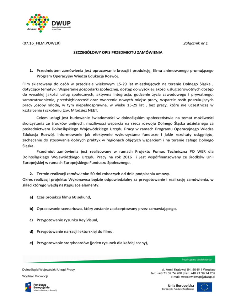 (07.16_FILM.POWER) Załącznik nr 1 SZCZEGÓŁOWY OPIS PRZEDMIOTU ZAMÓWIENIA 1. Przedmiotem zamówienia jest opracowanie kreacji i produkcję, filmu animowanego promującego Program Operacyjny Wiedza Edukacja Rozwój. Film skierowany do osób w przedziale wiekowym 15-29 lat mieszkających na terenie Dolnego Śląska , dotyczący tematyki: Wspieranie gospodarki społecznej, dostęp do wysokiej jakości usług zdrowotnych dostęp do wysokiej jakości usług społecznych, aktywna integracja, godzenie życia zawodowego i prywatnego, samozatrudnienie, przedsiębiorczość oraz tworzenie nowych miejsc pracy, wsparcie osób poszukujących pracy ,osoby młode, w tym niepełnosprawne, w wieku 15-29 lat , bez pracy, które nie uczestniczą w kształceniu i szkoleniu tzw. Młodzież NEET. Celem usługi jest budowanie świadomości w dolnośląskim społeczeństwie na temat możliwości skorzystania ze środków unijnych, możliwości wsparcia na rzecz rozwoju Dolnego Śląska udzielanego za pośrednictwem Dolnośląskiego Wojewódzkiego Urzędu Pracy w ramach Programu Operacyjnego Wiedza Edukacja Rozwój, informowanie jak efektywnie wykorzystano fundusze i jakie rezultaty osiągnięto, zachęcanie do stosowania dobrych praktyk w regionach objętych wsparciem i na terenie całego Dolnego Śląska . Przedmiot zamówienia jest realizowany w ramach Projektu Pomoc Techniczna PO WER dla Dolnośląskiego Wojewódzkiego Urzędu Pracy na rok 2016 i jest współfinansowany ze środków Unii Europejskiej w ramach Europejskiego Funduszu Społecznego. 2. Termin realizacji zamówienia: 50 dni roboczych od dnia podpisania umowy. Okres realizacji projektu: Wykonawca będzie odpowiedzialny za przygotowanie i realizację zamówienia, w skład którego wejdą następujące elementy: a) Czas projekcji filmu 60 sekund, b) Opracowanie scenariusza, który zostanie zaakceptowany przez zamawiającego, c) Przygotowanie rysunku Key Visual, d) Przygotowanie narracji lektorskiej do filmu, e) Przygotowanie storyboardów (jeden rysunek dla każdej sceny), Dolnośląski Wojewódzki Urząd Pracy Wydział Promocji al. Armii Krajowej 54, 50-541 Wrocław tel.: +48 71 39 74 200 | fax: +48 71 39 74 202 e-mail: [email protected] f) Projektowanie elementów składowych dla każdej ze scen, g) Postprodukcja - proces animacji elementów, h) Wersja filmu umożliwiająca dystrybuowanie w mediach społecznościowych/Internet 3. Warunki udziału: Wykonawca musi posiadać co najmniej 2-letnie udokumentowane doświadczenie w realizacji usług polegających na produkcji filmów animowanych o charakterze informacyjnym lub promocyjnym, w zakresie równym co najmniej zakresowi przedmiotowego zamówienia, tj. produkcja co najmniej 3 filmów animowanych o charakterze informacyjnym lub promocyjnym. 4. Prawa autorskie a) Zamawiający ma prawo wykorzystać/rozpowszechniać/zwielokrotniać wersję elektroniczną i papierową powstałych w ramach realizowanego przedmiotu umowy filmu w ilości i zakresie dowolnym. b) Wykonawca na podstawie umowy z chwilą odbioru przedmiotu zamówienia przeniesie na Zamawiającego wszelkie autorskie prawa majątkowe i pokrewne (prawa zależne) do filmu za wynagrodzeniem, do nieograniczonego w czasie i przestrzeni korzystania i rozporządzania wytworzonymi materiałami w tym do powielania, publikowania, edytowania oraz ich modyfikowania, bez konieczności składania w tej sprawie jakichkolwiek dodatkowych oświadczeń woli przez Strony. c) Przeniesienie autorskich praw majątkowych obejmuje wszystkie znane pola eksploatacji związane z przedmiotem zamówienia, w tym w szczególności: 1) wielokrotnego publikowania filmu, 2) rozpowszechniania, 3) wielokrotnego udostępniania i przekazywania osobom trzecim, 4) wielokrotnego wprowadzania do pamięci komputera, 5) wykorzystywanie w produkcjach multimedialnych i internetowych. d) Odrębne pola eksploatacji stanowią w szczególności w zakresie: 1) utrwalania i zwielokrotniania filmu - wytwarzanie określoną techniką egzemplarzy materiału; 2) obrotu oryginałem lub egzemplarzami, na których materiał utrwalono - wprowadzanie do obrotu, użyczenie lub najem oryginału albo egzemplarzy; 3) rozpowszechniania materiału w sposób inny niż określony w pkt. 2 - publiczne wykonanie, wystawienie, wyświetlenie, odtworzenie oraz nadawanie i reemitowanie, a także publiczne udostępnianie filmu w taki sposób, aby każdy mógł mieć do niego dostęp w miejscu i w czasie przez siebie wybranym e) Wykonawca uzyska wszelkie niezbędne zgody, umożliwiające realizację przedmiotu umowy przez Wykonawcę, w tym zgody na wykorzystanie filmu zapewnionych przez Wykonawcę. 5. Kryterium oceny ofert: W celu wybory najkorzystniejszej oferty, Zamawiający przyjął kryterium: „Cena – 100%”. Najlepszą ofertą w rozumieniu powyższego kryterium będzie oferta o najniższej cenie. 2 3