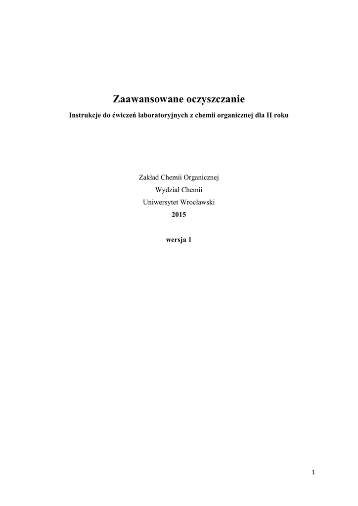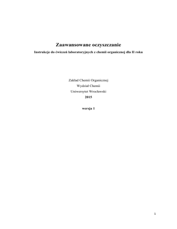 Zaawansowane oczyszczanie Instrukcje do ćwiczeń laboratoryjnych z chemii organicznej dla II roku Zakład Chemii Organicznej Wydział Chemii Uniwersytet Wrocławski 2015 wersja 1 1 Spis treści [O1] Krystalizacja z rozpuszczalnika organicznego 2 [O2] Destylacja nieznanej cieczy 3 [O3] Destylacja frakcyjna mieszaniny cieczy 4 [O4] Rozdzielenie mieszaniny kwasu benzoesowego i aldehydu benzoesowego 5 [O5] Oczyszczanie fenolu 6 [O6] Oczyszczanie acetonu 7 [O7] Oczyszczanie octanu etylu 8 [O8] Oczyszczanie aniliny metodą destylacji z parą wodną 9 [O9] Otrzymywanie bezwodnego alkoholu etylowego 10 [O10] Oczyszczanie dichlorometanu 11 [O11] Ekstrakcyjny rozdział p-bromonitrobenzenu i p-bromoaniliny 12 2 [O1] Krystalizacja z rozpuszczalnika organicznego Wszystkie związki należy uznać za niebezpieczne i zachować wszelkie środki ostrożności. Otrzymaną próbkę substancji należy umieścić w kolbie kulistej, zaopatrzonej w chłodnicę zwrotną, dodać połowę otrzymanej ilości rozpuszczalnika i ogrzewać delikatnie płaszczem grzejnym do wrzenia. Jeżeli cała próbka nie rozpuści się, dodawać stopniowo rozpuszczalnik (ostrożnie górą przez chłodnicę) i kontynuować ogrzewanie dopóki po dodaniu kolejnej porcji nie przestanie ubywać osadu. Po lekkim ostudzeniu dodać do roztworu niewielką ilość węgla aktywnego, zagotować jeszcze raz i przesączyć na gorąco (ostrożnie, kontrolując temperaturę płaszcza wodnego). Przesącz pozostawić do ostygnięcia, odsączyć wydzielony osad pod zmniejszonym ciśnieniem, przemyć niewielką ilością rozpuszczalnika, przenieść na szalkę i pozostawić do wyschnięcia. Zważyć suchy osad, oznaczyć temperaturę topnienia. Substancje oznaczone gwiazdką(*) Jeżeli rozpuszczalność substancji w rozpuszczalniku organicznym jest bardzo wysoka, można po zakończeniu sączenia umieścić roztwór w kolbie kulistej, zaopatrzonej w chłodnicę zwrotną, i do ogrzewanego roztworu dodawać stopniowo wodę (przez górny otwór chłodnicy) aż do wystąpienia SŁABEGO zmętnienia. Należy przerwać ogrzewanie i pozostawić próbkę do krystalizacji. Zimną zawiesinę sączy się starannie pod obniżonym ciśnieniem, przemywa mieszaniną rozpuszczalnik-woda (w proporcji możliwie zbliżonej do składu roztworu) i pozostawia do wyschnięcia. Suchy osad należy zważyć i oznaczyć temperaturę topnienia. Na podstawie temperatury topnienia należy zidentyfikować krystalizowaną substancję, w sprawozdaniu podać nazwę i wzór strukturalny związku, temperaturę topnienia próbki, ilość uzyskanego produktu, wydajność krystalizacji oraz objętość rozpuszczalnika (i ewentualnie wody). Pytania do ćwiczenia (odpowiedzi należy umieścić w sprawozdaniu przed rozpoczęciem zajęć) 1. W jaki sposób zanieczyszczenia wpływają na temperaturę topnienia? 2. W jakim celu stosuje się węgiel aktywny? 3. W jakim celu przemywa się osad po przesączeniu? 2 [O2] Destylacja nieznanej cieczy Wszystkie związki należy uznać za niebezpieczne i zachować wszelkie środki ostrożności. Celem ćwiczenia jest oczyszczenie przez destylację prostą próbki nieznanej cieczy organicznej oraz wyznaczenie temperatury wrzenia i współczynnika załamania światła. Wszystkie naczynia stosowane w ćwiczeniu mają być czyste i suche. Spodziewana temperatura wrzenia nie przekracza 150°C. W zmontowanym zestawie do destylacji prostej umieszcza się otrzymaną próbkę cieczy. Należy pamiętać o kamyczkach wrzennych i zwrócić uwagę na prawidłowe umieszczenie termometru. Regulując ostrożnie temperaturę i szybkość ogrzewania przeprowadza się destylację prostą, zbierając przedgon (destylat do momentu osiągnięcia stałej temperatury wrzenia) i frakcję właściwą (destylującą w stałej temperaturze). W kolbie destylacyjnej MUSI zostać pewna ilość cieczy, destylowanie do sucha jest niebezpieczne. Jeżeli temperatura w trakcie destylacji zmienia się, należy zebrać kilka frakcji. Należy zmierzyć współczynnik załamania światła destylatu oraz jego objętość, na podstawie wartości temperatury wrzenia i współczynnika załamania światła zidentyfikować ciecz, narysować jej wzór strukturalny i obliczyć wydajność procesu. Pytania do ćwiczenia (odpowiedzi należy umieścić w sprawozdaniu przed rozpoczęciem zajęć) 1. Dlaczego destylacja do sucha jest niebezpieczna ? 2. W jakim celu stosuje się kamyczki wrzenne ? Jakich innych sposobów można użyć zamiast dodawania kamyczków wrzennych? 3 [O3] Destylacja frakcyjna mieszaniny cieczy Wszystkie związki należy uznać za niebezpieczne i zachować wszelkie środki ostrożności. Do okrągłodennej kolby destylacyjnej o pojemności 250 ml wlać otrzymaną mieszaninę cieczy. Wrzucić kamyczek wrzenny. Zmontować aparaturę do destylacji cieczy: A) bez deflegmatora Przeprowadzić destylację otrzymanej mieszaniny zbierając destylat do cylindra miarowego. Co 2 ml zbieranego destylatu notować temperaturę wrzenia. Pozostałość po destylacji (pogon) pozostawić w kolbie destylacyjnej. Po skończonej destylacji zawrócić destylat do kolby destylacyjnej i przeprowadzić część B) ćwiczenia. B) z deflegmatorem Powtórzyć doświadczenie z punktu A) stosując aparaturę do destylacji z deflegmatorem i dodając nowe kamyczki wrzenne. Zbieramy następujące frakcje: • przedgon – destyluje do ustalenia się temperatury wrzenia • pierwszą frakcję – destyluje po ustaleniu się temperatury wrzenia • frakcję pośrednią – destyluje do ponownego ustalenia się temperatury wrzenia • drugą frakcję – destyluje po ponownym ustaleniu się temperatury wrzenia. Pozostałość po destylacji (pogon) pozostawić w kolbie destylacyjnej. Co 2 ml odbieranego destylatu notujemy temperaturę wrzenia. Dla poszczególnych czystych frakcji mierzymy współczynniki załamania światła. W sprawozdaniu należy przedstawić wykresy zależności temperatury na szczycie nasadki destylac
