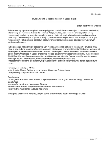 Pobrano z portalu Mapa Kultury 08.12.2014 DON KICHOT w Teatrze Wielkim w Łodzi (balet) ____________________________ autor: Teatr Wielki w Łodzi Balet komiczny oparty na wątkach zaczerpniętych z powieści Cervantesa jest przykładem swobodnej interpretacji pierwowzoru. Librecista - Marius Petipa, będący jednocześnie choreografem wersji premierowej, zadbał, by wszystko służyło jednemu - tańcowi; stąd w balecie mnóstwo fajerwerków tanecznych: brawurowych popisów solowych, duetów i scen zespołowych. Nie brakuje także, w tym roztańczonym kalejdoskopie obrazów, zabawnych groteskowych postaci, dowcipów sytuacyjnych i subtelnego humoru. Publiczność po raz pierwszy zobaczyła Don Kichota w Teatrze Bolszoj w Moskwie 14 grudnia 1869 roku, a jego jedyna w naszym Teatrze realizacja miała swoją premierę 31 maja 1986 roku. Autorem jej choreografii był niezapomniany Mistrz - tancerz i choreograf - Witold Borkowski, pierwszy kierownik baletu Teatru Wielkiego w Łodzi. Znakomite kreacje stworzyli w ówczesnym spektaklu m.in.: Czesław Bilski (Don Kichot), Zbigniew Sobis, Krzysztof Starczewski (Sancho Pansa) oraz Roman Komassa, Andrzej Cybulski (Don Basilio), Edyta Wasłowska, Malwina Poleszak(Kitri). Przedstawienie cieszyło się ogromnym powodzeniem u publiczności; wierzymy, że tak będzie i tym razem. kompozytor: Ludwig A. Minkus autor libretta: Marius Petipa, w opracowaniu Alexandra Polubentseva data premiery: 26 października 2013 roku Realizatorzy: choreografia: Alexandr Polubentsev, z wykorzystaniem choreografii Mariusa Petipy i Alexandra Gorsky'ego scenografia i kostiumy : Viacheslav Okunev libretto Marius Petipa, w opracowaniu Alexandra Polubentseva kierownictwo muzyczne: Tadeusz Kozłowski Występują oraz soliści, koryfeje, zespół baletu oraz orkiestra Teatru Wielkiego w Łodzi strona 1 / 1