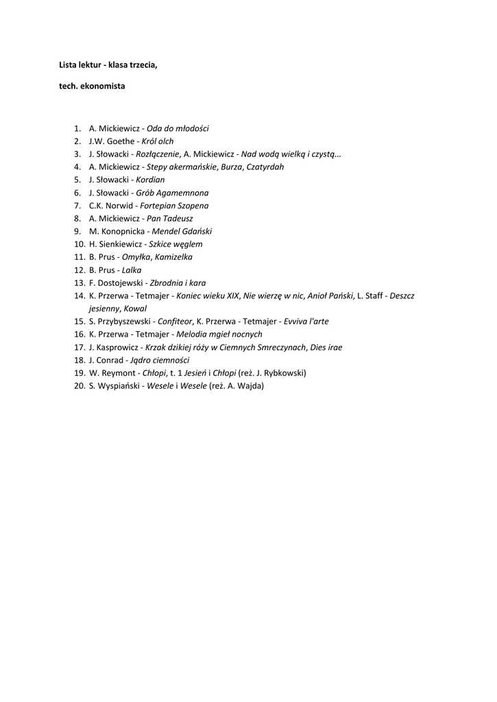 Lista lektur - klasa trzecia, tech. ekonomista 1. 2. 3. 4. 5. 6. 7. 8. 9. 10. 11. 12. 13. 14. 15. 16. 17. 18. 19. 20. A. Mickiewicz - Oda do młodości J.W. Goethe - Król olch J. Słowacki - Rozłączenie, A. Mickiewicz - Nad wodą wielką i czystą... A. Mickiewicz - Stepy akermańskie, Burza, Czatyrdah J. Słowacki - Kordian J. Słowacki - Grób Agamemnona C.K. Norwid - Fortepian Szopena A. Mickiewicz - Pan Tadeusz M. Konopnicka - Mendel Gdański H. Sienkiewicz - Szkice węglem B. Prus - Omyłka, Kamizelka B. Prus - Lalka F. Dostojewski - Zbrodnia i kara K. Przerwa - Tetmajer - Koniec wieku XIX, Nie wierzę w nic, Anioł Pański, L. Staff - Deszcz jesienny, Kowal S. Przybyszewski - Confiteor, K. Przerwa - Tetmajer - Evviva l'arte K. Przerwa - Tetmajer - Melodia mgieł nocnych J. Kasprowicz - Krzak dzikiej róży w Ciemnych Smreczynach, Dies irae J. Conrad - Jądro ciemności W. Reymont - Chłopi, t. 1 Jesień i Chłopi (reż. J. Rybkowski) S. Wyspiański - Wesele i Wesele (reż. A. Wajda)
