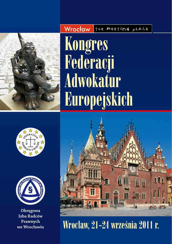 Kongres Federacji Adwokatur Europejskich Okręgowa Izba Radców Prawnych we Wrocławiu Wrocław, 21-24 września 2011 r. Prawnik i media społecznościowe Data: 21-24 września 2011 r., Wrocław Miejsce: Uniwersytet Wrocławski Wydział Prawa, Administracji i Ekonomii ul. Uniwersytecka 7-10 50-145 Wrocław budynek D Przewodnicząca Komitetu Organizacyjnego: Barbara Kras – Dziekan OIRP we Wrocławiu Organizator: Okręgowa Izba Radców Prawnych we Wrocławiu ul. Włodkowica 8 50-072 Wrocław Temat główny: Prawnik i media społecznościowe Język obrad: angielski, niemiecki, hiszpański, włoski, francuski Informacje: www.fbe.org Kongres Federacji Adwokatur Europejskich www.fbe.org Zgłoszenie udziału: na podstawie formularza off-line wypełnionego i przesłanego do Biura Organizatora faxem: 71 780 90 54 lub emailem: [email protected]. Formularz do pobrania na stronie www.oirp.wroclaw.pl Opłata za udział w kongresie obejmuje: Uczestnicy: udział w obradach, materiały konferencyjne, lunche, przerwy kawowe, koktajl powitalny, uroczysty obiad, wieczorne przyjęcie w ogrodach oraz lunch pożegnalny. Osoby towarzyszące: program turystyczny, koktajl powitalny, uroczysty obiad, wieczorne przyjęcie w ogrodach oraz lunch pożegnalny. Konto: Okręgowa Izba Radców Prawnych we Wrocławiu ul. Włodkowica 8; 50-072 Wrocław PKO Bank Polski S.A., Oddział 4 we Wrocławiu, Poland ul. Gepperta 4, 50-076 Wrocław 02 1020 5242 0000 2802 0019 1320 Biuro Organizatora: InspireCongress Sp. z o.o. ul. Nowowiejska 38; 50-315 Wrocław tel: +48 71 780 90 52 fax: +48 71 780 90 54 email: [email protected] www.inspirecongress.pl Kongres Federacji Adwokatur Europejskich Prawnik i media społecznościowe Wrocław, 21-24 września 2011 r. Organizator: Okręgowa Izba Radców Prawnych we Wrocławiu ul. Włodkowica 8 50-072 Wrocław tel. +48 71 79 37 094 faks /tel. +48 71 79 37 096 Biuro Organizatora: InspireCongress Sp. z o.o. ul. Nowowiejska 38 50-315 Wrocław tel: +48 71 780 90 52 fax: +48 71 780 90 54 email: [email protected] www.inspirecongress.pl