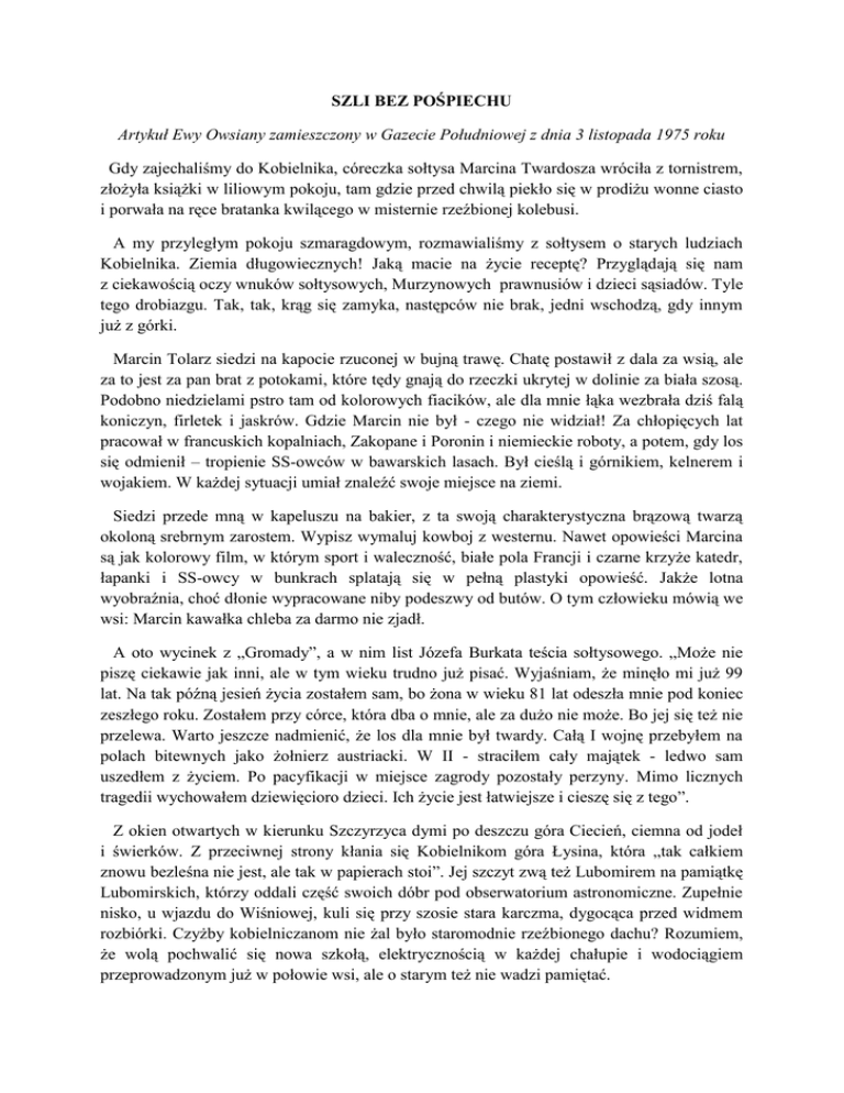 SZLI BEZ POŚPIECHU Artykuł Ewy Owsiany zamieszczony w Gazecie Południowej z dnia 3 listopada 1975 roku Gdy zajechaliśmy do Kobielnika, córeczka sołtysa Marcina Twardosza wróciła z tornistrem, złożyła książki w liliowym pokoju, tam gdzie przed chwilą piekło się w prodiżu wonne ciasto i porwała na ręce bratanka kwilącego w misternie rzeźbionej kolebusi. A my przyległym pokoju szmaragdowym, rozmawialiśmy z sołtysem o starych ludziach Kobielnika. Ziemia długowiecznych! Jaką macie na życie receptę? Przyglądają się nam z ciekawością oczy wnuków sołtysowych, Murzynowych prawnusiów i dzieci sąsiadów. Tyle tego drobiazgu. Tak, tak, krąg się zamyka, następców nie brak, jedni wschodzą, gdy innym już z górki. Marcin Tolarz siedzi na kapocie rzuconej w bujną trawę. Chatę postawił z dala za wsią, ale za to jest za pan brat z potokami, które tędy gnają do rzeczki ukrytej w dolinie za biała szosą. Podobno niedzielami pstro tam od kolorowych fiacików, ale dla mnie łąka wezbrała dziś falą koniczyn, firletek i jaskrów. Gdzie Marcin nie był - czego nie widział! Za chłopięcych lat pracował w francuskich kopalniach, Zakopane i Poronin i niemieckie roboty, a potem, gdy los się odmienił – tropienie SS-owców w bawarskich lasach. Był cieślą i górnikiem, kelnerem i wojakiem. W każdej sytuacji umiał znaleźć swoje miejsce na ziemi. Siedzi przede mną w kapeluszu na bakier, z ta swoją charakterystyczna brązową twarzą okoloną srebrnym zarostem. Wypisz wymaluj kowboj z westernu. Nawet opowieści Marcina są jak kolorowy film, w którym sport i waleczność, białe pola Francji i czarne krzyże katedr, łapanki i SS-owcy w bunkrach splatają się w pełną plastyki opowieść. Jakże lotna wyobraźnia, choć dłonie wypracowane niby podeszwy od butów. O tym człowieku mówią we wsi: Marcin kawałka chleba za darmo nie zjadł. A oto wycinek z „Gromady”, a w nim list Józefa Burkata teścia sołtysowego. „Może nie piszę ciekawie jak inni, ale w tym wieku trudno już pisać. Wyjaśniam, że minęło mi już 99 lat. Na tak późną jesień życia zostałem sam, bo żona w wieku 81 lat odeszła mnie pod koniec zeszłego roku. Zostałem przy córce, która dba o mnie, ale za dużo nie może. Bo jej się też nie przelewa. Warto jeszcze nadmienić, że los dla mnie był twardy. Całą I wojnę przebyłem na polach bitewnych jako żołnierz austriacki. W II - straciłem cały majątek - ledwo sam uszedłem z życiem. Po pacyfikacji w miejsce zagrody pozostały perzyny. Mimo licznych tragedii wychowałem dziewięcioro dzieci. Ich życie jest łatwiejsze i cieszę się z tego”. Z okien otwartych w kierunku Szczyrzyca dymi po deszczu góra Ciecień, ciemna od jodeł i świerków. Z przeciwnej strony kłania się Kobielnikom góra Łysina, która „tak całkiem znowu bezleśna nie jest, ale tak w papierach stoi”. Jej szczyt zwą też Lubomirem na pamiątkę Lubomirskich, którzy oddali część swoich dóbr pod obserwatorium astronomiczne. Zupełnie nisko, u wjazdu do Wiśniowej, kuli się przy szosie stara karczma, dygocąca przed widmem rozbiórki. Czyżby kobielniczanom nie żal było staromodnie rzeźbionego dachu? Rozumiem, że wolą pochwalić się nowa szkołą, elektrycznością w każdej chałupie i wodociągiem przeprowadzonym już w połowie wsi, ale o starym też nie wadzi pamiętać. Idziemy osiedlem Na Potoku, gdzie gałęzie sadu opuszczają się nisko aż nad ścieżki. Pozdrawiamy Józefa Murzyna, który odkłada właśnie rąbaną kłodę drewna i kulejąc zbliża się do nas. Od trzech już lat stara się o leczenie sanatoryjne, ale bez skutku. Z czego jest tu znany? Z pracy u Staszka Marusarza na Hali Pysznej w schronisku. Palił w14 piecach, nosił wodę i gości szukał nocami, jak poginęli we mgle. Do dziś mówi o Marusarzu kordialnie, jak o dobrym znajomym. Józefa Murzyna znają też z gry w Salomona (to się, pani, ziarnkiem pszenicy rzuca w tarczę z numerami) i z tłumaczenia snów. Ma w swoim skarbcu blisko dziewięćdziesięcioletni sennik, do którego lubi zaglądać, kiedy mu klienci coś nieprzeciętnego przyniosą do rozgryzienia. No i ponoć się Józkowe tłumaczenia sprawdzają. Wojnę wywróżył i niejednej pannie chłopaka. Niedzielami bywa, że i po dziesięć czeka u niego w kolejce ze snami, a on cierpliwie tłumaczy z łaski na uciechę. Józef Murzyn wsławił się w swej rodzinnej wsi także i śpiewem. Ma głos czysty i donośny, ale daje się długo prosić zanim zaśpiewa. „Na Podolu biały kamień Na Podolu biały kamień Podolanka, ładna panna Siadywuje na nim Przyszedł do niej Podolaniec Podolanko daj mi wieniec A ja wianka nie dam tobie Bom oddała krakowskiemu…” Słuchaczy ogarnia nastrój tego improwizowanego artystycznego południa. Zebrani proszą Józefa, aby śpiewał jeszcze, ale na mnie czas. Trzeba odwiedzić Stanisława Murzyna, który w tym roku ukończył 100 lat. Sędziwy jubilat drzemie pod kraciastą pierzyną. Jego bliscy opowiadają: Do tej chaty z jodłowego drzewa przyżenił się dziadek 75 lat temu. Tu chowało się ośmioro jego dzieci. Najstarszy Józef i Wojciech dziś już nie żyjący, Katarzyna, która całe swe życie spędziła przy ojcu i dziś się nim opiekuje. Wiktoria „żeniata” w Wiśniowej. Hanka, która mając 16 lat „zerwała się na śmierć” przy sieczkarni, Jan gospodarz w nowej chacie, Maria, ta co została na zachodzie dokąd ją Niemcy wywieźli na roboty i Karolina – gospodyni z Zasadnia. Ich matka - powiadają - pomarli młodo, mieli tylko 64 lata. Kiedy dwaj pierwsi synowie byli na świecie i Stanisław Zrozumiał, że nie ma co im dać jeść , zdecydował, że czas popłynąć w świat za chlebem. Odwoziło się takich „straceńców” furka do Wieliczki. A potem jechali, jak kto mógł. Kto by pamiętał do jakiego portu. Na końcu podróży czekało wielkie Chicago. Z wędrówek ocalała pamięć burzy morskie