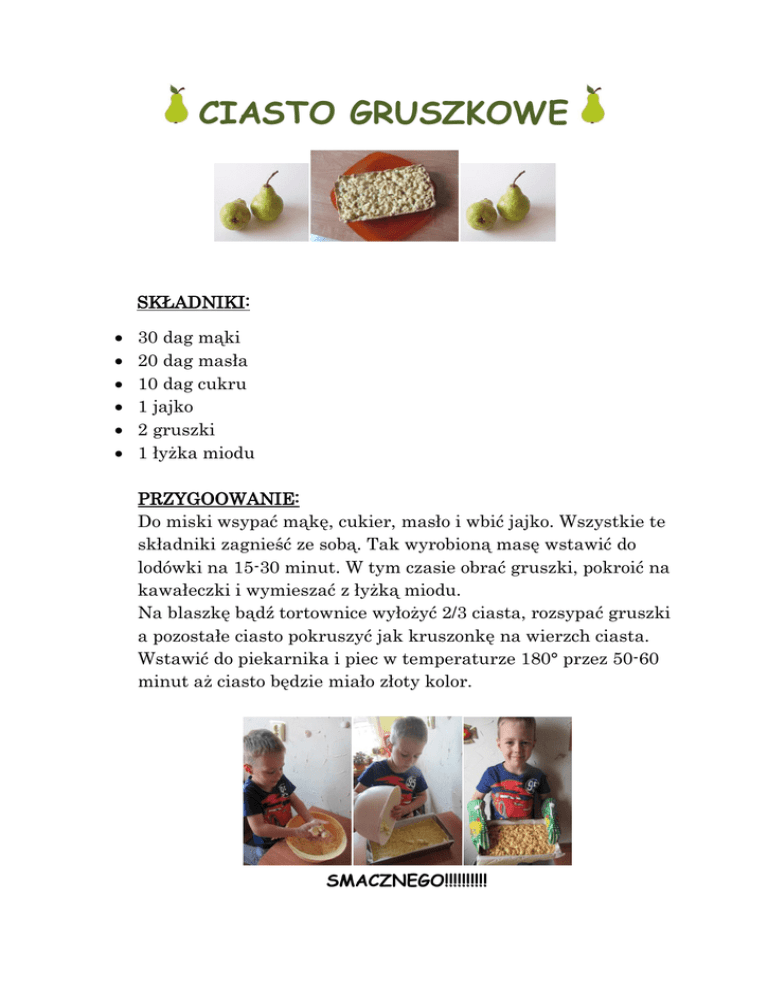 CIASTO GRUSZKOWE SKŁADNIKI: 30 dag mąki 20 dag masła 10 dag cukru 1 jajko 2 gruszki 1 łyżka miodu PRZYGOOWANIE: Do miski wsypać mąkę, cukier, masło i wbić jajko. Wszystkie te składniki zagnieść ze sobą. Tak wyrobioną masę wstawić do lodówki na 15-30 minut. W tym czasie obrać gruszki, pokroić na kawałeczki i wymieszać z łyżką miodu. Na blaszkę bądź tortownice wyłożyć 2/3 ciasta, rozsypać gruszki a pozostałe ciasto pokruszyć jak kruszonkę na wierzch ciasta. Wstawić do piekarnika i piec w temperaturze 180° przez 50-60 minut aż ciasto będzie miało złoty kolor. SMACZNEGO!!!!!!!!!!