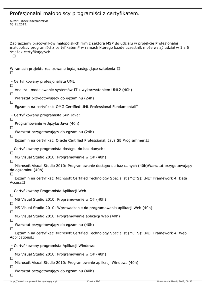Profesjonalni małopolscy programiści z certyfikatem. Autor: Jacek Kaczmarczyk 08.11.2013. Zapraszamy pracowników małopolskich firm z sektora MSP do udziału w projekcie Profesjonalni małopolscy programiści z certyfikatem* w ramach którego każdy uczestnik może wziąć udział w 1 z 6 ścieżek certyfikujących. W ramach projektu realizowane będą następujące szkolenia: - Certyfikowany profesjonalista UML Analiza i modelowanie systemów IT z wykorzystaniem UML2 (40h) Warsztat przygotowujący do egzaminu (24h) Egzamin na certyfikat: OMG Certified UML Professional Fundamental - Certyfikowany programista Sun Java: Programowanie w Języku Java (40h) Warsztat przygotowujący do egzaminu (24h) Egzamin na certyfikat: Oracle Certified Professional, Java SE Programmer. - Certyfikowany programista dostępu do baz danych: MS Visual Studio 2010: Programowanie w C# (40h) Microsoft Visual Studio 2010: Programowanie dostępu do baz danych (40h)Warsztat przygotowujący do egzaminu (40h) Egzamin na certyfikat: Microsoft Certified Technology Specialist (MCTS): .NET Framework 4, Data Access - Certyfikowany Programista Aplikacji Web: MS Visual Studio 2010: Programowanie w C# (40h) MS Visual Studio 2010: Wprowadzenie do programowania aplikacji Web (40h) MS Visual Studio 2010: Programowanie aplikacji Web (40h) Warsztat przygotowujący do egzaminu (40h) Egzamin na certyfikat: Microsoft Certified Technology Specialist (MCTS): .NET Framework 4, Web Applications - Certyfikowany programista Aplikacji Windows: MS Visual Studio 2010: Programowanie w C# (40h) Microsoft Visual Studio 2010: Programowanie aplikacji Windows (40h) Warsztat przygotowujący do egzaminu (40h) http://www.kocmyrzow-luborzyca.ug.gov.pl Kreator PDF Utworzono 4 March, 2017, 08:55 Egzamin na certyfikat: Microsoft Certified Technology Specialist (MCTS): .NET Framework 4, Windows Applications 100% kosztów szkoleń finansowanych jest z Europejskiego Funduszu Społecznego w formie pomocy de minimis. Uczestnicy szkoleń nie wnoszą żadnych opłat. Szkolenia realizowane są na terenie Krakowa. Biuro projektu mieści się przy ul. Mogilska 65. *Projekt do osób samozatrudnionych oraz do pracowników zatrudnionych na podstawie umowy o pracę w mikro, małych i średnich przedsiębiorstw prowadzących działalność gospodarczą na terenie woj. małopolskiego (posiadające tu jednostkę organizacyjną), które do tej pory nie uzyskały pomocy publicznej/pomocy de minimis w ramach Poddziałania 8.1.1 w związku z objęciem ich wsparciem w ramach projektów szkoleniowych zamkniętych, realizowanych w ramach POKL. Uczestnikami projektu mogą być również osoby fizyczne prowadzące działalność gospodarczą. W projekcie uczestniczyć mogą osoby zajmujące się wytwarzaniem oprogramowania (analitycy, programiści, architekci). Harmonogram szkoleń, kartę zgłoszeniową oraz więcej szczegółów o projekcie znaleźć można na stronie www.topas.com.pl. http://www.kocmyrzow-luborzyca.ug.gov.pl Kreator PDF Utworzono 4 March, 2017, 08:55
