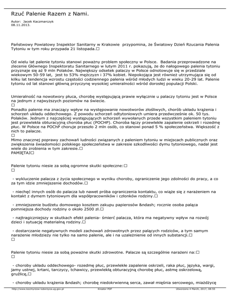 Rzuć Palenie Razem z Nami. Autor: Jacek Kaczmarczyk 08.11.2013. Państwowy Powiatowy Inspektor Sanitarny w Krakowie przypomina, że Światowy Dzień Rzucania Palenia Tytoniu w tym roku przypada 21 listopada. Od wielu lat palenie tytoniu stanowi poważny problem społeczny w Polsce. Badania przeprowadzone na zlecenie Głównego Inspektoratu Sanitarnego w lutym 2011 r. pokazują, że do nałogowego palenia tytoniu przyznaje się aż 9 mln Polaków. Największy odsetek palaczy w Polsce odnotowuje się w przedziale wiekowym 50-59 lat, jest to 53% mężczyzn i 37% kobiet. Niepokojąca jest również utrzymująca się od kilku lat tendencja wzrostu częstości codziennego palenia wśród młodych ludzi w wieku 20-29 lat. Palenie tytoniu od lat stanowi główną przyczynę wysokiej umieralności wśród dorosłej populacji Polski. Umieralność na nowotwory płuca, chorobę występującą prawie wyłącznie u palaczy tytoniu jest w Polsce na jednym z najwyższych poziomów na świecie. Ponadto palenie ma znaczący wpływ na występowanie nowotworów złośliwych, chorób układu krążenia i schorzeń układu oddechowego. Z powodu schorzeń odtytoniowych umiera przedwcześnie ok. 50 tys. Polaków. Jednym z najczęściej występujących schorzeń wywołanych przede wszystkim paleniem tytoniu jest przewlekła obturacyjną choroba płuc (POCHP). Choroba łączy przewlekłe zapalenie oskrzeli i rozedmę płuc. W Polsce na POChP choruje przeszło 2 mln osób, co stanowi ponad 5 % społeczeństwa. Większość z nich to palacze. Mimo znacznej poprawy zachowań ludności związanych z paleniem tytoniu w miejscach publicznych oraz zwiększenia świadomości polskiego społeczeństwa w zakresie szkodliwości dymu tytoniowego, nadal jest wiele do zrobienia w tym zakresie. PAMIĘTAJ Palenie tytoniu niesie za sobą ogromne skutki społeczne: - wykluczenie palacza z życia społecznego w wyniku choroby, ograniczenie jego zdolności do pracy, a co za tym idzie zmniejszenie dochodów. - niechęć innych osób do palacza lub nawet próba ograniczenia kontaktu, co wiąże się z narażeniem na kontakt z dymem tytoniowym dla współpracowników i członków rodziny. - zmniejszenie budżetu domowego kosztem zakupu papierosów – rocznie osoba paląca pomniejsza dochody rodziny o około 2500 zł. - najtragiczniejszy w skutkach efekt palenia- śmierć palacza, która ma negatywny wpływ na rozwój dzieci i sytuację materialną rodziny. - dostarczanie negatywnych modeli zachowań zdrowotnych przez palących rodziców, a tym samym narażenie młodzieży nie tylko na samo palenie, ale i na uzależnienie od innych substancji. Palenie tytoniu niesie za sobą poważne skutki zdrowotne. Palacze są szczególnie narażeni na: - choroby układu oddechowego- rozedmę płuc, przewlekłe zapalenie oskrzeli, raka płuc, języka, wargi, jamy ustnej, krtani, tarczycy, tchawicy, przewlekłą obturacyjną chorobę płuc, astmę oskrzelową, gruźlicę, - choroby układu krążenia – chorobę niedokrwienną serca, zawał mięśnia sercowego, miażdżycę http://www.kocmyrzow-luborzyca.ug.gov.pl Kreator PDF Utworzono 4 March, 2017, 08:55 zarostową kończyn dolnych, nadciśnienie tętnicze, tętniaka aorty, - inne choroby: raka nerki, pęcherza moczowego, przełyku, wrzody żołądka oraz dwunastnicy, przepukliny jelitowe, choroby oczu (katarakty, niedowidzenia, degenerację plamkową), impotencję, upośledzenie płodności. Każdy wypalony papieros – zabiera czas, około 10 minut. Dziennie - wypalenie jednej paczki papierosów zajmuje 3 godziny i 30 minut. Rocznie - prawie 1.160 godzin. W ciągu 10 lat - to aż 12.000 godzin. Jest to czas stracony. Rzucając palenie już dziś: - będziesz otrzymywać więcej tlenu i będzie Ci łatwiej oddychać - będziesz mieć więcej energii - zmniejszy się ryzyko infekcji górnych dróg oddechowych i częstość kaszlu - poprawi się Twoje samopoczucie i poczucie wartości - poprawi się Twoja kondycja fizyczna i psychiczna – zwiększy się odporność na stres - potrawy będą pachniały i smakowały lepiej - twoja skóra i paznokcie będą w lepszym stanie, będziesz mieć mniej zmarszczek - twoje ubranie, włosy i mieszkanie będą pachniały ładniej - oszczędzisz pieniądze, które będziesz mógł przeznaczyć na inne cele. Bez względu na wiek rzucanie palenia zawsze się opłaca! - 20 minut po rzuceniu palenie – spada tempo bicia serca - 8 godzin po rzuceniu palenia - normalizuje się poziom tlenu - 2 tygodnie do 3 miesięcy po rzuceniu palenia - poprawia się funkcjonowanie płuc, spada ryzyko zawału - 1 do 9 miesięcy po rzuceniu palenia - zmniejsza się kaszel i zanika brak tchu - Rok po rzuceniu palenia - spada o połowę ryzyko zachorowania na chorobę wieńcową Korzyści wynikające z rzucenia palenia tytoniu są niewątpliwe. Wszystkich, którzy chcieliby zasięgnąć konsultacji specjalistycznej w sprawach dotyczących palenia papierosów serdecznie zapraszamy do kontaktu: z Telefoniczną Poradnią Pomocy Palącym pod numerem telefonu http://www.kocmyrzow-luborzyca.ug.gov.pl Kreator PDF Utworzono 4 March, 2017, 08:55 801 108 108 Koszt połączenia z telefonu stacjonarnego wynosi tylko 1 impuls (ok 35 gr) niezależnie od czasu trwania rozmowy. Porady udzielane są: poniedziałek - piątek godz. 11.00 - 19.00 Istnieje również możliwość kontaktu przez e-mail :[email protected] z Niepublicznym Zakładem Opieki Zdrowotnej Krak-Medyk sp. z o.o. ul. Ułanów 29 w Krakowie tel. 12 411 71 68 http://www.kocmyrzow-luborzyca.ug.gov.pl Kreator PDF Utworzono 4 March, 2017, 08:55