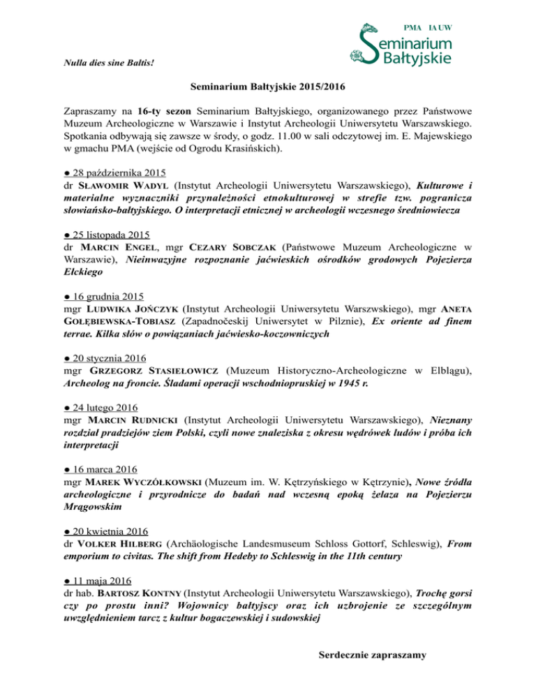 Nulla dies sine Baltis! Seminarium Bałtyjskie 2015/2016 Zapraszamy na 16-ty sezon Seminarium Bałtyjskiego, organizowanego przez Państwowe Muzeum Archeologiczne w Warszawie i Instytut Archeologii Uniwersytetu Warszawskiego. Spotkania odbywają się zawsze w środy, o godz. 11.00 w sali odczytowej im. E. Majewskiego w gmachu PMA (wejście od Ogrodu Krasińskich). ● 28 października 2015 dr SŁAWOMIR WADYL (Instytut Archeologii Uniwersytetu Warszawskiego), Kulturowe i materialne wyznaczniki przynależności etnokulturowej w strefie tzw. pogranicza słowiańsko-bałtyjskiego. O interpretacji etnicznej w archeologii wczesnego średniowiecza ● 25 listopada 2015 dr MARCIN ENGEL, mgr CEZARY SOBCZAK (Państwowe Muzeum Archeologiczne w Warszawie), Nieinwazyjne rozpoznanie jaćwieskich ośrodków grodowych Pojezierza Ełckiego ● 16 grudnia 2015 mgr LUDWIKA JOŃCZYK (Instytut Archeologii Uniwersytetu Warszwskiego), mgr ANETA GOŁĘBIEWSKA-TOBIASZ (Zapadnočeskij Uniwersytet w Pilznie), Ex oriente ad finem terrae. Kilka słów o powiązaniach jaćwiesko-koczowniczych ● 20 stycznia 2016 mgr GRZEGORZ STASIEŁOWICZ (Muzeum Historyczno-Archeologiczne w Elblągu), Archeolog na froncie. Śladami operacji wschodniopruskiej w 1945 r. ● 24 lutego 2016 mgr MARCIN RUDNICKI (Instytut Archeologii Uniwersytetu Warszawskiego), Nieznany rozdział pradziejów ziem Polski, czyli nowe znaleziska z okresu wędrówek ludów i próba ich interpretacji ● 16 marca 2016 mgr MAREK WYCZÓŁKOWSKI (Muzeum im. W. Kętrzyńskiego w Kętrzynie), Nowe źródła archeologiczne i przyrodnicze do badań nad wczesną epoką żelaza na Pojezierzu Mrągowskim ● 20 kwietnia 2016 dr VOLKER HILBERG (Archäologische Landesmuseum Schloss Gottorf, Schleswig), From emporium to civitas. The shift from Hedeby to Schleswig in the 11th century ● 11 maja 2016 dr hab. BARTOSZ KONTNY (Instytut Archeologii Uniwersytetu Warszawskiego), Trochę gorsi czy po prostu inni? Wojownicy bałtyjscy oraz ich uzbrojenie ze szczególnym uwzględnieniem tarcz z kultur bogaczewskiej i sudowskiej Serdecznie zapraszamy Anna Bitner-Wróblewska Wojciech Wróblewski