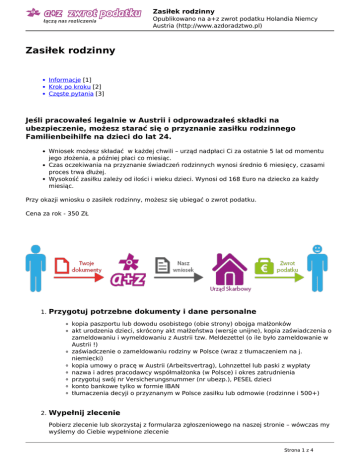 Zasiłek rodzinny Opublikowano na a+z zwrot podatku Holandia Niemcy Austria (http://www.azdoradztwo.pl) Zasiłek rodzinny Informacje [1] Krok po kroku [2] Częste pytania [3] Jeśli pracowałeś legalnie w Austrii i odprowadzałeś składki na ubezpieczenie, możesz starać się o przyznanie zasiłku rodzinnego Familienbeihilfe na dzieci do lat 24. Wniosek możesz składać w każdej chwili – urząd nadpłaci Ci za ostatnie 5 lat od momentu jego złożenia, a później płaci co miesiąc. Czas oczekiwania na przyznanie świadczeń rodzinnych wynosi średnio 6 miesięcy, czasami proces trwa dłużej. Wysokość zasiłku zależy od ilości i wieku dzieci. Wynosi od 168 Euro na dziecko za każdy miesiąc. Przy okazji wniosku o zasiłek rodzinny, możesz się ubiegać o zwrot podatku. Cena za rok - 350 ZŁ 1. Przygotuj potrzebne dokumenty i dane personalne kopia paszportu lub dowodu osobistego (obie strony) obojga małżonków akt urodzenia dzieci, skrócony akt małżeństwa (wersje unijne), kopia zaświadczenia o zameldowaniu i wymeldowaniu z Austrii tzw. Meldezettel (o ile było zameldowanie w Austrii !) zaświadczenie o zameldowaniu rodziny w Polsce (wraz z tłumaczeniem na j. niemiecki) kopia umowy o pracę w Austrii (Arbeitsvertrag), Lohnzettel lub paski z wypłaty nazwa i adres pracodawcy współmałżonka (w Polsce) i okres zatrudnienia przygotuj swój nr Versicherungsnummer (nr ubezp.), PESEL dzieci konto bankowe tylko w formie IBAN tłumaczenia decyji o przyznanym w Polsce zasiłku lub odmowie (rodzinne i 500+) 2. Wypełnij zlecenie Pobierz zlecenie lub skorzystaj z formularza zgłoszeniowego na naszej stronie – wówczas my wyślemy do Ciebie wypełnione zlecenie Strona 1 z 4 Zasiłek rodzinny Opublikowano na a+z zwrot podatku Holandia Niemcy Austria (http://www.azdoradztwo.pl) 3. Dokonaj wpłaty 350 zł (za jeden rok) i odeślij dokumenty 4. Gotowe. Po okresie kilku miesięcy otrzymasz z urzędu Familienkasse decyzję oraz pieniądze na swoje konto. Jeśli nie jesteś pewny jak wysoki otrzymasz zasiłek, czy spełniasz wszystkie warunki i czy możesz uzyskać więcej pieniędzy, skontaktuj się z nami. Ułatwimy Ci podjęcie decyzji. Dla swojego dobra przeczytaj pytania i odpowiedzi w zakładce CZĘSTE PYTANIA. Znajdziesz tam wszystkie dodatkowe informacje na ten temat. Będą Ci pomocne. Przy okazji wniosku o zasiłek rodzinny, możesz się ubiegać o zwrot podatku. Czy mogę ubiegać sie o zasiłek rodzinny gdy dziecko przebywa w Polsce ? Tak, nie ma znaczenia gdzie mieszkają twoje dzieci. Jeśli moje dzieci otrzymywały zasiłek rodzinny w Polsce, to czy otrzymam za ten sam okres zasiłek w Austrii ? Tak. Urząd austriacki wypłaci różnicę między polskim i austriackim zasiłkiem. W krajach Unii Europejskiej stosuje się takie rozwiązanie po to, aby uniknąć sytuacji w której pobierane są dwa zasiłki jednocześnie. Odliczony zostanie polski zasiłek na dziecko jak i świadczenia 500+. Jestem samotnie wychowującym rodzicem pracującym w Austrii. Moje dzieci są pod opieką dziadków w Polsce. Czy mam prawo do zasiłku? Nie. Prawo do zasiłku w tym przypadku ma dziadek lub babcia, ponieważ on/ona wychowuje dzieci. Aby oni mogli się starać o zasiłek, muszą być wspólnie zameldowani z dzieckiem. Czy otrzymam zasiłek na dzieci, które ukończyły 18 lat ? Tak, pod warunkiem, że się uczą, studiują i ich dochód nie przekracza 10 000 eur rocznie. Granica wieku to 24 rok życia. A jeśli dziecko jest niepełnosprawne i nie może wykonywać pracy, to jest możliwość otrzymywania zasiłku przez całe życie dziecka. Na które dzieci można wnioskować o Familienbeihilfe ? Na dzieci własne, adoptowane oraz dzieci należące do współmałżonka z pierwszego małżeństwa. Kto może ubiegać się o zasiłek rodzinny? Tylko i wyłącznie osoby, które opłacają składki społeczne w Austrii. Należą do nich pracownicy zatrudnieni w firmach na "austriackich warunkach". Zwykle są oni zgłoszeni do austriackiego systemu ubezpieczeń społecznych, posiadają nr ubezpieczenia tzw. Versicherungsnummer. To oznacza, że osoby oddelegowane przez polskie firmy opłacające ZUS w Polsce, nie mają prawa do otrzymania zasiłku w Austrii. Jak długo czekam na zasiłek rodzinny ? Kilka miesięcy, ale czasami bywa że dłużej , nawet rok – wszystko zależy jak szybko polskie urzędy (ROPS) potwierdzą dane osobowe osób zamieszkałych w Polsce. Istotne jest również posiadanie decyzji pozytywnych jak i negatywnych o zasiłku na dzieci lub św. 500+. Dlaczego Regionalny Ośrodek Polityki Społecznej ROPS kazał mi skompletować jakieś dokumenty ? Składanie wniosku wiąże się z odwiedzaniem innych urzędów w Polsce – Urzędu Miasta czy Regionalnego Ośrdoka Polityki Społecznej (ROPS). Ten ostatni jest szczególnie odpowiedzialny za poświadczenie danych przed zagranicznym urzędem zasiłkowym. Większość spraw załatwia się korespondencyjnie. Zawsze kompletuje się akty urodzenia dzieci, akt małżeństwa, zameldowanie z Polski, decyzje o przyznanym/ nie przyznanym zasiłku w Polsce itp., kopie dowodów. Urząd wymaga od wnioskodawcy, w przypadku gdy nie otrzymuje/nie otrzymywał zasiłku w Polsce, złożenia wniosku w Polsce po to, by mieć zaświadczenie z jakiego powodu odmówiono polskiego zasiłku. Warto mieć już wcześniej, taką negatywną decyzję. Strona 2 z 4 Zasiłek rodzinny Opublikowano na a+z zwrot podatku Holandia Niemcy Austria (http://www.azdoradztwo.pl) Jak dowiem się o przyznanym zasiłku ? Drogą pocztową otrzymasz kopertę z decyzją z urzędu Finanzamt z odpowiednim uzasadnieniem, co Ci przysługuje, w jakiej kwocie, za jaki okres i na które dziecko. Decyzja może mieć nazwę Ausgleichszahlung, Differenzzahlung, Jakiej wysokości należy mi się zasiłek ? Postawowa kwota miesięczna przysługująca na każde dziecko, w zależności od wieku dzieci: Wiek dziecko dziecko dziecko dziecko poniżej 3 lat powyżej 3 lat powyżej 10 lat pow