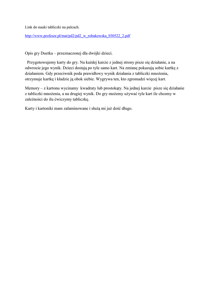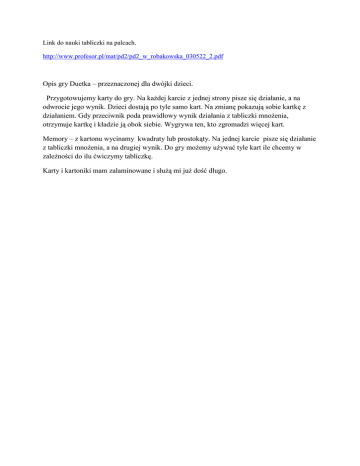 Link do nauki tabliczki na palcach. http://www.profesor.pl/mat/pd2/pd2_w_robakowska_030522_2.pdf Opis gry Duetka – przeznaczonej dla dwójki dzieci. Przygotowujemy karty do gry. Na każdej karcie z jednej strony pisze się działanie, a na odwrocie jego wynik. Dzieci dostają po tyle samo kart. Na zmianę pokazują sobie kartkę z działaniem. Gdy przeciwnik poda prawidłowy wynik działania z tabliczki mnożenia, otrzymuje kartkę i kładzie ją obok siebie. Wygrywa ten, kto zgromadzi więcej kart. Memory – z kartonu wycinamy kwadraty lub prostokąty. Na jednej karcie pisze się działanie z tabliczki mnożenia, a na drugiej wynik. Do gry możemy używać tyle kart ile chcemy w zależności do ilu ćwiczymy tabliczkę. Karty i kartoniki mam zalaminowane i służą mi już dość długo.