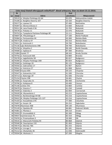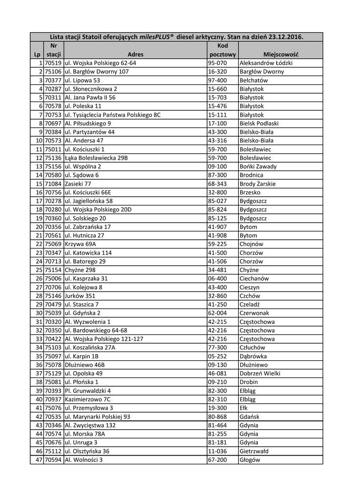 Lista stacji Statoil oferujących milesPLUS® diesel arktyczny. Stan na dzień 23.12.2016. Lp 1 2 3 4 5 6 7 8 9 10 11 12 13 14 15 16 17 18 19 20 21 22 23 24 25 26 27 28 29 30 31 32 33 34 35 36 37 38 39 40 41 42 43 44 45 46 47 Nr stacji 70519 75106 70377 70287 70311 70578 70753 70697 70384 70573 75011 75136 75156 70580 71084 70756 70278 70280 70360 70356 70561 75069 70347 70713 75154 75006 70706 75146 70479 75039 70320 70350 70422 75103 75097 75078 75129 75081 70393 70937 75076 70535 70346 70574 70676 75112 70594 Adres ul. Wojska Polskiego 62-64 ul. Bargłów Dworny 107 ul. Lipowa 53 ul. Słonecznikowa 2 Al. Jana Pawła II 56 ul. Poleska 11 ul. Tysiąclecia Państwa Polskiego 8C Al. Piłsudskiego 9 ul. Partyzantów 44 Al. Andersa 47 ul. Kościuszki 1 Łąka Bolesławiecka 29B ul. Wspólna 2 ul. Sądowa 6 Zasieki 77 ul. Kościuszki 66E ul. Jagiellońska 58 ul. Wojska Polskiego 20D ul. Solskiego 20 ul. Zabrzańska 17 ul. Hutnicza 27 Krzywa 69A ul. Katowicka 114 ul. Batorego 29 Chyżne 298 ul. Kasprzaka 31 ul. Kolejowa 8 Jurków 351 ul. Staszica 7 ul. Gdyńska 2 Al. Wyzwolenia 1 ul. Bardowskiego 64-68 Al. Wojska Polskiego 121-127 ul. Koszalińska 27A ul. Karpin 1B Dłużniewo 46B ul. Opolska 49 ul. Płońska 1 Pl. Grunwaldzki 4 Kazimierzowo 7C ul. Przemysłowa 3 ul. Marynarki Polskiej 93 Al. Zwycięstwa 132 ul. Morska 78A ul. Unruga 3 ul. Olsztyńska 36 Al. Wolności 3 Kod pocztowy 95-070 16-320 97-400 15-660 15-703 15-476 15-111 17-100 43-300 43-316 59-700 59-700 09-100 87-300 68-343 32-800 85-027 85-824 85-125 41-907 41-908 59-225 41-500 41-506 34-481 06-400 43-400 32-860 41-250 62-004 42-215 42-216 42-216 77-300 05-252 09-130 46-081 09-210 82-300 82-310 19-300 80-868 81-464 81-255 81-181 11-036 67-200 Miejscowość Aleksandrów Łódzki Bargłów Dworny Bełchatów Białystok Białystok Białystok Białystok Bielsk Podlaski Bielsko-Biała Bielsko-Biała Bolesławiec Bolesławiec Bońki Zawady Brodnica Brody Żarskie Brzesko Bydgoszcz Bydgoszcz Bydgoszcz Bytom Bytom Chojnów Chorzów Chorzów Chyżne Ciechanów Cieszyn Czchów Czeladź Czerwonak Częstochowa Częstochowa Częstochowa Człuchów Dąbrówka Dłużniewo Dobrzeń Wielki Drobin Elbląg Elbląg Ełk Gdańsk Gdynia Gdynia Gdynia Gietrzwałd Głogów 48 49 50 51 52 53 54 55 56 57 58 59 60 61 62 63 64 65 66 67 68 69 70 71 72 73 74 75 76 77 78 79 80 81 82 83 84 85 86 87 88 89 90 91 92 93 94 95 96 97 75139 70461 70593 70282 70283 75160 75082 70309 75068 75032 75126 75137 70551 75149 70447 75123 70478 70497 70691 75151 70307 70239 70498 70615 75075 70297 70774 71073 70666 75101 70857 75086 70420 70432 70433 70517 70548 70556 70590 70437 70680 71036 70471 75159 70564 75083 70557 75073 70344 70245 Suchatówka 15 ul. Żwirki I Wigury 8 ul. Sportowa 3 ul. Piłsudskiego 12 ul. Warszawska 70 Broniszew 74 Janówek 16 ul. Piłsudskiego 2 ul. Jeleniogórska 7E Harklowa Czyżówek 123 Kozubek 1 ul. 3-go Maja 85A ul. Kruhel Pełkiński 72 Al. Piłsudskiego 2 ul. Bielska 56 Al. Piłsudskiego 55 ul. Grunwaldzka 4 ul. Sudecka 40-42 Juszczyn 690 ul. Podmiejska 22B ul. Warszawska 182 ul. Źródłowa 14 ul. Moniuszki 1 ul. Szczecińska 95 ul. Sikorskiego 1 ul. Krakusa I Wandy 32 ul. Morska 152 ul. Warszawska 9 Gręzów 9 ul. Rejtana 3A ul. Warszawska 34 Kraczkowa 1440 ul. Wielicka 183 ul. Powstańców Wielkopolskich 17 Al. Jana Pawła II 200 ul. Armii Krajowej 10 os. Dywizjonu 303 21A ul. Lublańska 16A ul. Mogilska 81 ul. Podkarpacka 3A ul. Koźmińska 60 ul. Krze Duże 22A ul. Słone 131A ul. Holenderska 12 ul. Gwarna/Muzealna ul. Baworowo 51A ul. Abrahama 2 ul. Skępska 31 ul. Piłsudskiego 1 Al. Kraśnicka 3 88-140 62-200 38-300 66-400 66-400 05-610 05-600 86-300 59-820 34-434 68-120 34-480 37-500 37-500 44-335 43-384 43-600 58-500 58-500 34-231 62-800 25-408 25-335 46-200 78-100 66-470 75-232 75-237 08-130 58-530 26-900 37-124 30-663 30-553 31-982 30-150 31-873 31-410 31-545 38-400 63-700 96-325 57-350 99-300 59-220 59-820 84-300 87-600 59-300 20-718 Gniewkowo Gniezno Gorlice Gorzów Wielkopolski Gorzów Wielkopolski Goszczyn Grójec Grudziądz Gryfów Śląski Harklowa Iłowa Jabłonka Jarosław Jarosław Jastrzębie Zdrój Jaworze Jaworzno Jelenia Góra Jelenia Góra Juszczyn Kalisz Kielce Kielce Kluczbork Kołobrzeg Kostrzyn Nad Odrą Koszalin Koszalin Kotuń Kowary Kozienice Kraczkowa Kraków Kraków Kraków Kraków Kraków Kraków Kraków Krosno Krotoszyn Krze Duże Kudowa Zdrój Kutno Legnica Leśna Lębork Lipno Lubin Lublin 98 99 100 101 102 103 104 105 106 107 108 109 110 111 112 113 114 115 116 117 118 119 120 121 122 123 124 125 126 127 128 129 130 131 132 133 134 135 136 137 138 139 140 141 142 143 144 145 146 147 70247 70484 70641 70777 75104 75143 75165 75114 70330 70264 70270 70284 70288 70291 70396 70457 70864 75150 70558 75117 71064 75144 75074 75020 75155 75118 70355 75067 70440 70758 70234 70271 70272 70545 75111 75145 70734 70452 75089 70331 71153 70358 70651 70744 70336 70833 70482 75090 70518 75133 Al. Tysiąclecia 12 ul. Jana Pawła II 15 ul. Łęczyńska 45 ul. Kunickiego 141A Mostki Rakowice Wielkie 1D ul. Warszawska 77E ul. Kępińska 1A Al. Legionów 58 ul. Prądzyńskiego 1-3 ul. Przybyszewskiego 199-205 Al. Piłsudskiego 177 Al. Wyszyńskiego 27 ul. Rzgowska 211 Al. Włókniarzy 202 ul. Zgierska 65 ul. Zgierska 104 ul. Gdańska ul. Kopernika 22 ul. Brzeska 10 ul. Nowomyśliwska 88 ul. Przemysłowa 1 Al. Wojska Polskiego 1A ul. Kielecka 29 Raba Niżna 320 ul. Bieszczadzka 59 ul. Kilińskiego 64 ul. Przyłęk 113A ul. Sławkowska 32 ul. Rabsztyńska 2B ul. Leonharda 9 ul. Śliwy 2 ul. Pstrowskiego 10 ul. Lubelska 10A ul. Poprzeczna 11D Olszyny 190 Wojnowice 72 ul. Sosnkowskiego 18 Osła 1F ul. Żebrowskiego 12 ul. Obozowa 3 ul. Zagłoby 2 Al. Jana Pawła II 75 Grabin 22 ul. Raszkowska 70 ul. Sikorskiego 41C ul. Dąbrowskiego 32 ul. Szosa Lubelska 36 ul. Łaska 3-5 Słupia 135A 20-121 20-535 20-313 20-459 66-218 59-600 08-450 63-645 18-400 93-478 93-120 92-332 94-048 93-317 91-073 91-463 91-303 87-148 82-200 21-560 72-50