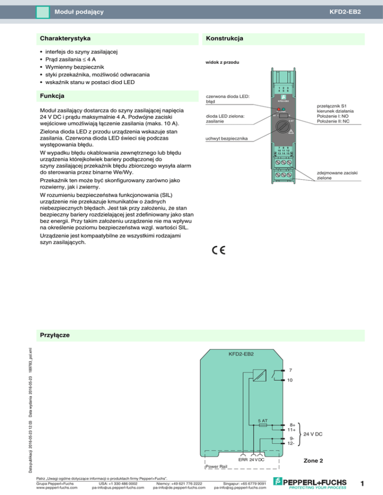Moduł podający Charakterystyka • • • • • interfejs do szyny zasilającej Prąd zasilania ≤ 4 A Wymienny bezpiecznik styki przekaźnika, możliwość odwracania wskaźnik stanu w postaci diod LED Funkcja Moduł zasilający dostarcza do szyny zasilającej napięcia 24 V DC i prądu maksymalnie 4 A. Podwójne zaciski wejściowe umożliwiają łączenie zasilania (maks. 10 A). Zielona dioda LED z przodu urządzenia wskazuje stan zasilania. Czerwona dioda LED świeci się podczas występowania błędu. KFD2-EB2 Konstrukcja widok z przodu 1 2 4 5 czerwona dioda LED: błąd 3 6 KFD2-EB2 ERR PWR dioda LED zielona: zasilanie S1 I II 5 AT przełącznik S1 kierunek działania Położenie I: NO Położenie II: NC ! uchwyt bezpiecznika 7 8 9 10 11 12 13 14 15 W wypadku błędu okablowania zewnętrznego lub błędu urządzenia którejkolwiek bariery podłączonej do szyny zasilającej przekaźnik błędu zbiorczego wysyła alarm do sterowania przez binarne We/Wy. zdejmowane zaciski zielone Przekaźnik ten może być skonfigurowany zarówno jako rozwierny, jak i zwierny. W rozumieniu bezpieczeństwa funkcjonowania (SIL) urządzenie nie przekazuje kmunikatów o żadnych niebezpiecznych błędach. Jest tak przy założeniu, że stan bezpieczny bariery rozdzielającej jest zdefiniowany jako stan bez energii. Przy takim założeniu urządzenie nie ma wpływu na określenie poziomu bezpieczeństwa wzgl. wartości SIL. Urządzenie jest kompaatybilne ze wszystkimi rodzajami szyn zasilających. Data wydania 2016-05-23 189783_pol.xml Przyłącze KFD2-EB2 7 10 Data publikacji 2016-05-23 12:03 5 AT 8+ 11+ 912- ERR 24 V DC Power Rail Patrz „Uwagi ogólne dotyczące informacji o produktach firmy Pepperl+Fuchs”. Grupa Pepperl+Fuchs USA: +1 330 486 0002 Niemcy: +49 621 776 2222 www.pepperl-fuchs.com [email protected] [email protected] Singapur: +65 6779 9091 [email protected] 24 V DC Zone 2 1 Dane techniczne KFD2-EB2 Zasilanie Przyłącze Napięcie znamionowe zaciski 11+, 12zaciski 8+, 9Un Strata mocy 20 ... 30 V DC Nie można przekroczyć maksymalnego napięcia znamionowego przyrządów podłączonych do szyny zasilającej. ≤1W Wyjście Zasilanie prąd wyjściowy: ≤ 4 A Sygnał błędu wyjście przekaźnikowe: zestyk zwierny obciążenie styku 30 V AC/ 2 A / cos φ ≥ 0,7 ; 40 V DC/ 2 A Opóżnienie przyciągania / opadania kotwiczki ok. 20 ms / ok. 20 ms Wartość znamionowa bezpiecznika 5A zalecany maksymalny poziom obciążenia bezpiecznika: 80% Zgodność z dyrektywami Kompatybilność elektromagnetyczna Dyrektywa 2014/30/UE EN 61326-1:2013 (lokalizacja ośrodków przemysłowych) Zgodnożć Kompatybilność elektromagnetyczna NE 21:2006 Stopień ochrony IEC 60529:2001 Warunki otoczenia Temperatura otoczenia -20 ... 60 °C (-4 ... 140 °F) Specyfikacja mechaniczna Stopień ochrony IP 20 Masa ok. 100 g Wymiary 20 × 119 × 115 mm , typ obudowy B2 Montaż montaż na szynie znormalizowanej 35 mm wg EN 60715:2001 Dane dotyczące stosowania w obszarach Ex Deklaracja zgodności Grupa, kategoria, typ ochrony, klasa temperaturowa TÜV 00 ATEX 1618 X ¬ II 3G Ex nA nC IIC T4 Zgodność z dyrektywami Dyrektywa 2014/34/UE EN 60079-0:2012+A11:2013 , EN 60079-15:2010 Atesty międzynarodowe Atest FM Schemat montażowy 116-0160 Zatwierdzono dla klasa I, strefa 2, grupy A, B, C, D; klasa I, strefa 2, IIC Atest UL Zatwierdzono dla klasa I, strefa 2, grupy A, B, C, D; klasa I, strefa 2, IIC Certyfikat CSA Schemat montażowy 116-0160 Zatwierdzono dla klasa I, strefa 2, grupy A, B, C, D; klasa I, strefa 2, IIC Atest IECEx Zatwierdzono dla IECEx UL 16.0051 Ex nA nC IIC T4 Gc Informacja uzupełniająca Stosownie do wymagań należy przestrzegać informacji na temat zgodności, deklaracji zgodności, atestów zgodności i instrukcji. Aby uzyskać więcej informacji, zob. www.pepperl-fuchs.com. Data publikacji 2016-05-23 12:03 Data wydania 2016-05-23 189783_pol.xml Informacje ogólne Patrz „Uwagi ogólne dotyczące informacji o produktach firmy Pepperl+Fuchs”. Grupa Pepperl+Fuchs USA: +1 330 486 0002 Niemcy: +49 621 776 2222 www.pepperl-fuchs.com [email protected] [email protected] Singapur: +65 6779 9091 [email protected] 2 Dane techniczne KFD2-EB2 Akcesoria Moduł dostarczania prądu stałego KFD2-EB2 Ten moduł dostarczania prądu stałego jest wykorzystywany do łączenia urządzeń 24 V DC za pomocą szyny zasilania. Wyposażony w bezpiecznik moduł dostarczania prądu stałego może obsługiwać do 150 pojedynczych urządzeń, w zależności od poziomu zużycia energii przez poszczególne urządzenia. Styki mechaniczne z galwaniczną izolacją używają szyny zasilania do przekazywania zebranych komunikatów błędów. Szyna zasilania UPR-03 (Power Rail) Szyna zasilania UPR-03 to kompletna jednostka składająca się z gniazd elektrycznych i szyny profilu aluminiowego o wymiarach 35 mm x 15 mm. Aby działała, wystarczy po prostu podłączyć urządzenia. Szyna profilowa K-DUCT z szyną zasilania Szyna profilowa K-DUCT to profil aluminiowy z umieszczoną w nim szyną zasilania i dwoma zintegrowanymi kanałami kablowymi do kabli systemowych i połączeniowych. Zestaw ten nie wymaga zatem użycia żadnych dodatkowych kabli. Data publikacji 2016-05-23 12:03 Data wydania 2016-05-23 189783_pol.xml Szyna zasilania i szyna profilowa nie musz¹ byæ pod³¹czone za pomoc¹ zacisków do poszczególnych urz¹dzeñ! Patrz „Uwagi ogólne dotyczące informacji o produktach firmy Pepperl+Fuchs”. Grupa Pepperl+Fuchs USA: +1 330 486 0002 Niemcy: +49 621 776 2222 www.pepperl-fuchs.com [email protected] [email protected] Singapur: +65 6779 9091 [email protected] 3