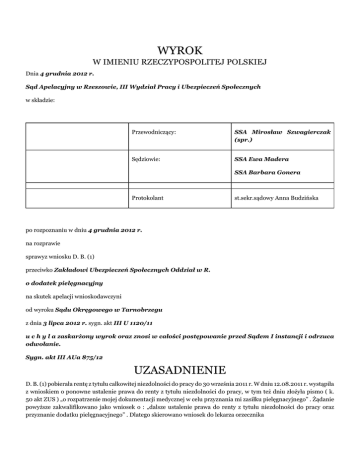WYROK W IMIENIU RZECZYPOSPOLITEJ POLSKIEJ Dnia 4 grudnia 2012 r. Sąd Apelacyjny w Rzeszowie, III Wydział Pracy i Ubezpieczeń Społecznych w składzie: Przewodniczący: SSA Mirosław Szwagierczak (spr.) Sędziowie: SSA Ewa Madera SSA Barbara Gonera Protokolant st.sekr.sądowy Anna Budzińska po rozpoznaniu w dniu 4 grudnia 2012 r. na rozprawie sprawyz wniosku D. B. (1) przeciwko Zakładowi Ubezpieczeń Społecznych Oddział w R. o dodatek pielęgnacyjny na skutek apelacji wnioskodawczyni od wyroku Sądu Okręgowego w Tarnobrzegu z dnia 3 lipca 2012 r. sygn. akt III U 1120/11 u c h y l a zaskarżony wyrok oraz znosi w całości postępowanie przed Sądem I instancji i odrzuca odwołanie. Sygn. akt III AUa 875/12 UZASADNIENIE D. B. (1) pobierała rentę z tytułu całkowitej niezdolności do pracy do 30 września 2011 r. W dniu 12.08.2011 r. wystąpiła z wnioskiem o ponowne ustalenie prawa do renty z tytułu niezdolności do pracy, w tym też dniu złożyła pismo ( k. 50 akt ZUS ) „o rozpatrzenie mojej dokumentacji medycznej w celu przyznania mi zasiłku pielęgnacyjnego” . Żądanie powyższe zakwalifikowano jako wniosek o : „dalsze ustalenie prawa do renty z tytułu niezdolności do pracy oraz przyznanie dodatku pielęgnacyjnego” . Dlatego skierowano wniosek do lekarza orzecznika o ustalenie „czy istnieje niezdolność do pracy , a jeżeli tak to od kiedy? . Trwale czy okresowo? Czy istnieje niezdolność do samodzielnej egzystencji , a jeżeli tak to od kiedy?. Trwale czy okresowo?” ( v. – k. 155 akt ZUS ) . Orzeczeniem z dnia 23.09.2011 roku lekarz orzecznik ZUS stwierdził , że D. B. (1) jest nadal całkowicie niezdolna do pracy – do 30.09.2016 r. Nie jest niezdolna do samodzielnej egzystencji ( v. – k. 156 ) . Orzeczenie to zostało doręczone wnioskodawczyni w dniu 30.09.2011 r. Od tego orzeczenia D. B. nie złożyła sprzeciwu do komisji lekarskiej ZUS – będąc prawidłowo pouczona o terminie i trybie złożenia tegoż sprzeciwu ( v. – k. 156 odwrót ) . Decyzją z dnia 10.10.2011 r. przyznano D. B. (1) prawo do renty z tytułu całkowitej niezdolności do pracy do 30.09.2016 roku . Decyzję wydano „po rozpatrzeniu wniosku z dnia 12.08.2011 r.” Nie stwierdzono w niej , iż do renty przysługuje dodatek pielęgnacyjny ( v. pkt IV ust 1 ) . Od powyższej decyzji ubezpieczona złożyła odwołanie , w którym domagała się przyznania zasiłku pielęgnacyjnego ( v. odwołanie k. 2 akt sprawy ) . Odpowiadając na odwołanie organ rentowy wniósł o odrzucenie odwołania na podstawie art. 4779 § 31 kpc wobec niewyczerpania trybu odwoławczego z art. 14 ust 2a ustawy emerytalno – rentowej . W toku postępowania odwoławczego sąd orzekający przeprowadził dowód z opinii lekarza okulisty , który w opinii z dnia 24.I. 2012 r., oraz w opiniach uzupełniających z dnia 23.03.2012 r. , 10.05.12 r., - nie uznał odwołującej za osobę niezdolną do samodzielnej egzystencji . Wyrokiem z dnia 3 lipca 2012 r. Sąd Okręgowy Sąd Pracy i Ubezpieczeń Społecznych w Tarnobrzegu – w sprawie o dodatek pielęgnacyjny – oddalił odwołanie p. D. B. – wobec nie spełnienia przez nią przesłanek z art. 75 ustawy emerytalnej , a to braku u wnioskodawczyni niezdolności do samodzielnej egzystencji. Ubezpieczona D. B. (1) złożyła apelację domagając się przyznania „ prawa do zasiłku pielęgnacyjnego” oraz „zbadania ponownie sprawy” – powołując się na zły stan swojego wzroku . Organ rentowy nie odniósł się do apelacji . Rozpoznając sprawę Sąd Apelacyjny ustalił i rozważył co następuje: 1 Dodatek pielęgnacyjny , stosownie do art. 75 ustawy o emeryturach i rentach z F.U.S. ( Dz. U. z 2009 r. Nr 153 , poz. 1227 ze zm.) , przysługuje osobie uprawnionej do emerytury lub renty , jeżeli osoba ta została uznana za całkowicie niezdolną do pracy oraz samodzielnej egzystencji lub ukończyła 75 lat życia . Decyzja z dnia 10 października 2011 r. , nakierowana postępowaniem w celu ustalenia czy wnioskodawczyni D. B. (1) jest osobą niezdolną do samodzielnej egzystencji – przy stwierdzonej całkowitej niezdolności do pracy , zawiera implice ( v. – brak pozytywnego wpisu w pkt IV ust 1 ) odmowę przyznania dodatku pielęgnacyjnego . Co też oznacza istnienie przedmiotu zaskarżenia odwołaniem – w rozumieniu procesowym . Pani D. B. (1) przysługiwało prawo wniesienia w 14 dniowym terminie sprzeciwu , w trybie art. 14 ust 2a ustawy o emeryturach i rentach z F.U.S. , do komisji lekarskiej ZUS . Z prawa tego nie skorzystała ( v. oświadczenie odwołującej złożone na rozprawie apelacyjnej – 00:04:31 oraz twierdzenia ZUS – k. 4 ) . Fakt ten sam w sobie uzasadnia zastosowanie art. 477 9 § 31 kpc , gdyż odwołanie kwestionujące nieprzyznanie dodatku opiera się wyłącznie na zarzutach dotyczących oceny stanu zdrowia odwołującej , czyli kwestii ujętych w art. 14 ust 1 pkt 1—5 ustawy emerytalnej . Inaczej mówiąc; lekarz orzecznik ZUS nie uznał p. D. B. (1) za niezdolną do samodzielnej egzystencji . Ona zaś nie złożyła sprzeciwu od tego orzeczenia . Złożyła natomiast odwołanie od decyzji organu rentowego , której podstawą było orzeczenie lekarza orzecznika , z którego wynikał brak spełnienia przesłanki do przyznania prawa do dodatku pielęgnacyjnego . Wystąpiły , więc przesłanki do zastosowania art. 4779 § 31 kpc , czego zresztą Sąd I instancji błędnie nie uczynił – wobec czasowego braku otwarcia drogi do postępowania sądowego . Dlatego też Sąd II instancji zobowiązany był , przy zastosowaniu art. 378 § 1 kpc oraz art. 477 9 § 31 kpc w związku z art. 199 § 1 kpc – orzec jak w sentencji .Biorąc z urzędu pod uwagę nieważność postępowania , gdyż rygory procesowe są ustanowione nie tylko dla ochrony praw i interesów procesowych konkretnych stron ale i ku temu interesowi wymiaru sprawiedliwości ( por. uzasadnienie uchwały 7 sędziów SN z 8 lipca 2008 r. – III CZP 154/07 