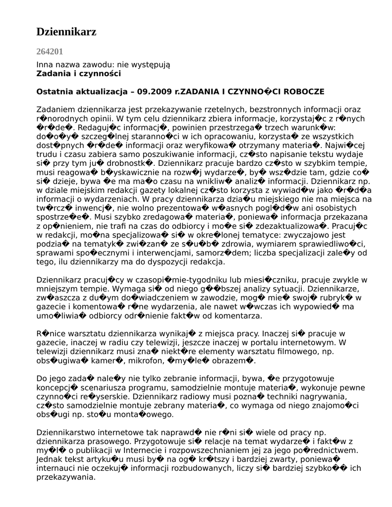 Dziennikarz 264201 Inna nazwa zawodu: nie występują Zadania i czynności Ostatnia aktualizacja – 09.2009 r.ZADANIA I CZYNNO�CI ROBOCZE Zadaniem dziennikarza jest przekazywanie rzetelnych, bezstronnych informacji oraz r�norodnych opinii. W tym celu dziennikarz zbiera informacje, korzystaj�c z r�nych �r�de�. Redaguj�c informacj�, powinien przestrzega� trzech warunk�w: do�o�y� szczeg�lnej staranno�ci w ich opracowaniu, korzysta� ze wszystkich dost�pnych �r�de� informacji oraz weryfikowa� otrzymany materia�. Najwi�cej trudu i czasu zabiera samo poszukiwanie informacji, cz�sto napisanie tekstu wydaje si� przy tym ju� drobnostk�. Dziennikarz pracuje bardzo cz�sto w szybkim tempie, musi reagowa� b�yskawicznie na rozw�j wydarze�, by� wsz�dzie tam, gdzie co� si� dzieje, bywa �e ma ma�o czasu na wnikliw� analiz� informacji. Dziennikarz np. w dziale miejskim redakcji gazety lokalnej cz�sto korzysta z wywiad�w jako �r�d�a informacji o wydarzeniach. W pracy dziennikarza dzia�u miejskiego nie ma miejsca na tw�rcz� inwencj�, nie wolno prezentowa� w�asnych pogl�d�w ani osobistych spostrze�e�. Musi szybko zredagowa� materia�, poniewa� informacja przekazana z op�nieniem, nie trafi na czas do odbiorcy i mo�e si� zdezaktualizowa�. Pracuj�c w redakcji, mo�na specjalizowa� si� w okre�lonej tematyce: zwyczajowo jest podzia� na tematyk� zwi�zan� ze s�u�b� zdrowia, wymiarem sprawiedliwo�ci, sprawami spo�ecznymi i interwencjami, samorz�dem; liczba specjalizacji zale�y od tego, ilu dziennikarzy ma do dyspozycji redakcja. Dziennikarz pracuj�cy w czasopi�mie-tygodniku lub miesi�czniku, pracuje zwykle w mniejszym tempie. Wymaga si� od niego g��bszej analizy sytuacji. Dziennikarze, zw�aszcza z du�ym do�wiadczeniem w zawodzie, mog� mie� swoj� rubryk� w gazecie i komentowa� r�ne wydarzenia, ale nawet w�wczas ich wypowied� ma umo�liwia� odbiorcy odr�nienie fakt�w od komentarza. R�nice warsztatu dziennikarza wynikaj� z miejsca pracy. Inaczej si� pracuje w gazecie, inaczej w radiu czy telewizji, jeszcze inaczej w portalu internetowym. W telewizji dziennikarz musi zna� niekt�re elementy warsztatu filmowego, np. obs�ugiwa� kamer�, mikrofon, �my�le� obrazem�. Do jego zada� nale�y nie tylko zebranie informacji, bywa, �e przygotowuje koncepcj� scenariusza programu, samodzielnie montuje materia�, wykonuje pewne czynno�ci re�yserskie. Dziennikarz radiowy musi pozna� techniki nagrywania, cz�sto samodzielnie montuje zebrany materia�, co wymaga od niego znajomo�ci obs�ugi np. sto�u monta�owego. Dziennikarstwo internetowe tak naprawd� nie r�ni si� wiele od pracy np. dziennikarza prasowego. Przygotowuje si� relacje na temat wydarze� i fakt�w z my�l� o publikacji w Internecie i rozpowszechnianiem jej za jego po�rednictwem. Jednak tekst artyku�u musi by� na og� kr�tszy i bardziej zwarty, poniewa� internauci nie oczekuj� informacji rozbudowanych, liczy si� bardziej szybko�� ich przekazywania. Dziennikarze cz�sto specjalizuj� si� w okre�lonych bran�ach, np. mo�na m�wi� o dziennikarstwie politycznym, sportowym, naukowym, biznesowym, �ledczym. Wymaga to od dziennikarzy wielu umiej�tno�ci, znajomo�ci bran�y, stosowania j�zyka informacji, trafiaj�cego do odbiorc�w. Specjalizacja sprzyja doskonaleniu warsztatu, budowaniu i utrzymywaniu kontakt�w z r�nymi �rodowiskami. Dotyczy to jednak tylko du�ych o�rodk�w miejskich, gdzie jest wiele medi�w i du�a konkurencja. W mniejszych o�rodkach, gdzie jest jedna gazeta, czy rozg�o�nia radiowa b�d� telewizyjna, dziennikarze zajmuj� si� r�norodnymi informacjami, nie s� specjalistami w okre�lonej dziedzinie. Dziennikarz musi zna� bardzo dobrze j�zyk polski i stale pracowa� nad swoim warsztatem, rozszerza� s�ownictwo. Bardzo po��dana jest znajomo�� j�zyk�w obcych, co mo�e wp�yn�� na mo�liwo�� rozwoju kariery, np. mo�na zosta� korespondentem zagranicznym, dokonywa� wywiad�w z r�nymi lud�mi w ich j�zykach. Niewielu dziennikarzy bywa zatrudnionych na podstawie umowy o prac�, wi�kszo�� z nich, zw�aszcza na pocz�tku pracy oraz w lokalnych mediach, pracuje na podstawie umowy o dzie�o lub s� tzw. �wolnymi strzelcami�, kt�rzy dopiero chc� �sprzeda� gotowy materia�. Media s� uznawane za czwart� w�adz� w pa�stwie, a ranga zawodu dziennikarza stale ro�nie. To nak�ada na dziennikarzy dodatkow� odpowiedzialno�� za s�owo. Wa�ne jest, aby mie� co� do powiedzenia, umie� to przekaza� w spos�b ciekawy i w atrakcyjnej formie. Warto pisa� ju� na studiach, �eby zaistnie� w zawodzie jak najszybciej. W tym zawodzie cz�sto zaciera si� granica mi�dzy �yciem prywatnym a zawodowym, dziennikarzem jest si� przez ca�e �ycie, bez wzgl�du na to, gdzie si� jest i ile ma si� lat.
