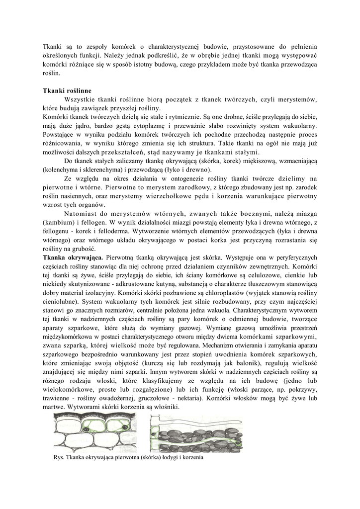 Tkanki są to zespoły komórek o charakterystycznej budowie, przystosowane do pełnienia określonych funkcji. Należy jednak podkreślić, że w obrębie jednej tkanki mogą występować komórki różniące się w sposób istotny budową, czego przykładem może być tkanka przewodząca roślin. Tkanki roślinne Wszystkie tkanki roślinne biorą początek z tkanek twórczych, czyli merystemów, które budują zawiązek przyszłej rośliny. Komórki tkanek twórczych dzielą się stale i rytmicznie. Są one drobne, ściśle przylegają do siebie, mają duże jądro, bardzo gęstą cytoplazmę i przeważnie słabo rozwinięty system wakuolarny. Powstające w wyniku podziału komórek twórczych ich pochodne przechodzą następnie proces różnicowania, w wyniku którego zmienia się ich struktura. Takie tkanki na ogół nie mają już możliwości dalszych przekształceń, stąd nazywamy je tkankami stałymi. Do tkanek stałych zaliczamy tkankę okrywającą (skórka, korek) miękiszową, wzmacniającą (kolenchyma i sklerenchyma) i przewodzącą (łyko i drewno). Ze względu na okres działania w ontogenezie rośliny tkanki twórcze dzielimy na pierwotne i wtórne. Pierwotne to merystem zarodkowy, z którego zbudowany jest np. zarodek roślin nasiennych, oraz merystemy wierzchołkowe pędu i korzenia warunkujące pierwotny wzrost tych organów. Natomiast do mer ystemów wtórnych, zwanych także bocznymi, należą miazga (kambium) i fellogen. W wynik działalności miazgi powstają elementy łyka i drewna wtórnego, z fellogenu - korek i felloderma. Wytworzenie wtórnych elementów przewodzących (łyka i drewna wtórnego) oraz wtórnego układu okrywającego w postaci korka jest przyczyną rozrastania się rośliny na grubość. Tkanka okrywająca. Pierwotną tkanką okrywającą jest skórka. Występuje ona w peryferycznych częściach rośliny stanowiąc dla niej ochronę przed działaniem czynników zewnętrznych. Komórki tej tkanki są żywe, ściśle przylegają do siebie, ich ściany komórkowe są celulozowe, cienkie lub niekiedy skutynizowane - adkrustowane kutyną, substancją o charakterze tłuszczowym stanowiącą dobry materiał izolacyjny. Komórki skórki pozbawione są chloroplastów (wyjątek stanowią rośliny cieniolubne). System wakuolarny tych komórek jest silnie rozbudowany, przy czym najczęściej stanowi go znacznych rozmiarów, centralnie położona jedna wakuola. Charakterystycznym wytworem tej tkanki w nadziemnych częściach rośliny są pary komórek o odmiennej budowie, tworzące aparaty szparkowe, które służą do wymiany gazowej. Wymianę gazową umożliwia przestrzeń międzykomórkowa w postaci charakterystycznego otworu między dwiema komórkami szparkowymi, zwana szparką, której wielkość może być regulowana. Mechanizm otwierania i zamykania aparatu szparkowego bezpośrednio warunkowany jest przez stopień uwodnienia komórek szparkowych, które zmieniając swoją objętość (kurczą się lub rozdymają jak balonik), regulują wielkość znajdującej się między nimi szparki. Innym wytworem skórki w nadziemnych częściach rośliny są różnego rodzaju włoski, które klasyfikujemy ze względu na ich budowę (jedno lub wielokomórkowe, proste lub rozgałęzione) lub ich funkcję (włoski parzące, np. pokrzywy, trawienne - rośliny owadożernej, gruczołowe - nektaria). Komórki włosków mogą być żywe lub martwe. Wytworami skórki korzenia są włośniki. Rys. Tkanka okrywająca pierwotna (skórka) łodygi i korzenia A B Rys. Budowa aparatu szparkowego; A – aparaty widziane z góry, B – schematyczny przekrój poprzeczny przez aparat szparkowy Rys. Włoski; A - prosty jednokomórkowy (pokrzywa), B - rozgałęziony, C - wielokomórkowy gruczołowy Tkanka miękiszowa. Komórki miękiszowe są najczęściej żywe, cienkościenne, dość silnie zwakuolizowane, przystosowane do pełnienia różnych funkcji. W nadziemnych częściach rośliny, w łodydze i liściach, spełniają głównie funkcje asymilacyjne. Miękisz asymilacyjny w związku z tym zawiera liczne chloroplasty. Kształt jego komórek bywa różny, przykładem czego może być miękisz palisadowy lub gąbczasty, typowo zróżnicowany w liściu. Komórki miękiszowe w organach podziemnych rośliny lub w głębszych warstwach łodygi pozbawione są chloroplastów i pełnią głównie funkcje spichrzowe. Rys. Miękisz; A - asymilacyjny, B - spichrzowy ze skrobią (widziany w świetle spolaryzowanym), C - spichrzowy z ziarnami aleuronowymi Tkanka wzmacniająca. Wśród tkanek wzmacniających żywa jest kolenchyma - zwarcica, która spełnia swoje funkcje dzięki obecności grubych ścian celulozowych. Celulozowe zgrubienia mogą mieć różne formy, w związku z czym rozróżniamy kolenchymę kątową i płatową. Komórki kolenchymy są żywe, ściśle ułożone, a dzięki obecności chloroplastów mogą pełnić także funkcje asymilacyjne. Drugi rodzaj tkanki wzmacniającej to sklerenchyma twardzica, którą tworzą komórki martwe, o ścianach inkrustowanych ligniną. Ze względu na cechy morfologiczne komórek tej tkanki wyróżniamy włókna o silnie zmodyfikowanych kształtach i równowymiarowe sklereidy. Rys. Kolenchyma; A - kątowa, B – płatowa Rys. Sklerenchyma; A, B - włókna (A - pokrój ogólny włókna, B - przekrój poprzeczny), C - sklereidy Tkanka przewodząca. Jest typowym przykładem tkanki stałej niejednorodnej. Przewodzi ona wodę z podziemnych części rośliny do liści oraz asymilaty z liści do łodygi i korzeni. Funkcję przewodzenia asymilatów pełnią głównie zespoły komórek, noszące nazwę rurek sitowych. Granice członów w rurkach sitowych wyznaczają ściany poprzeczne charakterystycznie perforowane. Ściany te strukturą swoją przypominają sito, stąd ich nazwa - płytki sitowe. Przez perforacje w ścianie poprzecznej, przy udziale pasm plazmatycznych, asymilaty przedostają się z jednego członu rurki sitowej do drugiego. Rurki 
