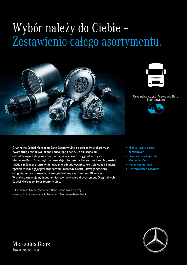 Wybór należy do Ciebie – Zestawienie całego asortymentu. Oryginalne Części Mercedes-Benz EconomyLine do pojazdów ciężarowych gwarantują prawdziwą jakość i przystępną cenę. Dzięki częściom odbudowanym fabrycznie nie trzeba już wybierać. Oryginalne Części Mercedes-Benz EconomyLine pozwalają ciąć koszty bez uszczerbku dla jakości. Każda część jest gruntownie i uważnie odbudowywana, kontrolowana i badana zgodnie z wymagającymi standardami Mercedes-Benz. Oszczędnościami osiągniętymi na surowcach i energii dzielimy się z naszymi Klientami. W efekcie uzyskujemy nieustannie rozwijany szeroki asortyment Oryginalnych Części Mercedes-Benz EconomyLine. O Oryginalne Części Mercedes-Benz EconomyLine pytaj w naszych Autoryzowanych Serwisach Mercedes-Benz Trucks. •Niskie koszty części zamiennych •Gwarantowana jakość Mercedes-Benz •Pełna dostępność •Poszanowanie zasobów Oryginalne Części Mercedes-Benz EconomyLine do samochodów ciężarowych. Obniżaj koszty bez poświęcania jakości. Zespoły Kompletny silnik Głowica cylindra (wstępnie zmontowana) Blok silnika (krótki/długi) Zestaw naprawczy silnika Skrzynia rozdzielcza Skrzynia biegów, automatyczna Skrzynia biegów, manualna Części mechaniczne Sprężarka klimatyzacji Sprężarka powietrza (głowica) Modulator osi Napinacz paska Zacisk hamulcowy Zawór hamulcowy Wałek rozrządu Siłownik sprzęgła Zestaw sprzęgła Tarcza dociskowa sprzęgła Korbowód Wał korbowy Półoś napędowa Koło zamachowe Sprzęgło z retarderem hydrodynamicznym Elementy hydrostatyczne napędu Pompa olejowa Pompa wspomagania układu kierowniczego (hydrauliczna) Wał napędowy Retarder (hydrauliczny układ hamulcowy) Przekładnia kierownicza Wał pośredni skrzyni biegów Wał główny skrzyni biegów Nastawnik skrzyni biegów Turbobrake Turbosprężarka Pompa wody Układy paliwowe i wydechowe Dozownik AdBlue® Moduł pompy AdBlue® Wtryskiwacz silnika wysokoprężnego Pompa wtryskowa silnika wysokoprężnego Filtr cząstek stałych Euro VI Części elektryczne i elektroniczne Alternator Rozrusznik Tachograf Dostępność dla wszystkich modeli nie jest gwarantowana Atego Axor Actros Antos Arocs Econic Zetros Unimog • • • • • • • • • • • • • • • • • • • • • • • • • • • • • • • • • • • • • • • • • • • • • • • • • • • • • • • • • • • • • • • • • • • • • • • • • • • • • • • • • • • • • • • • • • • • • • • • • • • • • • • • • • • • • • • • • • • • • • • • • • • • • • • • • • • • • • • • • • • • • • • • • • • • • • • • Nowość • • • • • • • • • • • • • • • • • • • • • • • • • • • • • • • • • • • • • • • • • • • • • • • • • • • • • • • • • • • • • • • • • • • • • • • • • • • • • • • • • • • • • • • • • • • • • • • • • • • • • • • • • • • • • • • • •