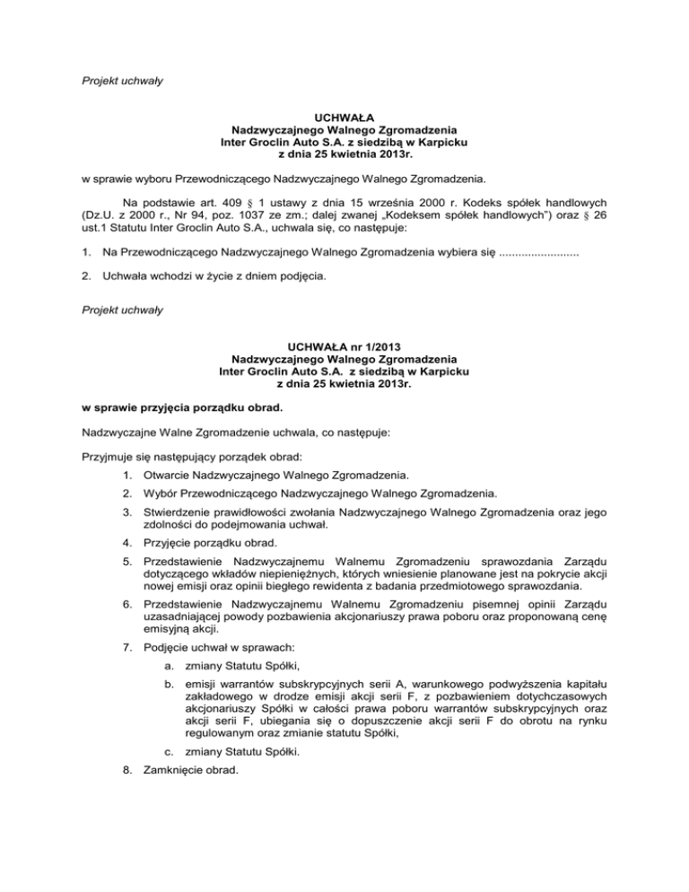 Projekt uchwały UCHWAŁA Nadzwyczajnego Walnego Zgromadzenia Inter Groclin Auto S.A. z siedzibą w Karpicku z dnia 25 kwietnia 2013r. w sprawie wyboru Przewodniczącego Nadzwyczajnego Walnego Zgromadzenia. Na podstawie art. 409 § 1 ustawy z dnia 15 września 2000 r. Kodeks spółek handlowych (Dz.U. z 2000 r., Nr 94, poz. 1037 ze zm.; dalej zwanej „Kodeksem spółek handlowych”) oraz § 26 ust.1 Statutu Inter Groclin Auto S.A., uchwala się, co następuje: 1. Na Przewodniczącego Nadzwyczajnego Walnego Zgromadzenia wybiera się ......................... 2. Uchwała wchodzi w życie z dniem podjęcia. Projekt uchwały UCHWAŁA nr 1/2013 Nadzwyczajnego Walnego Zgromadzenia Inter Groclin Auto S.A. z siedzibą w Karpicku z dnia 25 kwietnia 2013r. w sprawie przyjęcia porządku obrad. Nadzwyczajne Walne Zgromadzenie uchwala, co następuje: Przyjmuje się następujący porządek obrad: 1. Otwarcie Nadzwyczajnego Walnego Zgromadzenia. 2. Wybór Przewodniczącego Nadzwyczajnego Walnego Zgromadzenia. 3. Stwierdzenie prawidłowości zwołania Nadzwyczajnego Walnego Zgromadzenia oraz jego zdolności do podejmowania uchwał. 4. Przyjęcie porządku obrad. 5. Przedstawienie Nadzwyczajnemu Walnemu Zgromadzeniu sprawozdania Zarządu dotyczącego wkładów niepieniężnych, których wniesienie planowane jest na pokrycie akcji nowej emisji oraz opinii biegłego rewidenta z badania przedmiotowego sprawozdania. 6. Przedstawienie Nadzwyczajnemu Walnemu Zgromadzeniu pisemnej opinii Zarządu uzasadniającej powody pozbawienia akcjonariuszy prawa poboru oraz proponowaną cenę emisyjną akcji. 7. Podjęcie uchwał w sprawach: a. zmiany Statutu Spółki, b. emisji warrantów subskrypcyjnych serii A, warunkowego podwyższenia kapitału zakładowego w drodze emisji akcji serii F, z pozbawieniem dotychczasowych akcjonariuszy Spółki w całości prawa poboru warrantów subskrypcyjnych oraz akcji serii F, ubiegania się o dopuszczenie akcji serii F do obrotu na rynku regulowanym oraz zmianie statutu Spółki, c. zmiany Statutu Spółki. 8. Zamknięcie obrad. Projekt uchwały UCHWAŁA nr 2/2013 Nadzwyczajnego Walnego Zgromadzenia Inter Groclin Auto S.A. z siedzibą w Karpicku z dnia 25 kwietnia 2013 roku w sprawie zmiany Statutu Nadzwyczajne Walne Zgromadzenie Inter Groclin Auto Spółki Akcyjnej z siedzibą w Karpicku k. Wolsztyna (dalej: „Spółka”), działając na podstawie art. 419 § 4 i art. 430 §1 Kodeksu spółek handlowych oraz § 21 ust. 2 pkt e) Statutu Spółki, niniejszym uchwala, co następuje: §1 Zmienia się Statut Spółki w ten sposób, że w § 7 dodaje się nowy ust. 3 w następującym brzmieniu: „3. Zniesienie uprzywilejowania akcji następuje za odszkodowaniem. Wysokość oraz termin wypłaty odszkodowania ustala Walne Zgromadzenie. Walne Zgromadzenie może uzależnić wypłatę odszkodowania od warunku albo terminu oraz wprowadzić różne zasady wypłaty w zależności od kwoty odszkodowania należnej akcjonariuszowi.” §2 Na podstawie art. 430 § 5 Kodeksu spółek handlowych upoważnia się Radę Nadzorczą do ustalenia jednolitego tekstu Statutu Spółki uwzględniającego zmianę wprowadzoną niniejszą Uchwałą. §3 Uchwała wchodzi w życie z dniem jej podjęcia, z tym że dokonana na jej podstawie zmiana Statutu wchodzi w życie z chwilą jej wpisania do rejestru przedsiębiorców. Uzasadnienie Propozycja powzięcia wyżej wskazanej uchwały związana jest z zawarciem w dniu 21 marca 2013 r. w Grodzisku Wielkopolskim, warunkowej umowy inwestycyjnej pomiędzy Spółką a: KABEL-TECHNIK-POLSKA Spółką z ograniczoną odpowiedzialnością z siedzibą w Czaplinku, adres: ul. Pławieńska 5, 78-550 Czaplinek, wpisaną do rejestru przedsiębiorców Krajowego Rejestru Sądowego, prowadzonego przez Sąd Rejonowy w Koszalinie, pod numerem KRS: 0000192681 (zwanej dalej „Spółką KTP”), GERSTNER MANAGEMENTHOLDING GmbH z siedzibą w Dreźnie, adres: Enderstrasse 88, 01277 Dresden, wpisaną do Sachsen Amtsgericht Dresden pod numerem HRB: 24951 (zwanej dalej „Spółką GM”), KABELCONCEPT HORNIG GmbH z siedzibą w Teltow, adres: Potsdamer Strasse 19, 14513 Teltow, wpisaną do Brandenburg Amtsgericht Potsdam pod numerem HRB: 21576 (zwanej dalej „Spółką KCH”), Zbigniewem Drzymałą, legitymującym się dowodem osobistym ASD 085679, posiadającym PESEL 50081300812. W związku z zawartą umową inwestycyjną, oczekiwaniem inwestorów jest zniesienie uprzywilejowania akcji serii A, a oczekiwaniem posiadaczy akcji tej serii – zrekompensowanie im istotnego zmniejszenia wartości tych akcji. W związku z powyższym uzasadnione jest wprowadzenie możliwości przyznania przez Walne Zgromadzenie stosownego odszkodowania. W konsekwencji, w świetle ww. umowy inwestycyjnej powzięcie przedmiotowej uchwały jest warunkiem koniecznym realizacji transakcji nabycia udziałów Spółki KTP, której uzasadnienie Zarząd Spółki przedstawił w Sprawozdaniu z dnia 26 marca 2013 r., które zostanie przedstawione Nadzwyczajnemu Walnemu Zgromadzeniu w dniu 25 kwietnia 2013 r. oraz stanowi, obok niniejszego projektu uchwały jeden z dokumentów udostępnionych akcjonariuszom na stronie http://www.groclin.com.pl. Projekt uchwały UCHWAŁA nr 3/2013 Nadzwyczajnego Walnego Zgromadzenia Inter Groclin Auto S.A. z siedzibą w Karpicku z dnia 25 kwietnia 2013 roku w sprawie emisji warrantów subskrypcyjnych serii A, warunkowego podwyższenia kapitału zakładowego w drodze emisji akcji serii F, z pozbawieniem dotychczasowych akcjonariuszy Spółki w całości prawa poboru warrantów subskrypcyjnych oraz akcji serii F, ubiegania się o dopuszczenie akcji serii F do obrotu na rynku regulowanym oraz zmianie statutu Spółki Nadzwyczajne Walne Zgromadzenie Inter Groclin Auto Spółki Akcyjnej z siedzibą w Karpicku k. Wolsztyna (dalej: „Spółka”), działając na podstawie art. 393 pkt 5, art. 448 i art. 453 § 2 i § 3 Kodeksu spółek handlowych oraz § 21 ust. 1 Statutu Spółki, niniejszym u