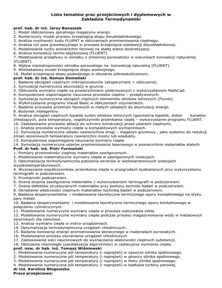 Lista tematów prac przejściowych i dyplomowych w Zakładzie Termodynamiki prof. hab. dr inŜ. Jerzy Banaszek 1. Model obliczeniowy spiralnego magazynu energii. 2. Numeryczny model procesu krzepnięcia stopu dwuskładnikowego. 3. Analiza moŜliwości kodu FLUENT w obliczeniach promieniowania cieplnego. 4. Analiza roli pola grawitacyjnego w procesie krzepnięcia substancji dwuskładnikowej. 5. Modelowanie ruchu powierzchni fazowej na stałej siatce dyskretyzacji. 6. Analiza konwekcji termo-stęŜeniowej (FLUENT). 7. Modelowanie przepływu w ośrodku o zmiennej porowatości w warunkach konwekcji naturalnej (FLUENT). 8. Wpływ nieizotropowości ośrodka porowatego na konwekcję naturalną (FLUENT). 9. Wieloskalowy model krzepnięcia stopu podwójnego. 10. Model krzepnięcia stopu podwójnego w obszarze półnieskończonym. prof. hab. dr inŜ. Roman Domański 1. Badanie obciąŜeń cieplnych mikroprocesorów (eksperyment + obliczenia). 2. Symulacja numeryczna akumulacji w gruncie . 3. Obliczenia wymiany ciepła na powierzchniach uŜebrowanych z wykorzystaniem MathCad. 4. Komputerowe wspomaganie nauczania procesów cieplno – przepływowych. 5. Symulacja numeryczna obciąŜeń cieplnych elementów silników lotniczych (Flunet). 6. Wykorzystanie programu Visual Basic w obliczeniach inŜynierskich. 7. Badanie procesów przemian fazowych w małych układach do akumulacji energii. 8. Budynek inteligentny. 9. Analiza obciąŜeń cieplnych łopatek turbin silników lotniczych (geometria łopatek, dobór kanałów chłodzących, pola temperatury, współczynniki przenikania ciepła – wykorzystanie programu FLUENT. 10. Zastosowanie procesów ablacji do ochrony konstrukcji przed udarami cieplnymi. 11. Analiza procesów wymiany ciepła w kompaktowych wymiennikach. 12. Symulacja numeryczna układu nawierzchnia drogi – magazyn gruntowy , jako systemu do redukcji zmian sezonowych temperatury nawierzchni mostu lub wiaduktu. 13. Komputerowe wspomaganie nauczania wymiany ciepła 14. Symulacja numeryczna udarów promieniowania laserowego w powierzchnie materiałów stałych Prof. dr hab. inŜ. Piotr Furmański 1. Pomiary przewodności cieplnej materiałów zawilgoconych. 2. Modelowanie matematyczne wymiany ciepła w zawilgoconych izolacjach. 3. Optymalizacja termodynamiczna połoŜenia ekranów w wielowarstwowych izolacjach wysokotemperaturowych. 4. Wyznaczanie współczynników przenikania ciepła w przegrodach budowlanych przy wykorzystaniu termografii w podczerwieni. 5. Promienniki podczerwieni. 6. Ocena stopnia zawilgocenia materiałów z wykorzystaniem termografii w podczerwieni. 7. Ocena defektów strukturalnych materiałów przy pomocy techniki badań w podczerwieni. 8. Określanie właściwości cieplnych materiałów techniką badań w podczerwieni. 9. Badania eksperymentalne i modelowanie teoretyczne termicznego oporu kontaktowego na styku pary metali. 10. Badania eksperymentalne i modelowanie teoretyczne termicznego oporu kontaktowego w połączeniu cylindrycznym. 11. Modelowanie numeryczne wymiany ciepła w procesie walcowania szkła. 12. Modelowanie numeryczne wymiany ciepła podczas procesu magazynowania wody w metalowych zbiornikach dla rolnictwa. 13. Analiza wymiany ciepła w mikro-urządzeniach. 14. Optymalizacja termodynamiczna urządzeń chłodniczych. 15. Badanie konwersji energii promieniowania słonecznego w materiałach porowatych. 16. Modelowanie procesu oszraniania urządzeń chłodniczych 17. Zastosowanie sieci neuronowych do wyznaczania właściwości cieplnych substancji. 18. Obliczenia równoległe (paralelizacja algorytmów) w radiacyjnej wymianie ciepła. prof. nzw. dr hab. inŜ. Tomasz Wiśniewski 1. Modelowanie numeryczne pól temperatury (i napręŜeń) w zaworze silnika spalinowego. 2. Modelowanie numeryczne pól temperatury (i napręŜeń) w głowicy silnika spalinowego. 3. Modelowanie numeryczne pól temperatury (i napręŜeń) w tłoku silnika spalinowego. 4. Modelowanie numeryczne pól temperatury (i napręŜeń) w kadłubie turbiny parowej. dr inŜ. Karolina Błogowska Prace przejściowe: 1. Badanie ciepła spalania biomasy 2. Wpływ dodatku biomasy na ciepło spalania dr inŜ. Dorota Chwieduk 1. Badanie charakterystyk cieplnych kolektora słonecznego w warunkach laboratoryjnych. 2. Modelowanie matematyczne i symulacja numeryczna funkcjonowania słonecznej instalacji grzewczej. 3. Wymiarowanie grzewczych instalacji słonecznych dla zadanych warunków uŜytkowania. 4. Analiza dostępności promieniowania słonecznego. 5.Współpraca instalacji słonecznej z pompa ciepła. Modelowanie matematyczne i symulacja funkcjonowania 6.Skojarzone wykorzystania ciepła gruntu i ciepła pozyskiwanego z energii promieniowania słonecznego. Analiza, modelowanie matematyczne. 7. Bilans cieplny budynku z uwzględnieniem energii promieniowania słonecznego. 8. Etykietowanie energetyczne budynków. 9. Analiza charakterystyk energetycznych budynków. 10. Audyt energetyczny budynków. dr inŜ. Maciej Jaworski Prace przejściowe: 1. Obliczenia charakterystyk cieplnych (oporu cieplnego) wybranych układów chłodzenia procesorów 2. Opracowanie programów do rejestracji temperatury i analizy wyników pomiarów na bazie pakietu LabView 3. Opracowanie programu do rejestracji obrazów w badaniach krystalizacji stopów (na bazie pakietu LabView) 4. Wymiana ciepła przy przepływach w mikrokanałach – porównanie zaleŜności kryterialnych Prace dyplomowe: 1. Analiza numeryczna intensywności chłodzenia strugą cieczy 2. Modelowanie procesów wymiany ciepła powodowanych działaniem duŜych strumieni ciepła (promieniowania laserowego) 3. Modelowanie procesów wymiany ciepła w materiale pod wpływem promieniowania mikrofalowego 4. Badania procesów krystalizacji stopów dwuskładnikowych 5. Modelowanie matematyczne i numeryczne nieustalonych procesów transportu w rurkach cieplnych. dr inŜ. Jerzy Kołtyś Prace przejściowe: 1. Badanie radiatora prototypowego z pojemnikiem zawierającym 