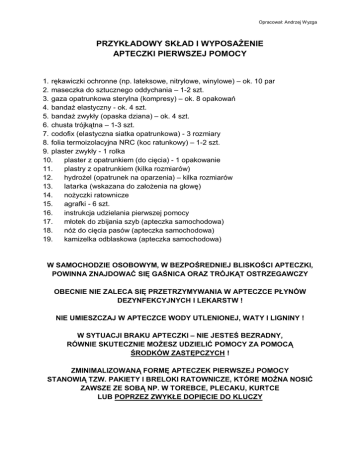 Opracował: Andrzej Wyzga PRZYKŁADOWY SKŁAD I WYPOSAŻENIE APTECZKI PIERWSZEJ POMOCY 1. rękawiczki ochronne (np. lateksowe, nitrylowe, winylowe) – ok. 10 par 2. maseczka do sztucznego oddychania – 1-2 szt. 3. gaza opatrunkowa sterylna (kompresy) – ok. 8 opakowań 4. bandaż elastyczny - ok. 4 szt. 5. bandaż zwykły (opaska dziana) – ok. 4 szt. 6. chusta trójkątna – 1-3 szt. 7. codofix (elastyczna siatka opatrunkowa) - 3 rozmiary 8. folia termoizolacyjna NRC (koc ratunkowy) – 1-2 szt. 9. plaster zwykły - 1 rolka 10. plaster z opatrunkiem (do cięcia) - 1 opakowanie 11. plastry z opatrunkiem (kilka rozmiarów) 12. hydrożel (opatrunek na oparzenia) – kilka rozmiarów 13. latarka (wskazana do założenia na głowę) 14. nożyczki ratownicze 15. agrafki - 6 szt. 16. instrukcja udzielania pierwszej pomocy 17. młotek do zbijania szyb (apteczka samochodowa) 18. nóż do cięcia pasów (apteczka samochodowa) 19. kamizelka odblaskowa (apteczka samochodowa) W SAMOCHODZIE OSOBOWYM, W BEZPOŚREDNIEJ BLISKOŚCI APTECZKI, POWINNA ZNAJDOWAĆ SIĘ GAŚNICA ORAZ TRÓJKĄT OSTRZEGAWCZY OBECNIE NIE ZALECA SIĘ PRZETRZYMYWANIA W APTECZCE PŁYNÓW DEZYNFEKCYJNYCH I LEKARSTW ! NIE UMIESZCZAJ W APTECZCE WODY UTLENIONEJ, WATY I LIGNINY ! W SYTUACJI BRAKU APTECZKI – NIE JESTEŚ BEZRADNY, RÓWNIE SKUTECZNIE MOŻESZ UDZIELIĆ POMOCY ZA POMOCĄ ŚRODKÓW ZASTĘPCZYCH ! ZMINIMALIZOWANĄ FORMĘ APTECZEK PIERWSZEJ POMOCY STANOWIĄ TZW. PAKIETY I BRELOKI RATOWNICZE, KTÓRE MOŻNA NOSIĆ ZAWSZE ZE SOBĄ NP. W TOREBCE, PLECAKU, KURTCE LUB POPRZEZ ZWYKŁE DOPIĘCIE DO KLUCZY