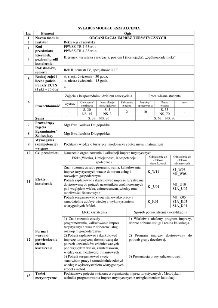 Lp. 1 2 3 4 5 Element Nazwa modułu Instytut Kod przedmiotu Kierunek, poziom i profil kształcenia Rok studiów, semestr Rodzaj zajęć i liczba godzin Punkty ECTS (1 pkt = 25-30g) SYLABUS MODUŁU KSZTAŁCENIA Opis ORGANIZACJA IMPREZ TURYSTYCZNYCH Rekreacji i Turystyki PPWSZ-TR-1-33ort-s PPWSZ-TR-1-33ort-n Kierunek: turystyka i rekreacja, poziom I (licencjacki), „ogólnoakademicki” Rok II, semestr IV, specjalność ORT st. stacj.: ćwiczenia - 30 godz. st. niest.: ćwiczenia - 15 godz. 4 Zajęcia z bezpośrednim udziałem nauczyciela 6 Pracochłonność Wykłady - 7 8 9 10 11 Suma Prowadzący zajęcia Egzaminator/ Zaliczający Wymagania (kompetencje) wstępne Cel przedmiotu Efekty kształcenia Ćwiczenia/ seminaria Konsultacje obowiązkowe S. 30 S. 5 NS. 15 NS. 3 S. 37, NS. 20 12 13 Treści merytoryczne Zaliczenie z oceną Projekty/ opracowania 2 10 Nauka własna Inne S. 53 NS. 70 S. 63, NS. 80 - Mgr Ewa Iwulska Długopolska Mgr Ewa Iwulska Długopolska Podstawy wiedzy o turystyce, środowisku społecznym i naturalnym Nauczenie organizowania i kalkulacji imprez turystycznych Odniesienie do Efekt (Wiedza, Umiejętności, Kompetencje efektów społeczne) kierunkowych Zna i rozumie zasady programowania, kalkulowania imprez turystycznych wraz z doborem usług i K_W11 rozwojem gospodarczym Potrafi zaplanować i skalkulować imprezę turystyczną dostosowaną do potrzeb uczestników zróżnicowanych K _U01 pod względem wieku, zainteresowań, wiedzy oraz możliwości finansowych Potrafi zorganizować swoje stanowisko pracy i samodzielnie zdobyć wiedzę z wykorzystaniem K_K01 wiarygodnych źródeł. Efekt kształcenia Forma i warunki potwierdzenia efektu kształcenia Praca własna studenta Odniesienie do efektów obszarowych S1_W03 M1_W08 M1_U10 S1A_U02 M1_K05 S1A_K03 S1A_K04 Sposób potwierdzenia (weryfikacji) 1) Zna i rozumie zasady 1) Właściwie ułożony program imprezy, programowania, kalkulowania imprez dobrze dobrane usługi i realna kalkulacja. turystycznych wraz z doborem usług i rozwojem gospodarczym. 2) Potrafi zaplanować i skalkulować 2) Program imprezy dostosowany do imprezę turystyczną dostosowaną do potrzeb grupy docelowej. potrzeb uczestników zróżnicowanych pod względem wieku, zainteresowań, wiedzy oraz możliwości finansowych 3) Potrafi zorganizować swoje 3) Prezentacja pracy zaliczeniowej. stanowisko pracy i samodzielnie zdobyć wiedzę z wykorzystaniem wiarygodnych źródeł i metod. Podstawowe pojęcia związane z organizacją imprez turystycznych . Metodyka i technika programowania imprez turystycznych z uwzględnieniem kalkulacji. 2 przedmiotu Organizowanie imprezy turystycznej w oparciu o Parki Narodowe: Gorczański, Pieniński, Tatrzański uwzględniającej walory krajobrazowe i kulturowe Spisza, Podhala, Pienin. 14 Wykaz literatury podstawowej 1. Kruczek Z., 2009, Obsługa ruchu turystycznego, Proksenia, Kraków. 2. Meyer B., 2008, Obsługa ruchu turystycznego, WN PWN, Warszawa. 15 Wykaz literatury uzupełniającej (pomocniczej) 1. Luboński P. (red), 2004, Gorce dla prawdziwego turysty, Oficyna Wydawnicza Rewasz, Kielce. 2. Nyka J., 2009, Tatry Polskie, Wyd. Trawers, Warszawa. 3. Nyka J., 2008, Pieniny, Wyd. Trawers, Warszawa. 4. Strauchmann K., 2001, Tajemnice skalnej ziemi – nie tylko przewodnik, Oficyna Wydawnicza Rewasz, Kielce.