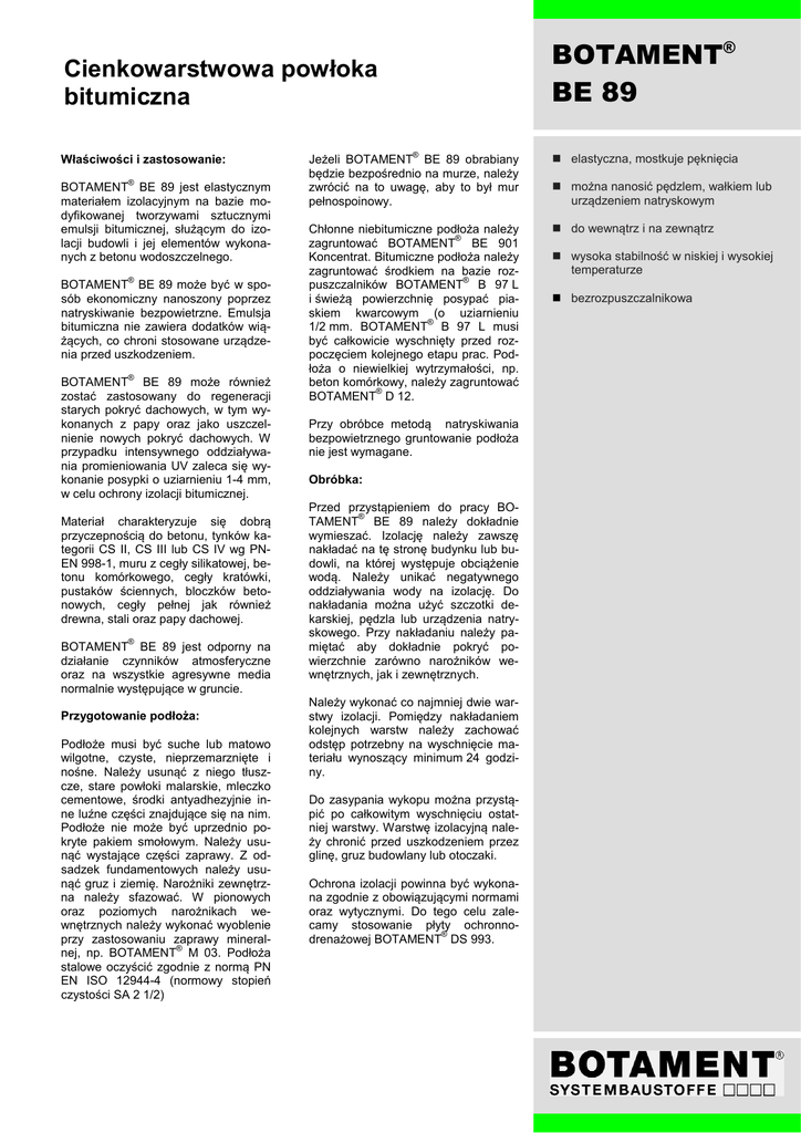 BOTAMENT® BE 89 Cienkowarstwowa powłoka bitumiczna Właściwości i zastosowanie: ® BOTAMENT BE 89 jest elastycznym materiałem izolacyjnym na bazie modyfikowanej tworzywami sztucznymi emulsji bitumicznej, służącym do izolacji budowli i jej elementów wykonanych z betonu wodoszczelnego. ® BOTAMENT BE 89 może być w sposób ekonomiczny nanoszony poprzez natryskiwanie bezpowietrzne. Emulsja bitumiczna nie zawiera dodatków wiążących, co chroni stosowane urządzenia przed uszkodzeniem. ® BOTAMENT BE 89 może również zostać zastosowany do regeneracji starych pokryć dachowych, w tym wykonanych z papy oraz jako uszczelnienie nowych pokryć dachowych. W przypadku intensywnego oddziaływania promieniowania UV zaleca się wykonanie posypki o uziarnieniu 1-4 mm, w celu ochrony izolacji bitumicznej. Materiał charakteryzuje się dobrą przyczepnością do betonu, tynków kategorii CS II, CS III lub CS IV wg PNEN 998-1, muru z cegły silikatowej, betonu komórkowego, cegły kratówki, pustaków ściennych, bloczków betonowych, cegły pełnej jak również drewna, stali oraz papy dachowej. ® BOTAMENT BE 89 jest odporny na działanie czynników atmosferyczne oraz na wszystkie agresywne media normalnie występujące w gruncie. Przygotowanie podłoża: Podłoże musi być suche lub matowo wilgotne, czyste, nieprzemarznięte i nośne. Należy usunąć z niego tłuszcze, stare powłoki malarskie, mleczko cementowe, środki antyadhezyjnie inne luźne części znajdujące się na nim. Podłoże nie może być uprzednio pokryte pakiem smołowym. Należy usunąć wystające części zaprawy. Z odsadzek fundamentowych należy usunąć gruz i ziemię. Narożniki zewnętrzna należy sfazować. W pionowych oraz poziomych narożnikach wewnętrznych należy wykonać wyoblenie przy zastosowaniu zaprawy mineral® nej, np. BOTAMENT M 03. Podłoża stalowe oczyścić zgodnie z normą PN EN ISO 12944-4 (normowy stopień czystości SA 2 1/2) ® Jeżeli BOTAMENT BE 89 obrabiany będzie bezpośrednio na murze, należy zwrócić na to uwagę, aby to był mur pełnospoinowy. Chłonne niebitumiczne podłoża należy ® zagruntować BOTAMENT BE 901 Koncentrat. Bitumiczne podłoża należy zagruntować środkiem na bazie roz® puszczalników BOTAMENT B 97 L i świeżą powierzchnię posypać piaskiem kwarcowym (o uziarnieniu ® 1/2 mm. BOTAMENT B 97 L musi być całkowicie wyschnięty przed rozpoczęciem kolejnego etapu prac. Podłoża o niewielkiej wytrzymałości, np. beton komórkowy, należy zagruntować ® BOTAMENT D 12. Przy obróbce metodą natryskiwania bezpowietrznego gruntowanie podłoża nie jest wymagane. Obróbka: Przed przystąpieniem do pracy BO® TAMENT BE 89 należy dokładnie wymieszać. Izolację należy zawszę nakładać na tę stronę budynku lub budowli, na której występuje obciążenie wodą. Należy unikać negatywnego oddziaływania wody na izolację. Do nakładania można użyć szczotki dekarskiej, pędzla lub urządzenia natryskowego. Przy nakładaniu należy pamiętać aby dokładnie pokryć powierzchnie zarówno narożników wewnętrznych, jak i zewnętrznych. Należy wykonać co najmniej dwie warstwy izolacji. Pomiędzy nakładaniem kolejnych warstw należy zachować odstęp potrzebny na wyschnięcie materiału wynoszący minimum 24 godziny. Do zasypania wykopu można przystąpić po całkowitym wyschnięciu ostatniej warstwy. Warstwę izolacyjną należy chronić przed uszkodzeniem przez glinę, gruz budowlany lub otoczaki. Ochrona izolacji powinna być wykonana zgodnie z obowiązującymi normami oraz wytycznymi. Do tego celu zalecamy stosowanie płyty ochronno® drenażowej BOTAMENT DS 993. elastyczna, mostkuje pęknięcia można nanosić pędzlem, wałkiem lub urządzeniem natryskowym do wewnątrz i na zewnątrz wysoka stabilność w niskiej i wysokiej temperaturze bezrozpuszczalnikowa BOTAMENT® BE 89 Baza materiałowa: emulsja bitumiczna Gęstość: ok. 1,05 kg/l Wartość pH: ok. 9 Odporność na temperaturę: od -20°C do +80°C Rozciągliwość: 500% Temperatura obróbki: od +5°C do +30°C Czas między nanoszeniem poszczególnych warstw: ok. 24 godz. Czas schnięcia do momentu zasypania wykopu: ok. 3 dni od chwili nałożenia ostatniej warstwy Środki do czyszczenia: w świeżym stanie materiału - woda po wyschnięciu - rozpuszczalnik BOTAMENT® SYSTEMBAUSTOFFE 63-000 Środa Wlkp. · ul. Prądzyńskiego 20 Tel. 061/286-45-20,-33 · Fax 061/286-45-14 www.botament.pl · [email protected] Cienkowarstwowa powłoka bitumiczna Wskazówki: Zużycie: Wszystkie wymienione parametry odnoszą się do temperatury +23°C i 50% względnej wilgotności powietrza. Wyższa temperatura i niższa wilgotność powietrza przyspieszają, a niższa temperatura i wyższa wilgotność powietrza opóźniają czas obróbki i przebieg schnięcia. ok. 1,1 l/m na 1 mm grubości warstwy W przypadku silnego obciążenia promieniowaniem słonecznym może dojść do mięknienia warstwy izolacyjnej oraz powstawania pęcherzy. Należy unikać długotrwałego działania warunków atmosferycznych, ponieważ może to spowodować spękanie powierzchni. w chłodnym miejscu, chronić przed mrozem 2 Opakowanie: 10 l - pojemnik z tworzywa sztucznego 30 l - pojemnik z tworzywa sztucznego Przechowywanie: Termin przechowywania w oryginalnie zamkniętych opakowaniach wynosi 12 miesięcy. Należy przestrzegać wytycznych zawartych w kartach technicznych produktów, które są stosowane w połą® czeniu z BOTAMENT BE 89. Kartę bezpieczeństwa otrzymają Państwo na życzenie. W celu osiągnięcia optymalnych parametrów technicznych, przed zastosowaniem zalecamy wykonanie próby w specyficznych warunkach budowy. Uwaga: Dane zawarte w instrukcji technicznej powstały w najlepszej wierze na podstawie naszych doświadczeń, nie są jednak zobowiązujące. Trzeba je dostosować odpowiednio do danych obiektów budowlanych, celów zastosowania oraz szczególnych miejscowych wymagań. W krytycznych miejscach zastosowań 