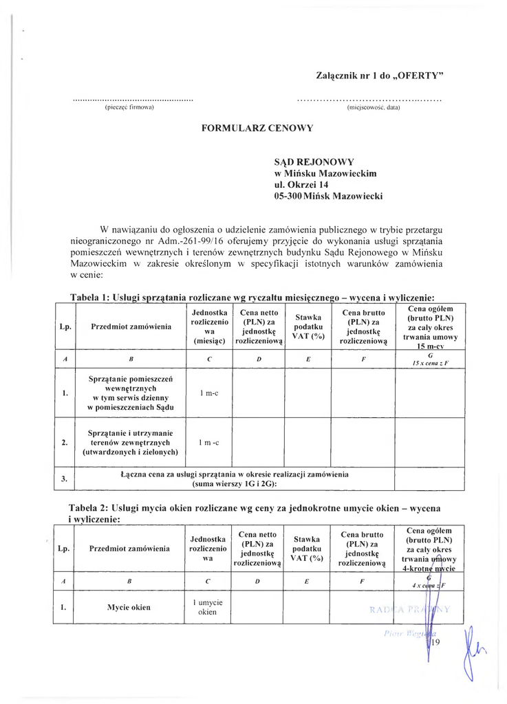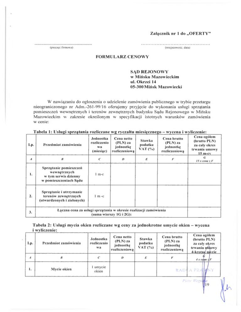 Z ałącznik nr 1 do „ O F E R T Y ” (pieczęć firm owa) (miejscowość, data) FO RM ULARZ CENO W Y SĄ D R E JO N O W Y w M ińsku M azow ieckim ul. O krzei 14 0 5 -3 0 0 M iń sk M azow iecki W n aw iązan iu do ogłoszenia o udzielenie zam ów ienia publicznego w trybie przetargu nieograniczonego nr A d m .-2 6 1-99/16 oferujem y przyjęcie do w ykonania usługi sprzątania p om ieszczeń w ew nętrznych i terenów zew nętrznych budynku Sądu R ejonow ego w M ińsku M azow ieckim w zakresie określonym w specyfikacji istotnych w arunków zam ów ienia w cenie: T abela 1: U słu g i sprzątania rozliczane w g ry czałtu m iesięcznego - w ycena i w yliczenie: Lp. P rzed m iot zam ów ienia Jednostka rozliczenio wa (m iesiąc) A B C 1. S przątanie pom ieszczeń w ew nętrznych w tym serw is dzienny w pom ieszczeniach Sądu 1 m-c 2. S przątanie i utrzym anie terenów zew nętrznych (utw ardzonych i zielonych) 1 m -c C ena netto (PLN ) za jednostkę rozliczeniow ą Stawka podatku V A T (% ) C ena brutto (PLN ) za jednostkę rozliczeniow ą D E F Cena ogółem (brutto PLN) za cały okres trw ania um ow y 15 m -cv G 15 x cena zF Ł ączna cena za usługi sprzątania w okresie realizacji zam ów ienia (sum a w ierszy IG i 2G): 3. T abela 2: U słu gi m ycia okien rozliczane w g ceny za jed n ok rotn e um ycie okien - w ycena i w yliczenie: Lp. P rzed m iot zam ów ienia Jednostka rozliczenio wa A B C 1. M ycie okien 1 um ycie okien C ena netto (PL N ) za jednostkę rozliczeniow ą Staw ka podatku V A T (% ) C ena brutto (PLN ) za jednostkę rozliczeniow ą O E F Cena ogółem (brutto PLN ) za cały okres trw ania um ow y 4-krotne nw cie 4X Cl a z]F R A D ( A P R / WN Y Picitr Wegii la 19 Łączna cena za m ycie okien w okresie realizacji zam ów ienia (sum a w ierszy IG): T ab ela 3: U sługi odśnieżania dachu rozliczane w g ceny za jed n ok rotn e odśnieżan ie dachu - w ycen a i w yliczenie:__________ ____________ ___________ _______________ ___________ Lp. P rzedm iot zam ów ienia Jednostka rozliczenio wa Cena netto (PLN) za jednostkę rozliczeniową A B C D 1. O dśnieżanie dachu (w przypadku wystąpienia takiej potrzeby) odśnieżanie dachu Stawka podatku V A T (% ) Cena brutto (PLN) za jednostkę rozliczeniową E F Cena ogółem (brutto PLN) za cały okres trw ania um ow y 3-krotne odśnieżanie dachu G 3 x cena F 1 Ł ączna cena za odśnieżanie dachu w okresie realizacji zam ów ienia (sum a w ierszy IG): 2. T abela 4: Ł ączn a cena oferty - w yliczenie: Przedm iot zam ów ienia Cena ogółem (brutto PLN) A B C 1. Łączna cena z Tabeli 1 2. Łączna cena z Tabeli 2 3. Łączna cena z Tabeli 3 4. Ł Ą C ZN A C EN A O FER TY (sum a w ierszy 1C, 2C i 3C): Lp. (słow nie k w o ta brutto:
