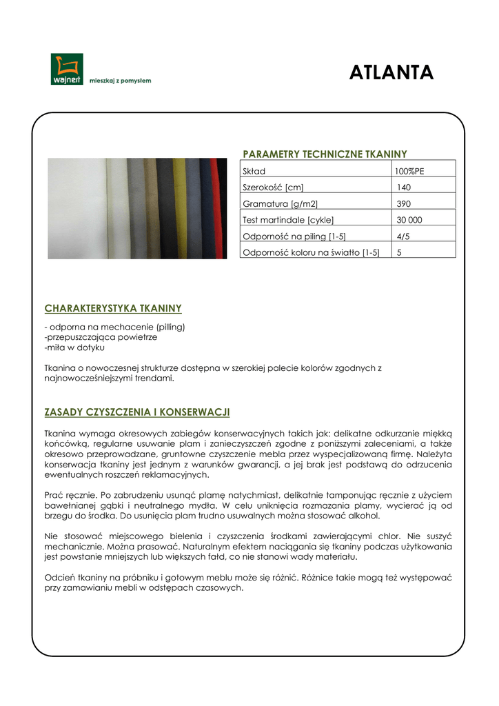 ATLANTA PARAMETRY TECHNICZNE TKANINY Skład 100%PE Szerokość [cm] 140 Gramatura [g/m2] 390 Test martindale [cykle] 30 000 Odporność na piling [1-5] 4/5 Odporność koloru na światło [1-5] 5 CHARAKTERYSTYKA TKANINY - odporna na mechacenie (pilling) -przepuszczająca powietrze -miła w dotyku Tkanina o nowoczesnej strukturze dostępna w szerokiej palecie kolorów zgodnych z najnowocześniejszymi trendami. ZASADY CZYSZCZENIA I KONSERWACJI Tkanina wymaga okresowych zabiegów konserwacyjnych takich jak: delikatne odkurzanie miękką końcówką, regularne usuwanie plam i zanieczyszczeń zgodne z poniŜszymi zaleceniami, a takŜe okresowo przeprowadzane, gruntowne czyszczenie mebla przez wyspecjalizowaną firmę. NaleŜyta konserwacja tkaniny jest jednym z warunków gwarancji, a jej brak jest podstawą do odrzucenia ewentualnych roszczeń reklamacyjnych. Prać ręcznie. Po zabrudzeniu usunąć plamę natychmiast, delikatnie tamponując ręcznie z uŜyciem bawełnianej gąbki i neutralnego mydła. W celu uniknięcia rozmazania plamy, wycierać ją od brzegu do środka. Do usunięcia plam trudno usuwalnych moŜna stosować alkohol. Nie stosować miejscowego bielenia i czyszczenia środkami zawierającymi chlor. Nie suszyć mechanicznie. MoŜna prasować. Naturalnym efektem naciągania się tkaniny podczas uŜytkowania jest powstanie mniejszych lub większych fałd, co nie stanowi wady materiału. Odcień tkaniny na próbniku i gotowym meblu moŜe się róŜnić. RóŜnice takie mogą teŜ występować przy zamawianiu mebli w odstępach czasowych.