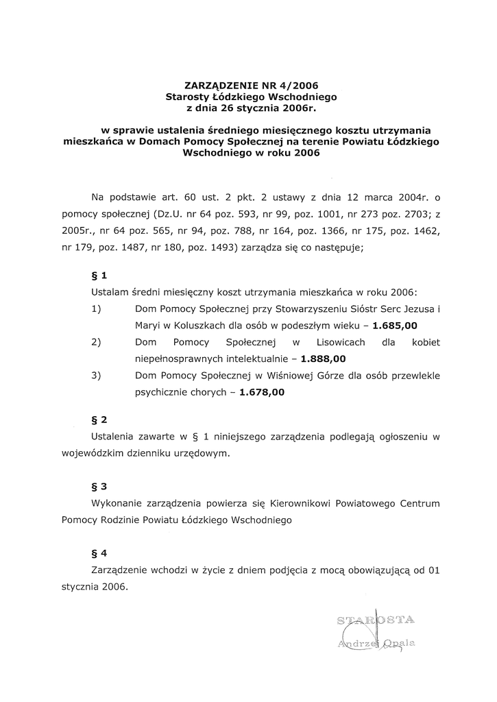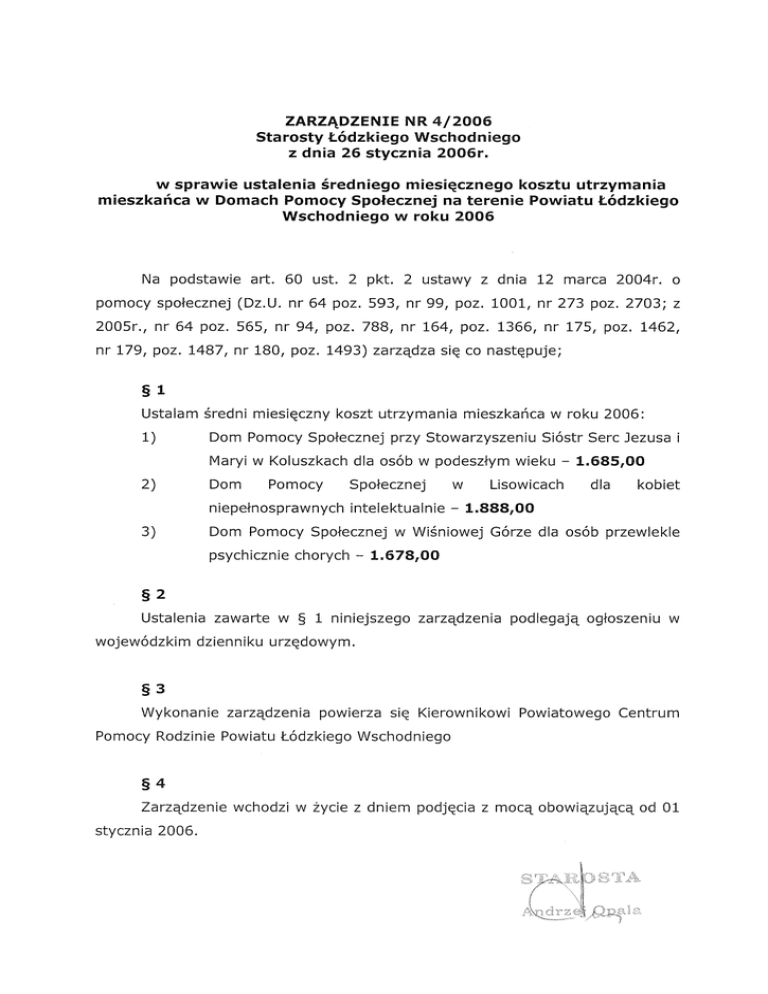 Sta zARzĄDzENIE NR 4/2006 rosty Łódzkiego Wschodn iego z dnia 26 stycznia 2OO6r. W sprawie ustalenia średniegomiesięcznego kosztu utrzymania mieszkańca W Domach Pomocy Społecznej na terenie Powiatu Łódzkiego Wschodniego w roku 2006 Na podstawie art. 60 ust. 2 pkt. 2 ustawy z dnia 12 marca 2OO4r. o pomocy społecznej (Dz.U. nr 64 poz. 593, nr 99, poz' 1001 , nr 273 poz' 27a3; z 2005r,, nr 64 poz. 565, nr 94, poz. 7BB, nr 164, poz. 1366, nr I75, poz. 1462, nr I79, poz, I4B7, nr 1B0, poz, 1493) zarządza się co następuje; s1 Usta|am średnimiesięczny koszt utrzymania mieszkańca w roku 2006: 1) 2) 3) Dom Pomocy Społecznej przy Stowarzyszeniu Sióstr Serc Jezusa Maryi w Ko|uszkach dla osób w podeszłym wieku - 1.685'00 Dom Pomocy Społecznej w Lisowicach d|a niepełnosprawnych intelektuaInie i kobiet - 1.888,oo Dom Pomocy Społecznej w WiśniowejGórze dIa osób przew|ekle psychicznie chorych - 1.678,00 s2 Usta|enia zawarte W 5 1 niniejszego zarządzenia podlegajq ogłoszeniu w wojewódzkim dzienniku urzędowym. s3 Wykonanie zarządzenia powierza się Kierownikowi Powiatowego Centrum Pomocy Rodzinie Powiatu Łódzkiego Wschodniego s4 Zarzqdzenie wchodzi w zycie z dniem podjęcia z mocq obowiqzującq od 01 stycznia 2006.