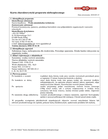 Karta charakterystyki preparatu niebezpiecznego Data utworzenia: 2010-05-15 1. Identyfikacja preparatu Identyfikacja substancji Nazwa handlowa: Woda amoniakalna techniczna Zastosowanie substancji Przemysł kosmetyczny, gumowy, produkcja barwników oraz półproduktów organicznych i nawozów sztucznych Identyfikacja dystybutora „AG-AU Duber" ul. B.Głowackiego 2A/1 63-000 Środa Wlkp. Tel./fax (61) 285-47-00 Tel. kom. 0-502 55-44-30; e-mail: [email protected]; www.agauduber.pl Telefon alarmowy 0502 55 44 30 2. Identyfikacja zagroŜeń Substancja Ŝrąca, niebezpieczna dla środowiska. Powoduje oparzenia. Działa bardzo toksycznie na organizmy wodne. 3. Skład i informacja o składnikach Synonimy: wodny roztwór amoniaku. Nazwa składnika: roztwór amoniaku Numer CAS: 1336-21-6 Wzór chemiczny: NH3 · H2O Numer WE: 215-647-6 Numer indeksowy: 007-001-01-2 C, R: 34, 36/37/38 4. Pierwsza pomoc Po kontakcie z oczami: wypłukać duŜą ilością wody przy szeroko rozwartych powiekach przez co najmniej 15 minut, konieczna kontrola u okulisty. Po kontakcie ze skórą: zmyć duŜą ilością wody (nie gorącą wodą), nie stosować środków zobojętniających,, na oparzone miejsce nałoŜyć jałowy opatrunek, zdjąć zanieczyszczone ubranie. Niezwłocznie wezwać pomoc lekarską. Po spoŜyciu: osobie przytomnej podać rozcieńczony roztwór kwasu octowego (100g octu/l wody), sok z cytryny rozpuszczony w wodzie, kwas cytrynowy lub kwas winowy, moŜna równieŜ podać mleko. Zapewnić pomoc lekarską. Po naraŜeniu drogą oddechową: wynieść poszkodowanego z miejsca naraŜenia, zapewnić bezwzględny spokój w pozycji półleŜącej lub siedzącej. Chronić przed utrata ciepła. W przypadku wystąpienia jakichkolwiek niepokojących objawów wezwać natychmiast lekarza lub odwieźć poszkodowanego do szpitala, pokazać kartę charakterystyki, opakowanie produktu lub etykietę. „AG-AU Duber” Karta charakterystyki preparatu niebezpiecznego Strona 1/6 5. Postępowanie w przypadku poŜaru Odpowiednie środki gaśnicze: proszki gaśnicze, CO2, woda, piany średnie. Nie stosować gaśnic halonowych. Specjalne zagroŜenia: wydzielający się z roztworu (po ogrzaniu lub zmniejszeniu ciśnienia) amoniak jest gazem palnym i tworzy mieszaniny wybuchowe z powietrzem, tlenem, chlorem, bromem, jodem. Podczas spalania wydzielają się toksyczne gazy, azot, tlenki azotu. Środki ochrony indywidualnej stosować gazoszczelną odzieŜ ochronną i indywidualny aparat izolujący dla straŜaków: drogi oddechowe. Inne: chłodzić sąsiednie pojemniki rozpylając na nie wodę z bezpiecznej odległości, o ile to moŜliwe, usunąć z obszaru zagroŜenia (groźba wybuchu). Tworzące się opary zbijać strumieniem wody. ZagroŜony teren zagrodzić w kierunku wiatru. Powiadomić Państwową StraŜ PoŜarną, a w razie konieczności takŜe Policję i Jednostkę Ratownictwa Chemicznego. Nie dopuścić do przedostania się wody po gaszeniu poŜaru do gleby oraz wód powierzchniowych i gruntowych. 6. Postępowanie w przypadku niezamierzonego uwolnienia do środowiska Indywidualne środki ostroŜności: nie dopuszczać osób postronnych i nieupowaŜnionych. Unikać bezpośredniego kontaktu z produktem oraz wdychania jego par i zapewnić właściwą wentylację lub ochronę dróg oddechowych, stosować odpowiednie środki ochrony indywidualnej (gogle, kombinezon, buty i rękawice ochronne, środki ochrony dróg oddechowych). Zakaz palenia, uŜywania otwartego ognia i narzędzi iskrzących. Środki ostroŜności w zakresie nie dopuścić do przedostania się produktu do wód, ścieków i gleby. ochrony środowiska: Metody oczyszczania: jeŜeli to moŜliwe - zlokalizować miejsce wycieku,– zlikwidować wyciek, uszczelnić; gdy to konieczne uszkodzony zbiornik usunąć; ostroŜnie zebrać na sucho przy pomocy substancji absorbującej (piasek, sucha ziemia, uniwersalny materiał chłonny), umieścić we właściwie oznakowanym, zamykanym pojemniku i przekazać do likwidacji. Oczyścić skaŜony teren. W przypadku dostania się produktu do gleby, wód powierzchniowych, gruntowych lub kanalizacji – powiadomić słuŜby ratownictwa chemicznego i odpowiednie władze. Gdy niemoŜliwe jest zlikwidowanie wycieku, pozostawić w bezpiecznej odległości od strony nawietrznej i czekać na przybycie ekip ratowniczych 7. Postępowanie z substancją (preparatem i jej) jego magazynowanie Obchodzenie się z substancją: Magazynowanie: zapewnić skuteczną wymianę powietrza (wentylacja). Nie opróŜniać do kanalizacji. Stosować środki ochrony osobistej. Unikać bezpośredniego kontaktu ze skórą, oczami, natychmiast zdjąć zabrudzone produktem ubranie i obuwie. Nie spoŜywać posiłków, nie pić napojów oraz nie palić tytoniu podczas pracy z produktem za wyjątkiem miejsc do tego przeznaczonych. NaleŜy myć ręce przed przerwami i po zakończeniu pracy. Załadunek produktu powinien odbywać się w terenie otwartym szczelnych cystern i opakowań (uziemionych) w sposób uniemoŜliwiający wyciek. Zakaz palenia i uŜywania otwartego ognia. NaleŜy zachować duŜą ostroŜność przy pracy z produktem, poniewaŜ jest to ciecz silnie Ŝrąca i trująca. produkt naleŜy przechowywać w zamkniętych zbiornikach lub opakowaniach wypełnionych do 80%, w chłodnych i suchych pomieszczeniach wyposaŜonych w sprawną wentylację oraz przeciwwybuchową instalację elektryczną i oświetleniową. Odizolować od silnych utleniaczy i mocnych kwasów. Unikać bezpośredniego nasłonecznienia i innych źródeł ciepła. „AG-AU Duber” Karta charakterystyki preparatu niebezpiecznego Strona 2/6 8. Kontrola naraŜenia i środki ochrony indywidualnej Parametry kontroli (NDS, NDSCh, NDSP) Rozp. z 22.11.02 (Dz.U. 2002 Nr 217, poz. 1833 z późn. zm.) Amoniak NDS NDSCh [mg/m3] 14 28 Stosować odpowiednią wentylację. Zaleca się wyposaŜenie miejsca pracy w wodny natrysk do płukania oczu oraz prysznic. Środki ochrony indywidualnej powinny być ta