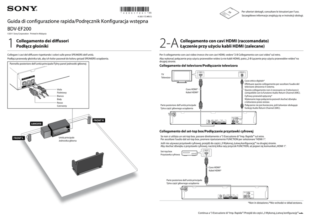 Per ulteriori dettagli, consultare le Istruzioni per l’uso. (1) Szczegółowe informacje znajdują się w instrukcji obsługi. 4-265-172-41(1) Guida di configurazione rapida/Podręcznik Konfiguracja wstępna BDV-EF200 ©2011 Sony Corporation Printed in Malaysia 1 2-A Collegare i cavi del diffusore rispettando i colori sulle prese SPEAKERS dell’unità. Per il collegamento con cavi video invece che con cavi HDMI, vedere “2-B Collegamento con cavi video” sul retro. Podłącz przewody głośnika tak, aby ich kolor pasował do koloru gniazd SPEAKERS urządzenia. Aby wykonać połączenie przy użyciu przewodów wideo (a nie kabli HDMI), patrz „2-B Łączenie przy użyciu przewodów wideo” na drugiej stronie. Collegamento dei diffusori Podłącz głośniki Collegamento con cavi HDMI (raccomandato) Łączenie przy użyciu kabli HDMI (zalecane) Pannello posteriore dell’unità principale/Tylny panel jednostki głównej Collegamento del televisore/Podłączanie telewizora HDMI IN DIGITAL OUT TV Telewizor OPTICAL Cavo ottico digitale* Effettuare questo collegamento per ascoltare l’audio del televisore attraverso il sistema. Questo collegamento non è necessario se il televisore è compatibile con la funzione Audio Return Channel (ARC). Cyfrowy przewód optyczny* Wykonanie tego połączenia pozwoli słuchać dźwięku z telewizora przez zestaw. Połączenie nie jest konieczne, jeśli telewizor obsługuje funkcję Audio Return Channel (ARC). Cavo HDMI* Kabel HDMI* Viola Fioletowy Bianco Biały Rosso Czerwony Parte posteriore dell’unità principale Tylna część głównego urządzenia DIGITAL IN OPTICAL FRONT R OUT ARC IN 1 L AUDIO IN IN 2 R SUBWOOFER TV VIDEO OUT AUDIO Collegamento del set-top box/Podłączanie przystawki cyfrowej FRONT L Unità principale Jednostka główna Se non si utilizza un set-top box, passare direttamente a “3 Esecuzione di “Imp. Rapida”” sul retro. Per ascoltare l’audio dal set-top box, premere ripetutamente FUNCTION per selezionare “HDMI 1”. Jeśli nie używasz przystawki cyfrowej, przejdź do części „3 Wykonaj „Łatwą konfigurację”” na drugiej stronie. Aby słuchać dźwięku z przystawki cyfrowej, naciśnij kilka razy przycisk FUNCTION, aż pojawi się komunikat „HDMI 1”. Set-top box Przystawka cyfrowa HDMI OUT Cavo HDMI* Kabel HDMI* Parte posteriore dell’unità principale Tylna część głównego urządzenia DIGITAL IN OPTICAL OUT ARC IN 1 L AUDIO IN IN 2 R VIDEO OUT TV AUDIO *Non in dotazione./*Nie wchodzi w skład zestawu. Continua a “3 Esecuzione di “Imp. Rapida””/Przejdź do części „3 Wykonaj „Łatwą konfigurację”” 3 2-B Esecuzione di “Imp. Rapida” Collegamento con cavi video Łączenie przy użyciu przewodów wideo Un volta completato “2-A Collegamento con cavi HDMI (raccomandato),” passare direttamente a “3 Esecuzione di “Imp. Rapida””. Po wykonaniu procedury w części „2-A Łączenie przy użyciu kabli HDMI (zalecane)”, przejdź do części „3 Wykonaj „Łatwą konfigurację””. Collegamento del televisore/Podłączanie telewizora VIDEO IN Non inserire dischi prima dell’esecuzione di “Imp. Rapida”. Nie wkładaj płyty, zanim nie zostanie zakończona „Łatwa konfiguracja”. 1. Inserire le pile nel telecomando. DIGITAL OUT TV Telewizor OPTICAL Cavo ottico digitale* Effettuare questo collegamento per ascoltare l’audio del televisore attraverso il sistema. Cyfrowy przewód optyczny* Wykonanie tego połączenia pozwoli słuchać dźwięku z telewizora przez zestaw. Cavo video* Przewód wideo* Parte posteriore dell’unità principale Tylna część głównego urządzenia DIGITAL IN OPTICAL OUT ARC IN 1 L AUDIO IN IN 2 R TV VIDEO OUT 2. Collegare i cavi di alimentazione CA dell’unità principale e del televisore a un presa di alimentazione CA, quindi accendere l’unità principale e il televisore. AUDIO Se non si utilizza un set-top box, passare direttamente a “3 Esecuzione di “Imp. Rapida””. Per ascoltare l’audio dal set-top box, premere ripetutamente FUNCTION per selezionare “AUDIO”. Jeśli nie używasz przystawki cyfrowej, przejdź do części „3 Wykonaj „Łatwą konfigurację””. Aby słuchać dźwięku z przystawki cyfrowej, naciśnij kilka razy przycisk FUNCTION, aż pojawi się komunikat „AUDIO”. AUDIO OUT L VIDEO OUT VIDEO IN TV Telewizor R Cavo video* Przewód wideo* Parte posteriore dell’unità principale Tylna część głównego urządzenia DIGITAL IN OPTICAL OUT ARC IN 1 L AUDIO IN IN 2 R VIDEO OUT TV AUDIO *Non in dotazione./*Nie wchodzi w skład zestawu. Podłącz przewody zasilania głównego urządzenia i telewizora do gniazdka, a następnie włącz zasilanie głównego urządzenia i telewizora. 3. Impostare il selettore di ingresso del televisore in modo che sullo schermo del televisore vengano visualizzate schermate di sistema come quelle riportate di seguito. Cavo audio* Effettuare questo collegamento per ascoltare l’audio del set-top box attraverso il sistema. Przewód audio* Wykonanie tego połączenia pozwoli słuchać dźwięku z przystawki cyfrowej przez zestaw. Włóż baterie do pilota. Używając przycisków /// i skonfiguruj ustawienia podstawowe, postępując zgodnie ze wskazówkami wyświetlanymi na ekranie w części „Łatwa konfiguracja”. ///, Quando “Imp. Rapida” è giunta a termine, viene visualizzato [Ora Imp. Rapida è completata]. Collegamento del set-top box/Podłączanie przystawki cyfrowej Set-top box Przystawka cyfrowa Wykonaj „Łatwą konfigurację” 4. Eseguire le impostazioni di base secondo le istruzioni sullo schermo in “Imp. Rapida” mediante /// e . Ustaw przełącznik wyboru sygnału wejściowego telewizora tak, aby na ekranie telewizora pojawiły się obrazy pokazane poniżej. Avvio in corso Schermata di “Imp. Rapida” Uruchamianie Ekran „Łatwa konfiguracja” Po zakończeniu „Łatwej konfiguracji” zostanie wyświetlony komunikat [Łatwa konfiguracja jest z