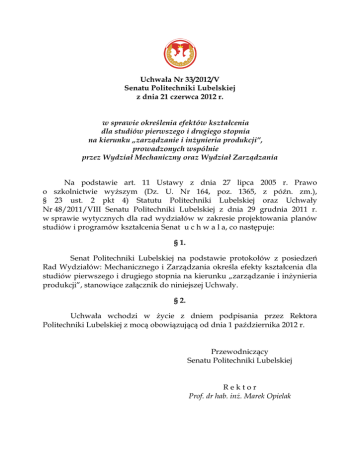 Uchwała Nr 33/2012/V Senatu Politechniki Lubelskiej z dnia 21 czerwca 2012 r. w sprawie określenia efektów kształcenia dla studiów pierwszego i drugiego stopnia na kierunku „zarządzanie i inżynieria produkcji”, prowadzonych wspólnie przez Wydział Mechaniczny oraz Wydział Zarządzania Na podstawie art. 11 Ustawy z dnia 27 lipca 2005 r. Prawo o szkolnictwie wyższym (Dz. U. Nr 164, poz. 1365, z późn. zm.), § 23 ust. 2 pkt 4) Statutu Politechniki Lubelskiej oraz Uchwały Nr 48/2011/VIII Senatu Politechniki Lubelskiej z dnia 29 grudnia 2011 r. w sprawie wytycznych dla rad wydziałów w zakresie projektowania planów studiów i programów kształcenia Senat u c h w a l a, co następuje: § 1. Senat Politechniki Lubelskiej na podstawie protokołów z posiedzeń Rad Wydziałów: Mechanicznego i Zarządzania określa efekty kształcenia dla studiów pierwszego i drugiego stopnia na kierunku „zarządzanie i inżynieria produkcji”, stanowiące załącznik do niniejszej Uchwały. § 2. Uchwała wchodzi w życie z dniem podpisania przez Rektora Politechniki Lubelskiej z mocą obowiązującą od dnia 1 października 2012 r. Przewodniczący Senatu Politechniki Lubelskiej Rektor Prof. dr hab. inż. Marek Opielak 1 2 Załącznik do Uchwały Nr 33/2012/V Senatu Politechniki Lubelskiej z dnia 21 czerwca 2012 r. Ogólna charakterystyka studiów I stopnia na kierunku ZARZĄDZANIE I INŻYNIERIA PRODUKCJI 1. Nazwa kierunku studiów: zarządzanie i inżynieria produkcji 2. Poziom kształcenia: studia I stopnia 3. Profil kształcenia: ogólnoakademicki 4. Forma studiów: stacjonarne, niestacjonarne 5. Tytuł zawodowy uzyskiwany przez absolwenta: inżynier 6. Przyporządkowanie do obszaru lub obszarów kształcenia: obszar nauk technicznych i nauk społecznych 7. Wskazanie dziedzin nauki i dyscyplin naukowych, do których odnoszą się efekty kształcenia: dziedzina nauk technicznych w zakresie dyscyplin naukowych: inżynieria produkcji, automatyka i robotyka, mechanika, budowa i eksploatacja maszyn, informatyka, inżynieria materiałowa; dziedzina nauk ekonomicznych: nauki o zarządzaniu 8. Różnice w stosunku do innych programów o podobnie zdefiniowanych celach i efektach kształcenia prowadzonych w Uczelni: Program kształcenia na kierunku zarządzanie i inżynieria produkcji pozwala na osiągnięcie celów i efektów kształcenia odnoszących się do obszaru nauk technicznych i nauk społecznych. Daje to możliwość zdobycia komplementarnej wiedzy z tych dwóch obszarów. Politechnika Lubelska nie prowadzi innych programów studiów, w których łączone są kompetencje inżynierskie i społeczne. 3 Tabela 1. Efekty kształcenia dla kierunku studiów I stopnia: Zarządzanie i Inżynieria Produkcji Opis efektów kształcenia dla kierunku: Zarządzanie i Inżynieria Produkcji Poziom kształcenia: Studia I stopnia Profil kształcenia: ogólnoakademicki Osoba posiadająca kwalifikacje I stopnia: Wiedza ZIP1A_W01 ZIP1A_W02 ZIP1A_W03 ZIP1A_W04 ZIP1A_W05 ZIP1A_W06 4 posiada wiedzę w zakresie podstawowych koncepcji, zasad i teorii, a także ich historycznego rozwoju i znaczenia dla postępu nauk technicznych, poznania świata i rozwoju ludzkości ma znajomość matematyki oraz fizyki na poziomie wyższym w zakresie niezbędnym dla ilościowego opisu, zrozumienia oraz modelowania problemów o średnim poziomie złożoności, posiada jednocześnie znajomość i rozumienie praw fizyki i mechaniki przydatnych do formułowania i rozwiązywania prostych problemów inżynierskich rozumie oraz potrafi wytłumaczyć znaczenie elementarnych wywodów dotyczących opisu prawidłowości, zjawisk i procesów oraz stosować w ich opisie język i formalizm matematyki, jednocześnie jest w stanie samodzielnie odtworzyć podstawowe twierdzenia i prawa oraz ich dowody zna podstawy metod obliczeniowych i technologii informacyjnych, zna podstawowe pakiety oprogramowania użytkowego w zakresie pozwalającym na ich stosowanie w praktyce zawodowej i życiu codziennym (edytory tekstów, bazy danych, arkusze kalkulacyjne, biblioteki numeryczne, oprogramowanie klasy CAE) posiada wiedzę na temat zasad projektowania inżynierskiego, projektowania procesów technologicznych obróbki i montażu, w tym zasad projektowania oprzyrządowania technologicznego oraz tworzenia systemów zapewnienia jakości zna zasady bezpieczeństwa i higieny pracy oraz posiada elementarną wiedzę w zakresie ochrony własności intelektualnej ZIP1A_W07 ZIP1A_W08 ZIP1A_W09 ZIP1A_W10 ZIP1A_W11 ZIP1A_W12 ZIP1A_W13 ZIP1A_W14 ZIP1A_W15 ZIP1A_W16 ZIP1A_W17 ZIP1A_W18 posiada ogólną wiedzę w zakresie problematyki inżynierii produkcji oraz nauk o zarządzaniu, ekonomii i dyscyplin komplementarnych, w tym poglądy na ewolucję struktur, instytucji i więzi społecznych obejmującą ich wzajemne powiązania oraz krytyczne rozumienie podstawowych teorii i zasad posiada podstawową wiedzę na temat technologii maszyn, szczególnie w zakresie ich budowy, eksploatacji, działania i niezawodności, automatyzacji, monitorowania, diagnostyki i sterowania oraz elementarnej obsługi posiada podstawową wiedzę niezbędną do rozumienia pozatechnicznych uwarunkowań działalności inżynierskiej posiada znajomość zasad tworzenia rysunku technicznego jako opisu geometrii części maszyn, zna metody pomiarowe oraz analityczne metody opracowania wyników pomiaru posiada wiedzę o materiałach inżynierskich, ich właściwościach i zastosowaniach; posiada znajomość podstawowych technologii wytwarzania identyfikuje i rozumie złożone procesy oraz zjawiska zachodzące w organizacjach i w otaczającym je świecie, a także relacje zachodzące między nimi, z uwzględnieniem interdyscyplinarnych poglądów na ich temat i ewolucję zna ogólne zasady podejmowania, organizowania, prowadzenia i rozwoju form indywidualnej przedsiębiorczości wyjaśnia i ilustruje wpływ oddziaływania otoczenia zewnętrznego oraz jego zmian na działalność i rozwój przedsiębior
