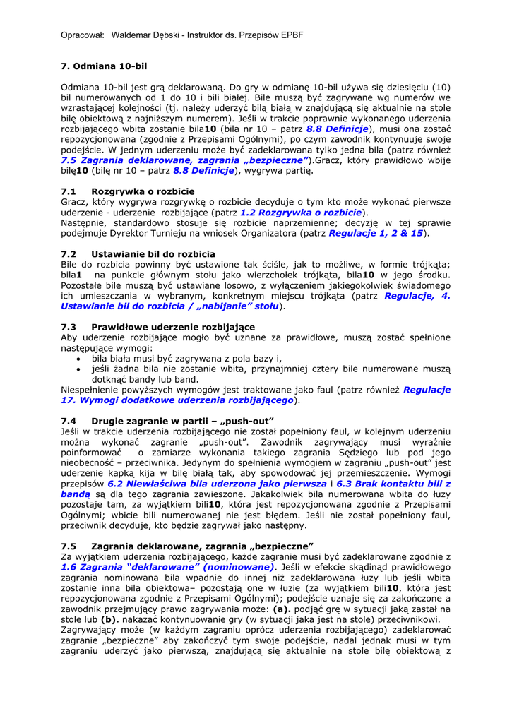 Opracował: Waldemar Dębski - Instruktor ds. Przepisów EPBF 7. Odmiana 10-bil Odmiana 10-bil jest grą deklarowaną. Do gry w odmianę 10-bil używa się dziesięciu (10) bil numerowanych od 1 do 10 i bili białej. Bile muszą być zagrywane wg numerów we wzrastającej kolejności (tj. należy uderzyć bilą białą w znajdującą się aktualnie na stole bilę obiektową z najniższym numerem). Jeśli w trakcie poprawnie wykonanego uderzenia rozbijającego wbita zostanie bila10 (bila nr 10 – patrz 8.8 Definicje), musi ona zostać repozycjonowana (zgodnie z Przepisami Ogólnymi), po czym zawodnik kontynuuje swoje podejście. W jednym uderzeniu może być zadeklarowana tylko jedna bila (patrz również 7.5 Zagrania deklarowane, zagrania „bezpieczne”).Gracz, który prawidłowo wbije bilę10 (bilę nr 10 – patrz 8.8 Definicje), wygrywa partię. 7.1 Rozgrywka o rozbicie Gracz, który wygrywa rozgrywkę o rozbicie decyduje o tym kto może wykonać pierwsze uderzenie - uderzenie rozbijające (patrz 1.2 Rozgrywka o rozbicie). Następnie, standardowo stosuje się rozbicie naprzemienne; decyzję w tej sprawie podejmuje Dyrektor Turnieju na wniosek Organizatora (patrz Regulacje 1, 2 & 15). 7.2 Ustawianie bil do rozbicia Bile do rozbicia powinny być ustawione tak ściśle, jak to możliwe, w formie trójkąta; bila1 na punkcie głównym stołu jako wierzchołek trójkąta, bila10 w jego środku. Pozostałe bile muszą być ustawiane losowo, z wyłączeniem jakiegokolwiek świadomego ich umieszczania w wybranym, konkretnym miejscu trójkąta (patrz Regulacje, 4. Ustawianie bil do rozbicia / „nabijanie” stołu). 7.3 Prawidłowe uderzenie rozbijające Aby uderzenie rozbijające mogło być uznane za prawidłowe, muszą zostać spełnione następujące wymogi: bila biała musi być zagrywana z pola bazy i, jeśli żadna bila nie zostanie wbita, przynajmniej cztery bile numerowane muszą dotknąć bandy lub band. Niespełnienie powyższych wymogów jest traktowane jako faul (patrz również Regulacje 17. Wymogi dodatkowe uderzenia rozbijającego). 7.4 Drugie zagranie w partii – „push-out” Jeśli w trakcie uderzenia rozbijającego nie został popełniony faul, w kolejnym uderzeniu można wykonać zagranie „push-out”. Zawodnik zagrywający musi wyraźnie poinformować o zamiarze wykonania takiego zagrania Sędziego lub pod jego nieobecność – przeciwnika. Jedynym do spełnienia wymogiem w zagraniu „push-out” jest uderzenie kapką kija w bilę białą tak, aby spowodować jej przemieszczenie. Wymogi przepisów 6.2 Niewłaściwa bila uderzona jako pierwsza i 6.3 Brak kontaktu bili z bandą są dla tego zagrania zawieszone. Jakakolwiek bila numerowana wbita do łuzy pozostaje tam, za wyjątkiem bili10, która jest repozycjonowana zgodnie z Przepisami Ogólnymi; wbicie bili numerowanej nie jest błędem. Jeśli nie został popełniony faul, przeciwnik decyduje, kto będzie zagrywał jako następny. 7.5 Zagrania deklarowane, zagrania „bezpieczne” Za wyjątkiem uderzenia rozbijającego, każde zagranie musi być zadeklarowane zgodnie z 1.6 Zagrania “deklarowane” (nominowane). Jeśli w efekcie skądinąd prawidłowego zagrania nominowana bila wpadnie do innej niż zadeklarowana łuzy lub jeśli wbita zostanie inna bila obiektowa– pozostają one w łuzie (za wyjątkiem bili10, która jest repozycjonowana zgodnie z Przepisami Ogólnymi); podejście uznaje się za zakończone a zawodnik przejmujący prawo zagrywania może: (a). podjąć grę w sytuacji jaką zastał na stole lub (b). nakazać kontynuowanie gry (w sytuacji jaka jest na stole) przeciwnikowi. Zagrywający może (w każdym zagraniu oprócz uderzenia rozbijającego) zadeklarować zagranie „bezpieczne” aby zakończyć tym swoje podejście, nadal jednak musi w tym zagraniu uderzyć jako pierwszą, znajdującą się aktualnie na stole bilę obiektową z Opracował: Waldemar Dębski - Instruktor ds. Przepisów EPBF najniższym numerem (patrz również 8.17 Zagranie “bezpieczne). Jednakże, jeśli w efekcie tego właśnie zagrania „bezpiecznego” aktualnie zagrywana (lub jakakolwiek inna) bila obiektowa zostanie wbita, zawodnik przejmujący prawo zagrywania może: (a). podjąć grę w sytuacji jaką zastał na stole lub (b). nakazać kontynuowanie gry (w sytuacji jaka jest na stole) przeciwnikowi. Bile wbite w trakcie zagrania „bezpiecznego” pozostają w łuzach, za wyjątkiem bili10, która jest repozycjonowana zgodnie z Przepisami Ogólnymi. 7.6 Kontynuacja gry Jeśli zagrywający umieści zadeklarowaną bilę w łuzie wykonując prawidłowe, deklarowane uderzenie (za wyjątkiem zagrania „push-out”, patrz 2.4 Drugie zagranie w partii), jakiekolwiek dodatkowo wbite w tym uderzeniu bile pozostają w łuzach (za wyjątkiem bili10, która jest „repozycjonowana” (patrz 1.4 i 9.7 Bila wracająca na stół – „repozycjonowanie”), a gracz kontynuuje swoje podejście. Jeśli (za wyjątkiem zagrania „push-out”, patrz 2.4 Drugie zagranie w partii) zagrywający umieści w łuzie bilę10 wykonując prawidłowe, zadeklarowane uderzenie, a bila10 nie była ostatnią pozostałą bilą, jest ona repozycjonowana, a zawodnik kontynuuje grę. Jeśli zagrywający nie wbije zadeklarowanej bili (lub popełni faul) prawo wykonania kolejnego zagrania przechodzi na przeciwnika; w przypadku kiedy nie popełniony został faul, zawodnik wchodzący musi zagrywać bile z pozycji w jakiej zastał je na stole. 7.7 Bila wracająca na stół – „repozycjonowanie” Jeśli bila10 zostanie wbita: (a). niezadeklarowana, (b). do innej niż zadeklarowana łuzy, (c). w trakcie uderzenia rozbijającego lub zagrania „push-out”, (d). w zagraniu, w którym popełniony został faul lub (e). zostanie wybita poza stół – musi być ona repozycjonowana (patrz 1.4 i 9.7 Bila wracająca na stół – „repozycjonowanie”). Żadna inna bila numerowana nie wraca na stół w trakcie gry. 7.8 Faul i zagranie po popełnieniu faul