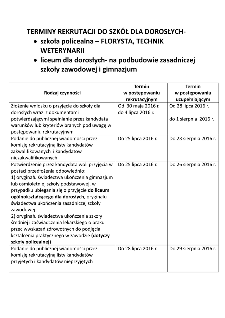 TERMINY REKRUTACJI DO SZKÓŁ DLA DOROSŁYCHszkoła policealna – FLORYSTA, TECHNIK WETERYNARII liceum dla dorosłych- na podbudowie zasadniczej szkoły zawodowej i gimnazjum Rodzaj czynności Termin w postępowaniu rekrutacyjnym Od 30 maja 2016 r. do 4 lipca 2016 r. Złożenie wniosku o przyjęcie do szkoły dla dorosłych wraz z dokumentami potwierdzającymi spełnianie przez kandydata warunków lub kryteriów branych pod uwagę w postępowaniu rekrutacyjnym Podanie do publicznej wiadomości przez Do 25 lipca 2016 r. komisję rekrutacyjną listy kandydatów zakwalifikowanych i kandydatów niezakwalifikowanych Potwierdzenie przez kandydata woli przyjęcia w Do 25 lipca 2016 r. postaci przedłożenia odpowiednio: 1) oryginału świadectwa ukończenia gimnazjum lub ośmioletniej szkoły podstawowej, w przypadku ubiegania się o przyjęcie do liceum ogólnokształcącego dla dorosłych, oryginału świadectwa ukończenia zasadniczej szkoły zawodowej 2) oryginału świadectwa ukończenia szkoły średniej i zaświadczenia lekarskiego o braku przeciwwskazań zdrowotnych do podjęcia kształcenia praktycznego w zawodzie (dotyczy szkoły policealnej) Podanie do publicznej wiadomości przez Do 28 lipca 2016 r. komisję rekrutacyjną listy kandydatów przyjętych i kandydatów nieprzyjętych Termin w postępowaniu uzupełniającym Od 28 lipca 2016 r. do 1 sierpnia 2016 r. Do 23 sierpnia 2016 r. Do 26 sierpnia 2016 r. Do 29 sierpnia 2016 r.