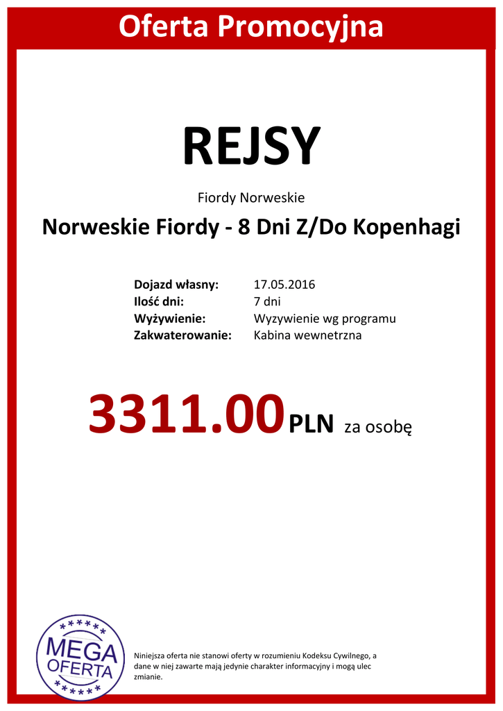 Oferta Promocyjna REJSY Fiordy Norweskie Norweskie Fiordy - 8 Dni Z/Do Kopenhagi Dojazd własny: Ilość dni: Wyżywienie: Zakwaterowanie: 17.05.2016 7 dni Wyzywienie wg programu Kabina wewnetrzna 3311.00 PLN za osobę Niniejsza oferta nie stanowi oferty w rozumieniu Kodeksu Cywilnego, a dane w niej zawarte mają jedynie charakter informacyjny i mogą ulec zmianie. Powered by TCPDF (www.tcpdf.org)