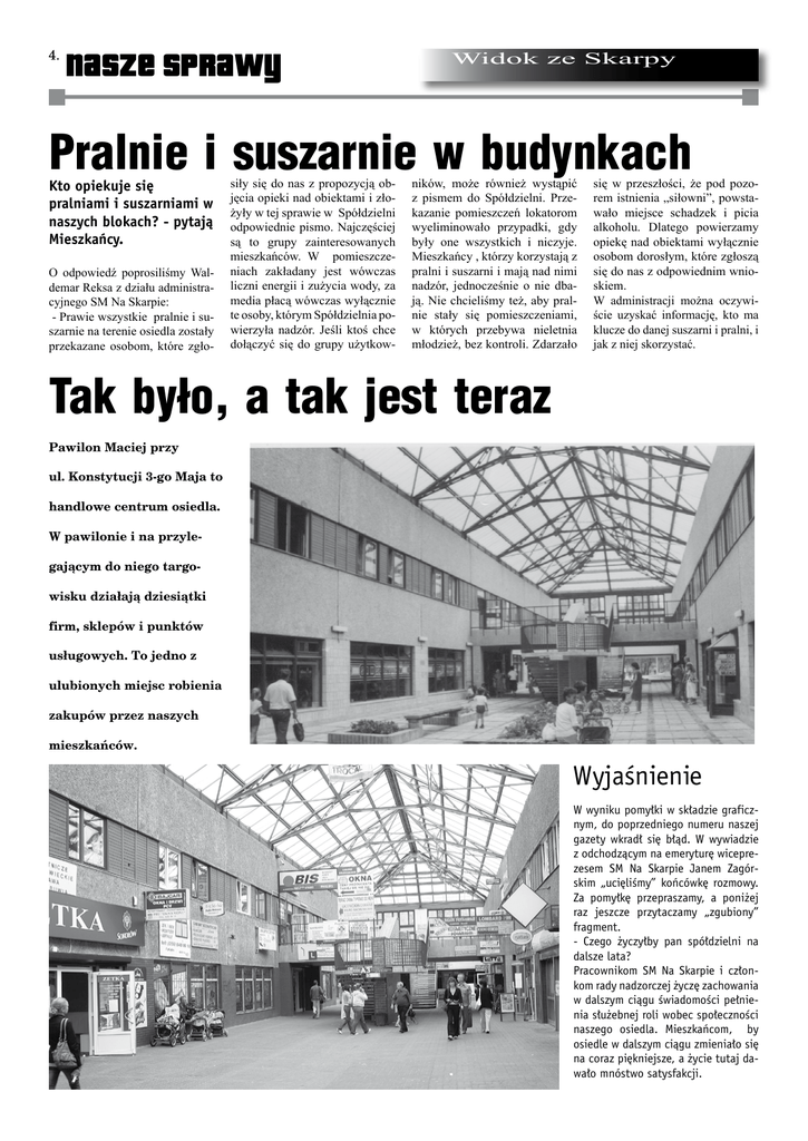 nasze sprawy Widok ze Skarpy Pralnie i suszarnie w budynkach Kto opiekuje się pralniami i suszarniami w naszych blokach? - pytają Mieszkańcy. O odpowiedź poprosiliśmy Waldemar Reksa z działu administracyjnego SM Na Skarpie: - Prawie wszystkie pralnie i suszarnie na terenie osiedla zostały przekazane osobom, które zgło- siły się do nas z propozycją objęcia opieki nad obiektami i złożyły w tej sprawie w Spółdzielni odpowiednie pismo. Najczęściej są to grupy zainteresowanych mieszkańców. W pomieszczeniach zakładany jest wówczas liczni energii i zużycia wody, za media płacą wówczas wyłącznie te osoby, którym Spółdzielnia powierzyła nadzór. Jeśli ktoś chce dołączyć się do grupy użytkow- ników, może również wystąpić z pismem do Spółdzielni. Przekazanie pomieszczeń lokatorom wyeliminowało przypadki, gdy były one wszystkich i niczyje. Mieszkańcy , którzy korzystają z pralni i suszarni i mają nad nimi nadzór, jednocześnie o nie dbają. Nie chcieliśmy też, aby pralnie stały się pomieszczeniami, w których przebywa nieletnia młodzież, bez kontroli. Zdarzało się w przeszłości, że pod pozorem istnienia „siłowni”, powstawało miejsce schadzek i picia alkoholu. Dlatego powierzamy opiekę nad obiektami wyłącznie osobom dorosłym, które zgłoszą się do nas z odpowiednim wnioskiem. W administracji można oczywiście uzyskać informację, kto ma klucze do danej suszarni i pralni, i jak z niej skorzystać. Tak było, a tak jest teraz Pawilon Maciej przy ul. Konstytucji 3-go Maja to handlowe centrum osiedla. W pawilonie i na przylegającym do niego targowisku działają dziesiątki firm, sklepów i punktów usługowych. To jedno z ulubionych miejsc robienia zakupów przez naszych mieszkańców. Wyjaśnienie W wyniku pomyłki w składzie graficznym, do poprzedniego numeru naszej gazety wkradł się błąd. W wywiadzie z odchodzącym na emeryturę wiceprezesem SM Na Skarpie Janem Zagórskim „ucięliśmy” końcówkę rozmowy. Za pomyłkę przepraszamy, a poniżej raz jeszcze przytaczamy „zgubiony” fragment. - Czego życzyłby pan spółdzielni na dalsze lata? Pracownikom SM Na Skarpie i członkom rady nadzorczej życzę zachowania w dalszym ciągu świadomości pełnienia służebnej roli wobec społeczności naszego osiedla. Mieszkańcom, by osiedle w dalszym ciągu zmieniało się na coraz piękniejsze, a życie tutaj dawało mnóstwo satysfakcji.