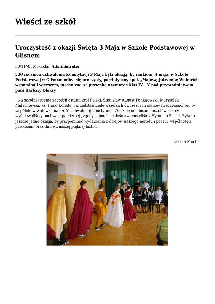 Wieści ze szkół Uroczystość z okazji Święta 3 Maja w Szkole Podstawowej w Glisnem 30/11/-0001, dodał: Administrator 220 rocznica uchwalenia Konstytucji 3 Maja była okazją, by rankiem, 4 maja, w Szkole Podstawowej w Glisnem odbył się uroczysty, patriotyczny apel. „Majową Jutrzenkę Wolności” wspominali wierszem, inscenizacją i piosenką uczniowie klas IV – V pod przewodnictwem pani Barbary Oleksy . Na szkolnej scenie zagościł ostatni król Polski, Stanisław August Poniatowski, Marszałek Małachowski, ks. Hugo Kołłątaj i przedstawiciele wszelkich ówczesnych stanów Rzeczpospolitej, by wspólnie wiwatować na cześć uchwalonej Konstytucji. Złączonymi głosami uczniów szkoły wyśpiewaliśmy pochwałę pamiętnej „zgody sejmu” a całość uwieńczyliśmy Hymnem Polski. Była to jeszcze jedna okazja, by przypomnieć wydarzenia z dziejów naszego narodu i poczuć wspólnotę z przodkami oraz dumę z naszej pięknej historii. Dorota Mucha
