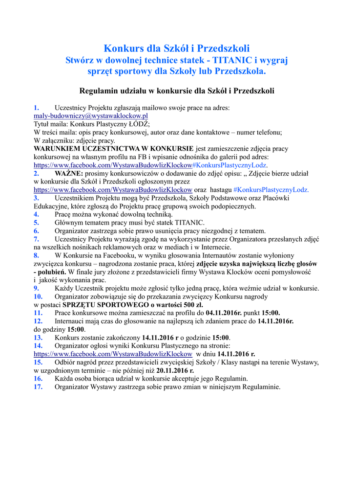Konkurs dla Szkół i Przedszkoli Stwórz w dowolnej technice statek - TITANIC i wygraj sprzęt sportowy dla Szkoły lub Przedszkola. Regulamin udziału w konkursie dla Szkół i Przedszkoli 1. Uczestnicy Projektu zgłaszają mailowo swoje prace na adres: [email protected] Tytuł maila: Konkurs Plastyczny ŁÓDŹ; W treści maila: opis pracy konkursowej, autor oraz dane kontaktowe – numer telefonu; W załączniku: zdjęcie pracy. WARUNKIEM UCZESTNICTWA W KONKURSIE jest zamieszczenie zdjęcia pracy konkursowej na własnym profilu na FB i wpisanie odnośnika do galerii pod adres: https://www.facebook.com/WystawaBudowlizKlockow#KonkursPlastycznyLodz. 2. WAŻNE: prosimy konkursowiczów o dodawanie do zdjęć opisu: „ Zdjęcie bierze udział w konkursie dla Szkół i Przedszkoli ogłoszonym przez https://www.facebook.com/WystawaBudowlizKlockow oraz hastagu #KonkursPlastycznyLodz. 3. Uczestnikiem Projektu mogą być Przedszkola, Szkoły Podstawowe oraz Placówki Edukacyjne, które zgłoszą do Projektu pracę grupową swoich podopiecznych. 4. Pracę można wykonać dowolną techniką. 5. Głównym tematem pracy musi być statek TITANIC. 6. Organizator zastrzega sobie prawo usunięcia pracy niezgodnej z tematem. 7. Uczestnicy Projektu wyrażają zgodę na wykorzystanie przez Organizatora przesłanych zdjęć na wszelkich nośnikach reklamowych oraz w mediach i w Internecie. 8. W Konkursie na Facebooku, w wyniku głosowania Internautów zostanie wyłoniony zwycięzca konkursu – nagrodzona zostanie praca, której zdjęcie uzyska największą liczbę głosów - polubień. W finale jury złożone z przedstawicieli firmy Wystawa Klocków oceni pomysłowość i jakość wykonania prac. 9. Każdy Uczestnik projektu może zgłosić tylko jedną pracę, która weźmie udział w konkursie. 10. Organizator zobowiązuje się do przekazania zwycięzcy Konkursu nagrody w postaci SPRZĘTU SPORTOWEGO o wartości 500 zł. 11. Prace konkursowe można zamieszczać na profilu do 04.11.2016r. punkt 15:00. 12. Internauci mają czas do głosowanie na najlepszą ich zdaniem prace do 14.11.2016r. do godziny 15:00. 13. Konkurs zostanie zakończony 14.11.2016 r o godzinie 15:00. 14. Organizator ogłosi wyniki Konkursu Plastycznego na stronie: https://www.facebook.com/WystawaBudowlizKlockow w dniu 14.11.2016 r. 15. Odbiór nagród przez przedstawicieli zwycięskiej Szkoły / Klasy nastąpi na terenie Wystawy, w uzgodnionym terminie – nie później niż 20.11.2016 r. 16. Każda osoba biorąca udział w konkursie akceptuje jego Regulamin. 17. Organizator Wystawy zastrzega sobie prawo zmian w niniejszym Regulaminie.