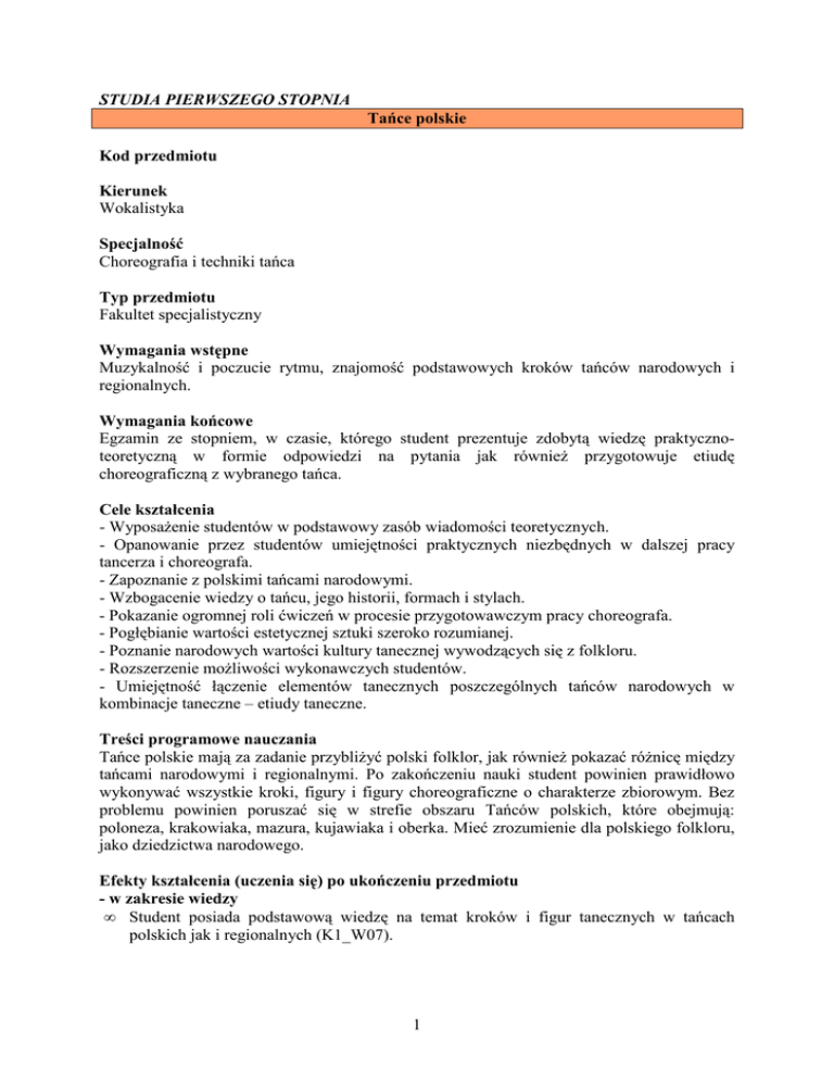 STUDIA PIERWSZEGO STOPNIA Tańce polskie Kod przedmiotu Kierunek Wokalistyka Specjalność Choreografia i techniki tańca Typ przedmiotu Fakultet specjalistyczny Wymagania wstępne Muzykalność i poczucie rytmu, znajomość podstawowych kroków tańców narodowych i regionalnych. Wymagania końcowe Egzamin ze stopniem, w czasie, którego student prezentuje zdobytą wiedzę praktycznoteoretyczną w formie odpowiedzi na pytania jak również przygotowuje etiudę choreograficzną z wybranego tańca. Cele kształcenia - Wyposażenie studentów w podstawowy zasób wiadomości teoretycznych. - Opanowanie przez studentów umiejętności praktycznych niezbędnych w dalszej pracy tancerza i choreografa. - Zapoznanie z polskimi tańcami narodowymi. - Wzbogacenie wiedzy o tańcu, jego historii, formach i stylach. - Pokazanie ogromnej roli ćwiczeń w procesie przygotowawczym pracy choreografa. - Pogłębianie wartości estetycznej sztuki szeroko rozumianej. - Poznanie narodowych wartości kultury tanecznej wywodzących się z folkloru. - Rozszerzenie możliwości wykonawczych studentów. - Umiejętność łączenie elementów tanecznych poszczególnych tańców narodowych w kombinacje taneczne – etiudy taneczne. Treści programowe nauczania Tańce polskie mają za zadanie przybliżyć polski folklor, jak również pokazać różnicę między tańcami narodowymi i regionalnymi. Po zakończeniu nauki student powinien prawidłowo wykonywać wszystkie kroki, figury i figury choreograficzne o charakterze zbiorowym. Bez problemu powinien poruszać się w strefie obszaru Tańców polskich, które obejmują: poloneza, krakowiaka, mazura, kujawiaka i oberka. Mieć zrozumienie dla polskiego folkloru, jako dziedzictwa narodowego. Efekty kształcenia (uczenia się) po ukończeniu przedmiotu - w zakresie wiedzy • Student posiada podstawową wiedzę na temat kroków i figur tanecznych w tańcach polskich jak i regionalnych (K1_W07). 1 Metody nauczania Ćwiczenia grupowe, które w efekcie doskonalą tancerza w przekazywani różnych form i rodzajów tańców polskich i regionalnych. Powtarzanie kroków, figur aż do zadowalającej formy przekazu tego stylu tańca przez studenta. Nakład pracy studenta potrzebny do osiągnięcia efektów uczenia się ROK SEMESTR I 1 Punkty ECTS Ilość godzin w semestrze Rodzaj zaliczenia LEGENDA II 2 III 3 4 4 4 24 24 zs zs 5 6 zal – zaliczony; zs – zaliczenie ze stopniem; egz – egzamin; ed – egzamin dyplomowy Kryteria oceny - Poziom wiedzy teoretycznej. - Umiejętność przekazania zdobytej wiedzy niezbędnej do dalszego rozwoju osobowości tancerza. - Jakość prezentacji kompozycji tanecznych. - Umiejętności połączenia elementów tanecznych w poszczególnych tańcach. - Ocena etiud tanecznych. Literatura (piśmiennictwo) Cz. Sroka ,,Polskie tańce narodowe systematyka” Centralny Ośrodek Metodyki Upowszechniania Kultury Warszawa 1990. G. Dąbrowska ,,Tańcujże dobrze” Wydawnictwo Szkolne i Pedagogiczne Warszawa 1991. G. W. Dąbrowska ,,Taniec w polskiej tradycji leksykon” Muza S.A. Warszawa 2005/2006. Zofia Majewiczowi ,,Krakowiak” Wydawnictwo Głównego Komitetu Kultury Fizycznej Warszawa 1951. J. Pudełek ,,Polskie tańce narodowe na scenie” Wydawnictwo Centralnego Ośrodka Upowszechniania Kultury Warszawa 1980. J. Hryniewiecka ,,5 tańców polskich” Centralny Ośrodek Metodyki Upowszechniania Kultury Warszawa 1990. S. Gadomski ,,Strój ludowy w Polsce” Fundacja Kultury Wsi Warszawa 1989. Język wykładowy Polski Imię i nazwisko wykładowcy mgr Małgorzata Włoczkowska 2