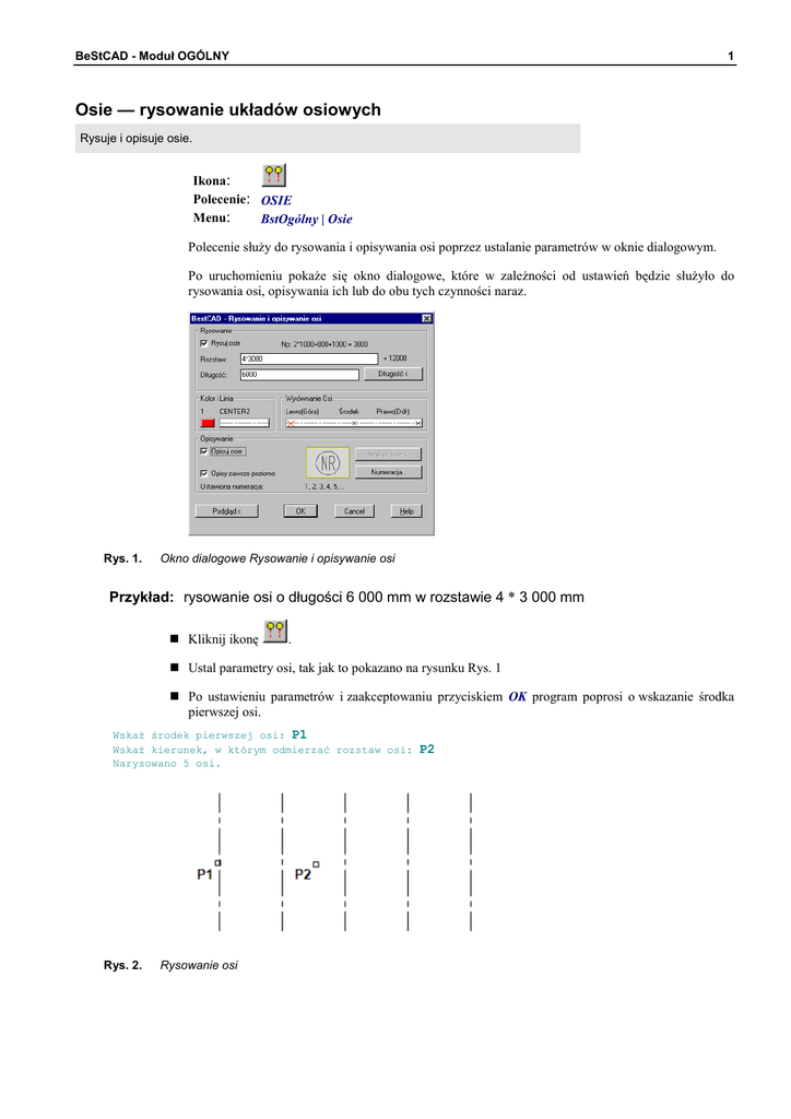 BeStCAD - Moduł OGÓLNY 1 Osie — rysowanie układów osiowych Rysuje i opisuje osie. Ikona: Polecenie: OSIE Menu: BstOgólny | Osie Polecenie służy do rysowania i opisywania osi poprzez ustalanie parametrów w oknie dialogowym. Po uruchomieniu pokaże się okno dialogowe, które w zależności od ustawień będzie służyło do rysowania osi, opisywania ich lub do obu tych czynności naraz. Rys. 1. Okno dialogowe Rysowanie i opisywanie osi Przykład: rysowanie osi o długości 6 000 mm w rozstawie 4 * 3 000 mm n Kliknij ikonę . n Ustal parametry osi, tak jak to pokazano na rysunku Rys. 1 n Po ustawieniu parametrów i zaakceptowaniu przyciskiem OK program poprosi o wskazanie środka pierwszej osi. Wskaż środek pierwszej osi: P1 Wskaż kierunek, w którym odmierzać rozstaw osi: Narysowano 5 osi. Rys. 2. Rysowanie osi P2 BeStCAD - Moduł OGÓLNY 2 Przykład: opisywanie osi n Kliknij ikonę Rys. 3. . Okno dialogowe Rysowanie i opisywania osi n Wyłącz opcję Rysuj osie (A), a następnie włącz Opisuj osie (B). n W celu wybrania osi do opisu kliknij przycisk Wskaż osie<. Po wyjściu z okna program poprosi o wskazanie pierwszej osi do opisu. Wskaż pierwszą oś do opisu: Wskaż miejsce na opisy: P2 Opisano 5 osi. Rys. 4. P1 Opisywanie osi Poniżej opisano szczegółowo okno Rysowanie i opisywanie osi. Opis okna Rysowanie i opisywanie osi Wycinek Opis Rysowanie Rysowanie osi odbywa się poprzez wpisanie w polu dialogowym Rozstaw odległości pomiędzy osiami oraz w polu Długość — długości osi. Możliwe jest wpisanie wielokrotności rozstawu, np. 3 * 5 000, oraz dodawanie rozstawów nie powtarzających się, np. 2 000 + 3 000 + 4 000. Długość osi można podać także z rysunku, włączając przycisk Długość<. BeStCAD - Moduł OGÓLNY 3 Wycinek Opis Opisywanie Opisywanie osi odbywa się automatycznie, bezpośrednio po narysowaniu osi za pomocą okna dialogowego. Można także numerować osie uprzednio narysowane. W tym przypadku po uruchomieniu okna dialogowego należy wybrać linie do numerowania, włączając przycisk Wskaż osie<. Sposób numerowania osi ustalany jest w dodatkowym oknie, wyświetlanym po włączeniu przycisku Numeracja<. Można numerować osie cyframi arabskimi, rzymskimi, a także dużymi i małymi literami. Kolor i Linia Można wybrać kolor i typ linii. Parametry te ustalane są w oknach dialogowych, otwieranych po kliknięciu odpowiednich piktogramów. Wyrównanie Osi Punkt wyrównania ustala się na pierwszej rysowanej osi. Domyślnie ustalone jest wyrównanie Lewy(Góra), które oznacza punkt z lewej strony dla osi rysowanych w poziomie, a punkt górny — dla osi rysowanych w pionie.