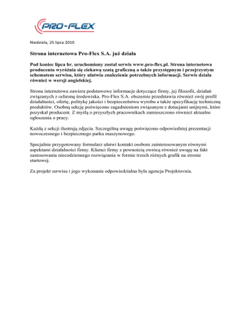 Niedziela, 25 lipca 2010 Strona internetowa Pro-Flex S.A. już działa Pod koniec lipca br. uruchomiony został serwis www.pro-flex.pl. Strona internetowa producenta wyróżnia się ciekawą szatą graficzną a także przystępnym i przejrzystym schematem serwisu, który ułatwia znalezienie potrzebnych informacji. Serwis działa również w wersji angielskiej. Strona internetowa zawiera podstawowe informacje dotyczące firmy, jej filozofii, działań związanych z ochroną środowiska. Pro-Flex S.A. obszernie przedstawia również swój profil działalności, ofertę, politykę jakości i bezpieczeństwa wyrobu a także specyfikację techniczną produktów. Osobną sekcję poświęcono zagadnieniom związanym z dotacjami unijnymi, które pozyskał producent. Z myślą o przyszłych pracownikach zamieszczono również aktualne ogłoszenia o pracy. Każdą z sekcji ilustrują zdjęcia. Szczególną uwagę poświęcono odpowiedniej prezentacji nowoczesnego i bezpiecznego parku maszynowego. Specjalnie przygotowany formularz ułatwi kontakt osobom zainteresowanym równymi aspektami działalności firmy. Klienci firmy z pewnością zwrócą również uwagę na fakt zastosowania niecodziennego rozwiązania w formie trzech różnych grafik na stronie startowej. Za projekt serwisu i jego wykonanie odpowiedzialna była agencja Projektovnia.