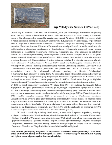 mjr Władysław Siemek (1897-1940) Urodził się 17 czerwca 1897 roku we Wrzawach, jako syn Wincentego, kierownika miejscowej szkoły ludowej i Laury z domu Hietl. W latach 1909-1916 uczęszczał do szkoły realnej w Krakowie, potem w Tarnobrzegu, gdzie uzyskał świadectwo dojrzałości. W latach 1911-1914 brał czynny udział w ruchu harcerskim należąc do I Drużyny Skautów im. T. Kościuszki w Tarnobrzegu. W początkach 1914 r. wspólnie z Franciszkiem Boczkiem z Wielowsi, który był dowódcą jednego z dwóch plutonów I Drużyny Skautów i Zenonem Karakiewiczem, nawiązali kontakt z polską młodzieżą niepodległościową gimnazjum rosyjskiego w Sandomierzu. Kilkakrotnie przewoził przez granicę podręczniki o charakterze wojskowym, instrukcje, regulaminy itp., oraz amunicję do szkolnych strzelań. Na podstawie powszechnej mobilizacji został powołany dnia 1 sierpnia 1916 r. do 17. pułku obrony krajowej. Ukończył szkołę podoficerską i kilka kursów. Brał udział w ochronie wybrzeża w rejonie Raguzy pod Dubrownikiem. I wojnę światową zakończył w stopniu chorążego jako dowódca plutonu w 17. pułku strzelców. W maju 1920 r. został przydzielony, jako referent do Dowództwa Etapów na Ukrainie i Polskiej Ekspozytury przy Rządzie Ukraińskiej Republiki Ludowej.W 1921 r. awansowany został do stopnia porucznika. Od października 1923 r. do lutego 1924 r. był uczestnikiem kursu dla młodszych oficerów piechoty w Szkole Podchorążych w Warszawie. Kurs ukończył z oceną dobrą. W listopadzie tegoż roku został odkomenderowany do Oficerskiej Szkoły Topograficznej przy Wojskowym Instytucie Geograficznym w Warszawie, którą ukończył we wrześniu 1926 r. i został przydzielony do WIG-u. Pełnił różne funkcje w Wydziale Kartograficznym i Topograficznym. Jako topograf wyróżniał się sumiennością i pracowitością. W 1930 r. został mianowany kapitanem. W latach 1932-1934 był zastępcą komendanta Szkoły Topografów. W opinii przełożonych uważany go za jednego z najlepszych topografów w WIG-u. W 1935 r. ukończył 2-miesięczny kurs informacyjno-wywiadowczy przy Oddziale II Sztabu Głównego, po czym wyznaczony został na adiutanta i oficera informacyjnego WIG-u. Funkcję tę pełnił do 1939 roku.Na początku września 1939 r. ewakuował się wraz z Wojskowym Instytutem Geograficznym do Lwowa, gdzie prawdopodobnie uczestniczył w obronie miasta. Po oddaniu miasta w ręce sowieckie został internowany i osadzony w obozie w Kozielsku. W kwietniu 1940 roku zamordowany w Lesie Katyńskim. W trakcie ekshumacji nie został zidentyfikowany. Jego nazwisko znajduje się na liście jeńców wojennych, których NKWD ZSRR przekazało do dyspozycji NKWD w Smoleńsku (lista wywozowa nr 029/1 z 13 kwietnia 1940 r. poz. 26). W 1925 r. ożenił się z Heleną Grądkiewicz, z którą miał 3 synów: Bogusława, zmarłego w piątym miesiącu życia, Wiesława, który jako siedemnastolatek zginął w Powstaniu Warszawskim i Stefana. Mieszkał w Warszawie przy ulicy 6 sierpnia. W chwilach wolnych od pracy uprawiał sport – pływanie, wioślarstwo i jazdę na rowerze. Mjr W. Siemek był odznaczony: Krzyżem Walecznych – trzykrotnie, Srebrnym Krzyżem Zasługi, Medalem Pamiątkowym za Wojnę 1918-21, Srebrnym i Brązowym Medalem za Długoletnią Służbę oraz Medalem Niepodległości. Dąb pamięci, poświęcony majorowi Władysławowi Siemkowi został posadzony 15.10.2009r. przed budynkiem Szkoły Podstawowej im. ks. Jana Twardowskiego w Sokolnikach. Opiekę nad dębem sprawują nauczyciele i uczniowie szkoły.