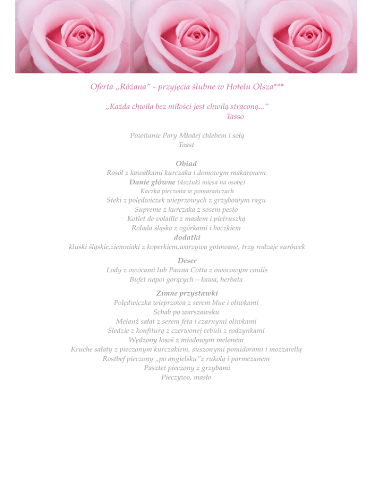 Oferta „Różana” - przyjęcia ślubne w Hotelu Olsza*** „Każda chwila bez miłości jest chwilą straconą...” Tasso Powitanie Pary Młodej chlebem i solą Toast Obiad Rosół z kawałkami kurczaka i domowym makaronem Danie główne (4sztuki mięsa na osobę) Kaczka pieczona w pomarańczach Steki z polędwiczek wieprzowych z grzybowym ragu Supreme z kurczaka z sosem pesto Kotlet de volaille z masłem i pietruszką Rolada śląska z ogórkami i boczkiem dodatki kluski śląskie,ziemniaki z koperkiem,warzywa gotowane, trzy rodzaje surówek Deser Lody z owocami lub Panna Cotta z owocowym coulis Bufet napoi gorących – kawa, herbata Zimne przystawki Polędwiczka wieprzowa z serem blue i oliwkami Schab po warszawsku Melanż sałat z serem feta i czarnymi oliwkami Śledzie z konfiturą z czerwonej cebuli z rodzynkami Wędzony łosoś z miodowym melonem Kruche sałaty z pieczonym kurczakiem, suszonymi pomidorami i mozzarellą Rostbef pieczony „po angielsku”z rukolą i parmezanem Pasztet pieczony z grzybami Pieczywo, masło Dania gorące Kolacja I podana przed północą Filet z dorsza w chrupiącym cieście cytrynowym Eskalopki wieprzowe w sosie z zielonego pieprzu Pierś z kurczaka z sosem pomidorowym złote ziemniaki, młode kalafiory z masłem Kolacja II podana przed północą Węgierski bogracz Kolacja III podana po północy Mini golonki z kapustą Filet z kurczaka z grillowanymi warzywami i sosem balsamicznym Frytki Steak - Hause Kolacja IV podana nad ranem Barszcz czerwony z diablotką Cudownie widzieć się jeszcze raz... Poprawiny (czas trwania 5 godzin) „Wolę jedno życie z Tobą niż samotność przez wszystkie ery tego świata ...” J.R.R. Tolkien Obiad Wielkopolski żurek z grzybami Danie główne Rolada z indyka w białym sosie pieczarkowym ziemniaki gotowane z koperkiem surówki Bufet napoi gorących – kawa, herbata Kolacja gorąca Gulasz wieprzowy z placuszkami ziemniaczanymi Cena 195zł/osoba Oferta uzupełniająca Tort ślubny 9zł/porcja Ciasta z zaprzyjaźnionej cukierni 7zł/porcja na dwa dni Wina od 30zł/butelka Wódki czyste od 25zł/butelka Szampan na powitanie od 15zł/butelka Soki 6zł/1l Woda mineralna z cytryną i miętą 3zł/1l Coca -Cola, Pepsi, Fanta, Sprite, Mirinda 7zł/1l Owoce sezonowe obrane i filetowane 7zł/osoba – 1 dzień, 10zł/osoba – 2dnia Paczki z ciastem dla Gości – od 12zł/osoba Opłata za obsługę alkoholu i napoi – 800zł Nocleg w pokoju jednoosobowym – 120zł (bez śniadania) Nocleg w pokoju dwuosobowym 150zł (bez śniadania) Śniadanie dla Gości 17zł Wynajem pokrowców na krzesła 8zł/szt. Atrakcje Live Cooking – gotowanie przy Gościach Wspaniała kulinarna atrakcja, podczas której goście mają możliwość zapoznania się z naszymi kucharzami, zapytania o formę przygotowywania potraw i oczywiście spróbowania Polędwiczek wieprzowych flambirowanych żubrówką, Krewetek w delikatnej emulsji maślanej Rydzy smażonych z masłem i ziołami Cena za osobę od 45zł Pięknie oświetlony Drink- Bar z kolorowymi koktajlami Profesjonalna obsługa barmańska Fantazyjnie udekorowane drinki świeżymi owocami Super zabawa! Cena za osobę od 35zł Stacja Sushi Sushi przygotowywane „na oczach” Gości Cena za osobę od 35zł „Danie Szefa Kuchni” Pieczony udziec wieprzowy z sosem z grzybami Kaczki nadziewane watróbką i jabłkami Ryby pieczone w całości lub indyk z sosem Cumberland pieczone w łupinkach ziemniaki, pikle i marynaty, kasza , kapusta modra Cena od 35zł/osoba Gościna „W Olszy” - stół z lokalnymi wędlinami i serami Cena za osobę od 15zł/1dzień, od 18zł/dwa dni Słodki Stół Bajkowo zaaranżowane słodkie niespodzianki ciasta, ciasteczka, muffinki, babeczki, ptysie, eklerki,owoce, koktajle owocowe wspaniała atrakcja dla dorosłych i dzieci... Cena za osobę od 15zł Fontanna czekoladowa z owocami i łakociami Cena za osobę od 10zł Fontanna alkoholowa z ponczem lub orzeźwiającym koktajlem Cena za osobę od 15zł Animator dla dzieci Cena od 100zł za godzinę Pokaz sztucznych ogni Cena od 2500zł Lub każde inna atrakcja, o której Państwo marzą... Serdecznie zapraszam Szymańska Milena Manager Hotelu Olsza*** telefon 539 372 981 [email protected], www.hotelolsza.pl